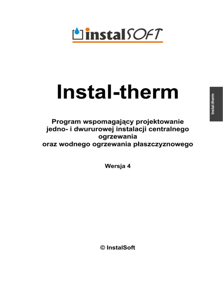 Instal-therm Program wspomagający projektowanie jedno- i dwururowej instalacji centralnego ogrzewania oraz wodnego ogrzewania płaszczyznowego Wersja 4 © InstalSoft Instal-therm Rev. 2006-07- 17 http://www.instalsoft.com.pl; E-mail: [email protected] Znaki handlowe: InstalSoft, InstalSystem, Gredi, OZC są zastrzeżonymi znakami handlowymi firmy InstalSoft s.c. lub jej właścicieli. Adobe oraz Acrobat są znakami handlowymi firmy Adobe Systems Incorporated. AutoCAD jest zastrzeżonym znakiem handlowym firmy Autodesk, Inc. Microsoft jest zastrzeżonym znakiem firmy Microsoft Corporation. Nazwy produktów z dziedziny instalacji są w niniejszej instrukcji użyte wyłącznie w celach ilustracyjnych i nie stanowią rekomendacji dla konkretnych zastosowań ani gwarancji występowania w katalogach programu. Zawartość instrukcji nie musi odpowiadać aktualnej funkcjonalności i wyglądowi programów Spis treści: 1. WSTĘP ............................................................................................................... 1 1.1. 1.2. 1.3. 1.4. 1.5. 1.6. PRZEZNACZENIE I ZAKRES MOŻLIWOŚCI PROGRAMU ........................................... 1 WSPÓŁPRACA Z INNYMI PROGRAMAMI PAKIETU INSTALSYSTEM............................ 2 WSPÓŁPRACA Z INNYMI APLIKACJAMI INŻYNIERSKIMI ........................................... 3 UKŁAD NINIEJSZEJ INSTRUKCJI .......................................................................... 4 STOSOWANE OZNACZENIA................................................................................. 4 TERMINOLOGIA I SKRÓTY W PROGRAMIE............................................................. 5 2. SKRÓCONY OPIS ETAPÓW TWORZENIA TYPOWYCH PROJEKTÓW......... 9 Instal-therm 2.1. WPROWADZENIE .............................................................................................. 9 2.2. TYPOWE SCENARIUSZE PRACY I ZALECANE KROKI ICH REALIZACJI ........................ 9 2.2.1. Projekt ogrzewania grzejnikowego z obliczeniem strat ciepła budynku, rzuty kondygnacji dostępne i wymagane w dokumentacji rysunkowej......................................................................................... 9 2.2.2. Projekt ogrzewania grzejnikowego na rozwinięciu z obliczeniem strat ciepła budynku, rzuty kondygnacji nie wymagane w dokumentacji rysunkowej................................................................. 10 2.2.3. Projekt ogrzewania grzejnikowego na rozwinięciu bez obliczeń strat ciepła budynku, rzuty kondygnacji nie wymagane w dokumentacji rysunkowej................................................................. 11 2.2.4. Projekt wstępny ogrzewania podłogowego...................................... 11 2.2.5. Projekt ogrzewania podłogowego z obliczeniem strat ciepła budynku i pełną dokumentacją rysunkową ...................................... 12 2.2.6. Projekt ogrzewania podłogowego i grzejnikowego .......................... 13 2.3. UTWORZENIE RZUTÓW KONDYGNACJI JAKO PODKŁADU DO PROJEKTU ................ 14 2.3.1. Rysowanie rzutu kondygnacji w programie...................................... 14 2.3.2. Import rzutu z pliku DWG/DXF......................................................... 17 2.4. PROJEKT OGRZEWANIA PODŁOGOWEGO (NA RZUTACH)..................................... 19 2.4.1. Etapy tworzenia projektu ................................................................. 19 2.4.2. Utworzenie nowego projektu............................................................ 20 2.4.3. Uzupełnienie danych pomieszczeń.................................................. 21 2.4.4. Edycja instalacji ogrzewania podłogowego...................................... 21 2.4.5. Diagnostyka danych ........................................................................ 25 2.4.6. Wyznaczenie temperatury zasilania ................................................ 26 2.4.7. Analiza wyników i komunikatów obliczeń......................................... 26 2.4.8. Korekta danych, dzielenie PG, rysowanie przyłączy ....................... 27 2.4.9. Analiza kompletnych wyników i wydruk projektu ............................. 31 2.5. PROJEKT OGRZEWANIA GRZEJNIKOWEGO (NA RZUTACH I ROZWINIĘCIU) ............. 32 2.5.1. Etapy tworzenia projektu ................................................................. 33 2.5.2. Utworzenie i skonfigurowanie projektu ............................................ 33 2.5.3. Wprowadzenie grzejników i planu sieci rozdzielczej........................ 34 2.5.4. Utworzenie i edycja arkusza rozwinięcia instalacji........................... 35 2.5.5. Korzystanie z automatycznych rozwinięć instalacji.......................... 37 2.5.6. Skojarzenie odbiorników i działek (oryginały – cienie)..................... 38 2.5.7. Uzupełnienie danych i określenie typów elementów........................ 39 2.5.8. Ustalenie opcji obliczeń, diagnostyka i wykonanie obliczeń ............ 40 2.5.9. Analiza kompletnych wyników i wydruk projektu ............................. 42 I Wstęp 1. WSTĘP 1.1. Przeznaczenie i zakres możliwości programu Kompleksowe obliczenia instalacji obejmują: - dobór średnic rur i armatury, w tym również obliczanie instalacji o częściowo lub całkowicie narzuconych średnicach, - automatyczny dobór wszystkich złączek i kształtek niezbędnych do zrealizowania wynikającej ze schematów struktury połączeń i geometrii sieci oraz połączeń z armaturą i odbiornikami, - regulację nastawczą sieci, do czego mogą być użyte zawory grzejnikowe i podpionowe z nastawą wstępną, regulatory różnicy ciśnień lub przepływu, a także kryzy dławiące, - dobór wymaganej wysokości podnoszenia pomp umiejscowionych na działkach lub w układach mieszających, - dobór izolacji rurociągów, - cieplne i hydrauliczne obliczenia płaszczyzn grzejnych ogrzewania podłogowego lub ściennego wg EN 1264 z automatycznym doborem optymalnej temperatury zasilania obwodów, - podział pętli ogrzewania płasz