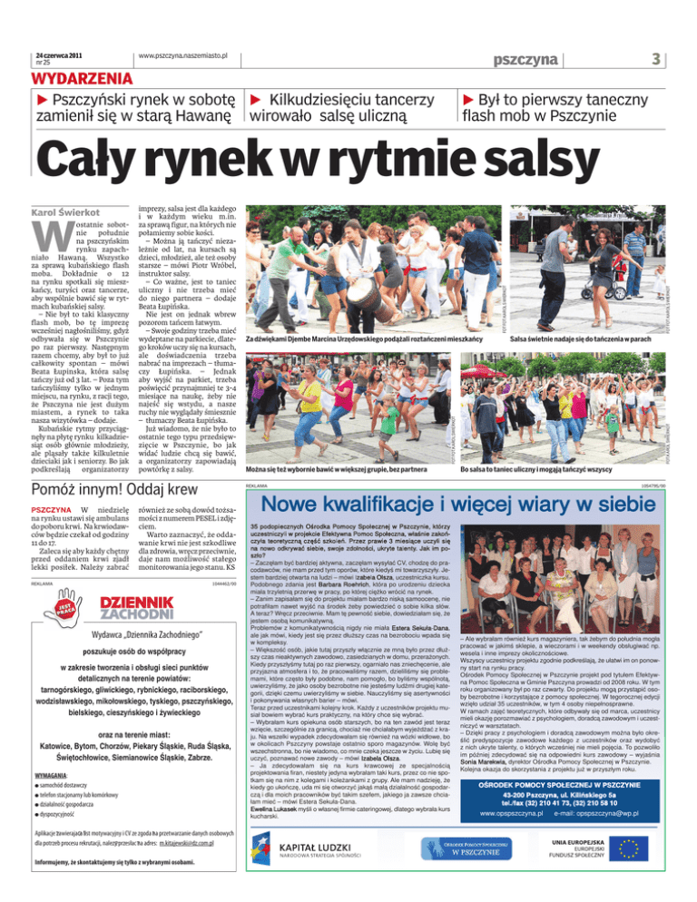 24 czerwca 2011 nr 25 3 pszczyna www.pszczyna.naszemiasto.pl WYDARZENIA b Pszczyński rynek w sobotę b Kilkudziesięciu tancerzy zamienił się w starą Hawanę wirowało salsę uliczną b Był to pierwszy taneczny flash mob w Pszczynie Pomóż innym! Oddaj krew PSZCZYNA W niedzielę na rynku ustawi się ambulans do poboru krwi. Na krwiodawców będzie czekał od godziny 11 do 17. Zaleca się aby każdy chętny przed oddaniem krwi zjadł lekki posiłek. Należy zabrać 1044462/00 Wydawca „Dziennika Zachodniego” poszukuje osób do współpracy w zakresie tworzenia i obsługi sieci punktów detalicznych na terenie powiatów: tarnogórskiego, gliwickiego, rybnickiego, raciborskiego, wodzisławskiego, mikołowskiego, tyskiego, pszczyńskiego, bielskiego, cieszyńskiego i żywieckiego oraz na terenie miast: Katowice, Bytom, Chorzów, Piekary Śląskie, Ruda Śląska, Świętochłowice, Siemianowice Śląskie, Zabrze. WYMAGANIA: • samochód dostawczy • telefon stacjonarny lub komórkowy • działalność gospodarcza • dyspozycyjność Aplikacje?zawieraja? ca?list motywacyjny i CV ze zgoda?na przetwarzanie danych osobowych dla potrzeb procesu rekrutacji, nalez? y przesłac?na adres: [email protected] Informujemy, że skontaktujemy się tylko z wybranymi osobami. FOTFOT.KAROLSWIERKOT Salsa świetnie nadaje się do tańczenia w parach Można się też wybornie bawić w większej grupie, bez partnera Bo salsa to taniec uliczny i mogąją tańczyć wszyscy REKLAMA również ze sobą dowód tożsamości z numerem PESEL i zdjęciem. Warto zaznaczyć, że oddawanie krwi nie jest szkodliwe dla zdrowia, wręcz przeciwnie, daje nam możliwość stałego monitorowania jego stanu. KS REKLAMA Za dźwiękami Djembe Marcina Urzędowskiego podążali roztańczeni mieszkańcy FOT.KAROLSWIERKOT W ostatnie sobotnie południe na pszczyńskim rynku zapachniało Hawaną. Wszystko za sprawą kubańskiego flash moba. Dokładnie o 12 na rynku spotkali się mieszkańcy, turyści oraz tancerze, aby wspólnie bawić się w rytmach kubańskiej salsy. – Nie był to taki klasyczny flash mob, bo tę imprezę wcześniej nagłośniliśmy, gdyż odbywała się w Pszczynie po raz pierwszy. Następnym razem chcemy, aby był to już całkowity spontan – mówi Beata Łupinska, która salsę tańczy już od 3 lat. – Poza tym tańczyliśmy tylko w jednym miejscu, na rynku, z racji tego, że Pszczyna nie jest dużym miastem, a rynek to taka nasza wizytówka – dodaje. Kubańskie rytmy przyciągnęły na płytę rynku kilkadziesiąt osób głównie młodzieży, ale pląsały także kilkuletnie dzieciaki jak i seniorzy. Bo jak podkreślają organizatorzy imprezy, salsa jest dla każdego i w każdym wieku m.in. za sprawą figur, na których nie połamiemy sobie kości. – Można ją tańczyć niezależnie od lat, na kursach są dzieci, młodzież, ale też osoby starsze – mówi Piotr Wróbel, instruktor salsy. – Co ważne, jest to taniec uliczny i nie trzeba mieć do niego partnera – dodaje Beata Łupińska. Nie jest on jednak wbrew pozorom tańcem łatwym. – Swoje godziny trzeba mieć wydeptane na parkiecie, dlatego kroków uczy się na kursach, ale doświadczenia trzeba nabrać na imprezach – tłumaczy Łupińska. – Jednak aby wyjść na parkiet, trzeba poświęcić przynajmniej te 3-4 miesiące na naukę, żeby nie najeść się wstydu, a nasze ruchy nie wyglądały śmiesznie – tłumaczy Beata Łupińska. Już wiadomo, że nie było to ostatnie tego typu przedsięwzięcie w Pszczynie, bo jak widać ludzie chcą się bawić, a organizatorzy zapowiadają powtórkę z salsy. FOTFOT.KAROLSWIERKOT Karol Świerkot FOTFOT.KAROLSWIERKOT Cały rynek w rytmie salsy – Zaczęłam być bardziej aktywna, zaczęłam wysyłać CV, chodzę do pracodawców, nie mam przed tym oporów, które kiedyś mi towarzyszyły. Jestem bardziej otwarta na ludzi – mówi , uczestniczka kursu. Podobnego zdania jest , która po urodzeniu dziecka miała trzyletnią przerwę w pracy, po której ciężko wrócić na rynek. – Zanim zapisałam się do projektu miałam bardzo niską samoocenę, nie potrafiłam nawet wyjść na środek żeby powiedzieć o sobie kilka słów. A teraz? Wręcz przeciwnie. Mam tę pewność siebie, dowiedziałam się, że jestem osobą komunikatywną. , Problemów z komunikatywnością nigdy nie miała ale jak mówi, kiedy jest się przez dłuższy czas na bezrobociu wpada się w kompleksy. – Większość osób, jakie tutaj przyszły włącznie ze mną było przez dłuższy czas nieaktywnych zawodowo, zasiedzianych w domu, przerażonych. Kiedy przyszłyśmy tutaj po raz pierwszy, ogarniało nas zniechęcenie, ale przyjazna atmosfera i to, że pracowaliśmy razem, dzieliliśmy się problemami, które często były podobne, nam pomogło, bo byliśmy wspólnotą, uwierzyliśmy, że jako osoby bezrobotne nie jesteśmy ludźmi drugiej kategorii, dzięki czemu uwierzyliśmy w siebie. Nauczyliśmy się asertywności i pokonywania własnych barier – mówi. Teraz przed uczestnikami kolejny krok. Każdy z uczestników projektu musiał bowiem wybrać kurs praktyczny, na który chce się wybrać. – Wybrałam kurs opiekuna osób starszych, bo na ten zawód jest teraz wzięcie, szczególnie za granicą, chociaż nie chciałabym wyjeżdżać z kraju. Na wszelki wypadek zdecydowałam się również na wózki widłowe, bo w okolicach Pszczyny powstaje ostatnio sporo magazynów. Wolę być wszechstronna, bo nie wiadomo, co mnie czeka jeszcze w życiu. Lubię się uczyć, poznawać nowe zawody – mówi . – Ja zdecydowałam się na kurs krawcowej ze specjalnością projektowania firan, niestety jedyna wybrałam taki kurs, przez co nie spotkam się na nim z kolegami i koleżankami z grupy. Ale mam nadzieję, że kiedy go ukończę, uda mi się otworzyć jakąś małą działalność gospodarczą i dla moich pracowników być takim szefem, jakiego ja zawsze chciałam mieć – mówi Estera Sekuła-Dana. myśli o własne
