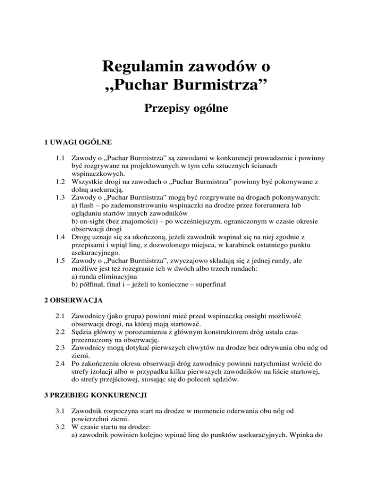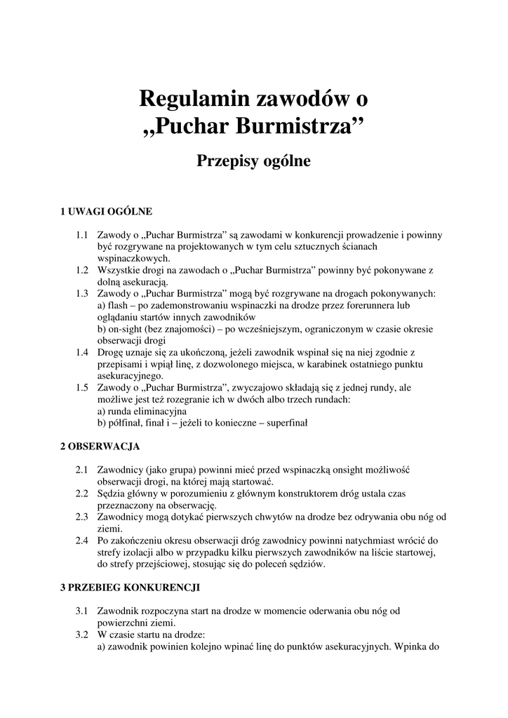 Regulamin zawodów o „Puchar Burmistrza” Przepisy ogólne 1 UWAGI OGÓLNE 1.1 Zawody o „Puchar Burmistrza” są zawodami w konkurencji prowadzenie i powinny być rozgrywane na projektowanych w tym celu sztucznych ścianach wspinaczkowych. 1.2 Wszystkie drogi na zawodach o „Puchar Burmistrza” powinny być pokonywane z dolną asekuracją. 1.3 Zawody o „Puchar Burmistrza” mogą być rozgrywane na drogach pokonywanych: a) flash – po zademonstrowaniu wspinaczki na drodze przez forerunnera lub oglądaniu startów innych zawodników b) on-sight (bez znajomości) – po wcześniejszym, ograniczonym w czasie okresie obserwacji drogi 1.4 Drogę uznaje się za ukończoną, jeżeli zawodnik wspinał się na niej zgodnie z przepisami i wpiął linę, z dozwolonego miejsca, w karabinek ostatniego punktu asekuracyjnego. 1.5 Zawody o „Puchar Burmistrza”, zwyczajowo składają się z jednej rundy, ale możliwe jest też rozegranie ich w dwóch albo trzech rundach: a) runda eliminacyjna b) półfinał, finał i – jeżeli to konieczne – superfinał 2 OBSERWACJA 2.1 Zawodnicy (jako grupa) powinni mieć przed wspinaczką onsight możliwość obserwacji drogi, na której mają startować. 2.2 Sędzia główny w porozumieniu z głównym konstruktorem dróg ustala czas przeznaczony na obserwację. 2.3 Zawodnicy mogą dotykać pierwszych chwytów na drodze bez odrywania obu nóg od ziemi. 2.4 Po zakończeniu okresu obserwacji dróg zawodnicy powinni natychmiast wrócić do strefy izolacji albo w przypadku kilku pierwszych zawodników na liście startowej, do strefy przejściowej, stosując się do poleceń sędziów. 3 PRZEBIEG KONKURENCJI 3.1 Zawodnik rozpoczyna start na drodze w momencie oderwania obu nóg od powierzchni ziemi. 3.2 W czasie startu na drodze: a) zawodnik powinien kolejno wpinać linę do punktów asekuracyjnych. Wpinka do punktu asekuracyjnego powinna być wykonana biorąc pod uwagę linię przebiegu drogi, zanim całe ciało wspinacza znajdzie się poza niższym z karabinków punktu asekuracyjnego albo zanim zawodnik znajdzie się w miejscu, z którego w celu wykonania wpinki musiałby się cofnąć. Jako cofnięcie się jest traktowany ruch, w którym zawodnik, zmieniając pierwotną pozycję opuszcza trzymane wcześniej chwyty wykorzystując obie ręce. Każde naruszenie tej zasady powinno skutkować zakończeniem startu i dokonaniem pomiaru wysokości zgodnie z pkt 4.7. W razie odmowy zastosowania się przez zawodnika do polecenia sędziego o zaprzestaniu wspinaczki, zawodnik podlega dyskwalifikacji. b) w szczególnych przypadkach, na przykład ze względów bezpieczeństwa, sędzia główny może zawiesić obowiązywanie pkt 3.2 ust. a i określić, że w dany punkt asekuracyjny lina powinna być wpinana z wyznaczonego chwytu albo wcześniej. Tego rodzaju informacja powinna zostać przekazana zawodnikom w czasie odprawy technicznej w strefie izolacji, a przedmiotowy chwyt i punkt asekuracyjny powinny zostać wyraźnie oznakowane (najlepiej niebieskim) znakiem „X” i wskazane podczas obserwacji drogi. c) w przypadku nieprawidłowego przepięcia liny podczas wykonywania wpinki do punktu asekuracyjnego zgodnie z pkt 3.1 ust. a (tzw. „agrafki”), zawodnik może poprawić sposób wpięcia liny (w razie potrzeby, po zejściu drogą). Ostatecznie lina musi być wpięta do wszystkich miniętych przez zawodnika punktów asekuracyjnych na drodze. Sędzia może zdecydować o zakończeniu startu i pomiarze osiągniętej przez zawodnika wysokości (albo odległości) jeżeli uzna, że kontynuowanie przez zawodnika wspinaczki nie jest zgodne z zasadami bezpieczeństwa. 3.3 O częstości i sposobie czyszczenia chwytów na drodze decyduje sędzia PZA w porozumieniu z głównym konstruktorem dróg przed rozpoczęciem każdej rundy zawodów. Zaleca się, aby czyszczenie chwytów odbywało się nie rzadziej niż co 20 startujących zawodników oraz aby przerwy związane z czyszczeniem były rozłożone równomiernie w przebiegu rundy. Częstość czyszczenia chwytów powinna być oznajmiana zawodnikom w czasie odprawy technicznej w strefie izolacji lub podana na listach startowych wywieszonych w strefie izolacji. Zawodnikom nie wolno czyścić chwytów w czasie startu. 4 INCYDENTY TECHNICZNE 4.1 Incydentami technicznymi w konkurencji prowadzenie są następujące zdarzenia: a) ułamany lub obracający się chwyt, b) nieprawidłowo wiszący ekspres lub karabinek, c) zbyt mocno wybrana lina, pomagająca lub utrudniająca zawodnikowi wspinaczkę, d) inne okoliczności nie będące wynikiem działań zawodnika, mogące mu przeszkodzić lub w sposób niesprawiedliwy pomóc podczas wspinaczki. 4.2 Jeżeli po odpadnięciu zawodnik utrzymuje, że odpadł od ściany w wyniku incydentu technicznego, powinien zostać natychmiast odprowadzony do wydzielonej strefy izolacji i oczekiwać na wynik oceny zdarzenia. 4.3 Po potwierdzonym incydencie technicznym zawodnik powinien mieć możliwość regeneracji po starcie w wydzielonej strefie izolacji, z dostępem do urządzeń służących do rozgrzewki. W tym czasie zawodnik nie może się z nikim kontaktować, z wyjątkiem sędziów i organizatorów. Maksymalny czas regeneracji zawodnika przed podjęciem kolejnej próby na drodze powinien być w przybliżeniu równy dwóm minutom dla każdego chwytu, z którego zawodnik skorzystał na drodze przed incydentem technicznym. Zawodnikowi przysługuje minimum 20-minutowa przerwa na regenerację. O momencie, w którym zawodnik ponownie wystartuje decyduje sędzia PZA, biorąc pod uwagę sugestię zawodnika i maksymalny czas przysługujący na regenerację. O planowanym czasie przystąpienia zawodnika do powtórzonego startu powinni zostać poinformowani wszyscy zainteresowani zawodnicy. W przypadku rundy finałowej zawodów, czas regeneracji nie powinien przekroczyć 20 minut od momentu ukończenia wspinaczki przez ostatniego z zawodników. Jeżeli powtórzony start ma się odbyć po zakończeniu star
