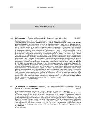 222 FOTOGRAFIE, ALBUMY FOTOGRAFIE, ALBUMY 502. [Warszawa] – Zespół 38 fotografii. K. Brandel. Lata 80. XIX w. 18 000,- Fotografie czarno-białe 21,0 x 27,0 naklejone na karton z epoki 32,0 x 44,0 cm Zespół fotografii ukazujących Warszawę lat 80. XIX w., jej najważniejsze place, ulice, zabytki i nowo wznoszone budynki. Zespół zawiera: targowisko na Sewerynowie, targ za „Żelazną Bramą”, Plac Krasińskich z przebudowanym na cerkiew kościołem pijarów oraz Pałacem Rzeczypospolitej, Rynek Starego Miasta (z istniejącym wówczas targiem), Krakowskie Przedmieście (kilka widoków: z kościołem św. Anny, Hotelem Europejskim, przemarszem Kozaków, kościołem św. Krzyża), Pałac w Wilanowie (od strony dziedzińca i ogrodu oraz wnętrza), ratusz na Placu Teatralnym, Łazienki (pomnik Sobieskiego, Pałac na Wodzie, park, Teatr na Wyspie), kościół św. Anny w Wilanowie, ulica Marszałkowska z Dworcem Wiedeńskim, przystań wioślarska na Wiśle, Park Saski (zimą i latem), Teatr Wielki, Nowy Zjazd (z panoramą Powiśla), Pałac Staszica, kościół ewangelicki (z fragmentem Pałacu Kronenberga), panorama miasta od strony Wisły, Rynek Nowego Miasta, Most Kierbedzia wraz z panoramą Pragi. Fotografie nie sygnowane, na odwrocie opatrzone opisem piórem (w tym na trzech kartonach opisy sfotografowanych osób, być może z rodziny fotografa). Każda z fotografii z bogatym sztafażem – ruch uliczny, przechodnie, spacerujący mieszczanie. Autor fotografii – Konrad Brandel (1838-1920) uznawany jest za jednego z najwybitniejszych polskich fotografów II połowy XIX w. Jego największym osiągnięciem było wynalezienie ok. 1883 r. kamery ręcznej, która umożliwiała robienie szybkich zdjęć. Dzięki temu tzw. „fotorewolwerowi” fotograf mógł dokumentować codzienne życie Warszawy i jej mieszkańców. Artysta, urodzony i wykształcony w Warszawie (uczeń Karola Beyera, współpracownik Marcina Olszyńskiego) był przez całe życie związany w rodzinnym miastem. Przy ul. Nowy Świat prowadził zakład fotograficzny, był także fotografem Uniwersytetu Warszawskiego. Jego fotografie stanowią dziś cenny materiał ikonograficzny do dziejów Warszawy, ukazując wiele nieistniejących już miejsc i budynków. Niewielkie zabrudzenia marginesów, poza tym stan dobry. Obszerny zbiór zdjęć doskonałej jakości, ukazujących nieistniejącą już dziś Warszawę. Bardzo rzadkie. Lit.: D. Kobielski, Warszawa na fotografiach XIX w., Warszawa 1982. (Patrz tablica XXXV oraz ilustracja) ----------------------------------------------503. „Królewicz Jan Kazimierz uwięziony we Francji i dworzanin jego Ellert”. Według szkicu A. Lessera. Po 1855 r. 1200,Fotografia podmalowana ręcznie; 28,7 x 36,5, naklejona na karton 39,5 x 46,2 cm Sygnowana na kompozycji: „A. Lesser”. Fotografia szkicu Aleksandra Lessera (1814-1884), malarza, rysownika, krytyka sztuki. Artysta po studiach na Wydziale Sztuk Pięknych Uniwersytetu Warszawskiego oraz w Dreźnie i Monachium otworzył w Warszawie pracownię malarską. Był wysoko cenionym przez współczesnych malarzem scen historycznych oraz religijnych. Malarz interesował się nową wówczas techniką fotografii, zbierał fotografie, które służyły mu m.in. przy tworzeniu dzieł. Także jego własne prace były często reprodukowane przez fotografów. Szkic do obrazu ukazującego królewicza Jana Kazimierza (więzionego w latach 1638-1640 we Francji pod zarzutem szpiegostwa) powstał około 1855 r., obraz olejny wystawiono w 1879 r. w Towarzystwie Zachęty Sztuk Pięknych. Stan dobry. Rzadkie. (Patrz ilustracja) FOTOGRAFIE, ALBUMY 502. K. Brandel. Warszawa. Zespół 38 fotografii. Lata 80. XIX w. 503. A. Lesser. Królewicz Jan Kazimierz. Po 1855. 223 224 FOTOGRAFIE, ALBUMY 504. A. Szubert. Ambroży Grabowski. 1868. 506. M. Pusch. Henryk Sienkiewicz. Ok. 1885. 504. Grabowski Ambroży (1782-1868), historyk, kolekcjoner, księgarz i antykwariusz, autor przewodników po Krakowie. Kraków [przed 1868]. A. Szubert. Fotografia gabinetowa, 9,1x5,4 cm, naklejana na karton firmowy z epoki (10,5x6,2 cm). 240,Na odwrocie litografowana winieta fotografa krakowskiego Awita Szuberta (1837-1919), czynnego w Krakowie od r. 1867 oraz opis współczesny zdjęcia. Drobne przybrudzenia na odwrocie, stan bardzo dobry. (Patrz ilustracja) 505. Potocki Jerzy (1889-1961), rotmistrz kawalerii WP, dyplomata. Wiedeń [ok.1903]. Atelier Adele. Fotografia gabinetowa 14,8 x 9,8 naklejona na karton firmowy z nadrukami 19,4 x 14 cm. 300,Fotografia J. Potockiego w wieku młodzieńczym, powstała w studio Adeli Perlmutter-Heilperin (18451941), nadwornej fotograficzki cesarskiej (pochodzącej z żydowskiej rodziny ze Złoczowa w Galicji), która była jedyną kobietą noszącą ten tytuł i jedną z pierwszych kobiet mających studio fotograficzne w Europie. W jej atelier wykonano wiele sławnych zdjęć, np. kochanki arcyks. Rudolfa Marii Vetsery oraz przyjaciólki cesarza Katarzyny Schratt. Na odwrocie odręczna dedykacja Potockiego „Kochanemu Panu na pamiątkę Jerzy Potocki w Łańcucie październik 1903“. Jerzy Potocki, syn Romana, trzeciego ordynata na Łańcucie, w 1919 r. attaché wojskowy w Budapeszcie, w latach 1933-1936 ambasador w Ankarze, następnie w Waszyngtonie, po wojnie na emigracji. Stan bardzo dobry. 506. Sienkiewicz Henryk (1846-1916), jeden z największych pisarzy polskich, laureat Nagrody Nobla. Warszawa [ok. 1885]. M. Pusch. Fotografia wizytowa 8,8 x 5,4 cm, naklejana na karton firmowy litografowany (10,5 x 6,2 cm). 200,- FOTOGRAFIE, ALBUMY 225 507. Władysław Sikorski. 1926. Fotografia owalna na papierze z czerwoną ramką. Na awersie nazwa i adres firmowy w Warszawie oraz „dawniej Karoli & Pusch” (fotografia wykonana ok. 1885 r., wydana ponownie przez samodzielnie działającego od 1892 r. M. Puscha). Drobne przybrudzenia, poza tym stan bardzo dobry. (Patrz ilustracja) 507. Sikorski Władysław (1881-1943), ówczesny generał dywizji Wojs