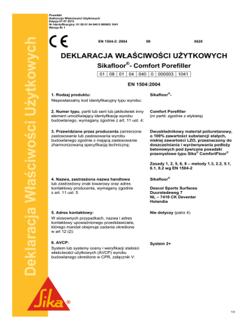 Deklaracja Właściwości Użytkowych Posadzki Deklaracja Właściwości Użytkowych Edycja 01 07 2013 Nr identyfikacyjny: 01 08 01 04 040 0 000003 1041 Wersja Nr 1 EN 1504-2: 2004 09 0620 DEKLARACJA WŁAŚCIWOŚCI UŻYTKOWYCH Sikafloor®- Comfort Porefiller 01 08 01 04 040 0 000003 1041 EN 1504:2004 1. Rodzaj produktu: Niepowtarzalny kod identyfikacyjny typu wyrobu: ® Sikafloor - 2. Numer typu, partii lub serii lub jakikolwiek inny element umożliwiający identyfikację wyrobu budowlanego, wymagany zgodnie z art. 11 ust. 4: Comfort Porefiller (nr partii: zgodnie z etykietą) 3. Przewidziane przez producenta zamierzone zastosowanie lub zastosowania wyrobu budowlanego zgodnie z mającą zastosowanie zharmonizowaną specyfikacją techniczną: Dwuskładnikowy materiał poliuretanowy, o 100% zawartości substancji stałych, niskiej zawartości LZO, przeznaczony do doszczelniania i wyrównywania podłoży betonowych pod żywiczne posadzki przemysłowe typu Sika® ComfortFloor® Zasady 1, 2, 5, 6, 8 – metody 1.3, 2.2, 5.1, 6.1, 8.2 wg EN 1504-2 4. Nazwa, zastrzeżona nazwa handlowa lub zastrzeżony znak towarowy oraz adres kontaktowy producenta, wymagany zgodnie z art. 11 ust. 5 Sikafloor® Descol Sports Surfaces Duurstedeweg 7 NL – 7418 CK Deventer Holandia 5. Adres kontaktowy: W stosownych przypadkach, nazwa i adres kontaktowy upoważnionego przedstawiciela, którego mandat obejmuje zadania określone w art 12 (2): Nie dotyczy (patrz 4) 6. AVCP: System lub systemy oceny i weryfikacji stałości właściwości użytkowych (AVCP) wyrobu budowlanego określone w CPR, załącznik V: System 2+ 1/3 Deklaracja Właściwości Użytkowych Posadzki Deklaracja Właściwości Użytkowych Edycja 01 07 2013 Nr identyfikacyjny: 01 08 01 04 040 0 000003 1041 Wersja Nr 1 7. Jednostka notyfikowana (hEN): W przypadku deklaracji właściwości użytkowych dotyczącej wyrobu budowlanego objętego normą zharmonizowaną. 8. Jednostka notyfikowana (ETA): W przypadku deklaracji właściwości użytkowych dotyczącej wyrobu budowlanego, dla którego została wydana europejska ocena techniczna (ETA): 0620 Notyfikowana jednostka certyfikująca zakładową kontrolę produkcji Nr 0620 przeprowadziła wstępną inspekcję zakładu produkcyjnego, zakładowej kontroli produkcji oraz ciągłego nadzoru, oceny i ewaluacji zakładowej kontroli produkcji zgodnie z systemem 2+ i wydała certyfikat zgodności zakładowej kontroli produkcji (FPC) 1041. Nie dotyczy (patrz 7) 9. Deklarowane właściwości: Badany w Systemie Sika ComfortFloor Charakterystyka podstawowa Właściwości użytkowe Substancje niebezpieczne NPD Odporność na ścieranie (wg testu Tabera) 1) < 3000 mg EN ISO 5470-1 Przepuszczalność dwutlenku węgla sD ≥ 50 m EN 1062-6 Przepuszczalność pary wodnej Klasa II EN ISO 7783-1 Absorpcja kapilarna i przepuszczalność wody 2 0,5 w < 0,1 kg / (m x h ) EN 1062-3 Odporność na silną 2) agresję chemiczną Klasa II EN 13529 Odporność na uderzenia Klasa II EN ISO 6272-1 Przyczepność wg testu pull-off ≥ 0.8 N/mm 2 Reakcja na ogień Skurcz liniowy Procedura EN 1542 EN 12617-1 NPD EN 12190 NPD EN 1770 NPD EN ISO 2409 NPD EN 13687 NPD EN 13687-5 Odporność chemiczna NPD ISO 2812-1 Zdolność przenoszenia rys NPD EN 1062-7 Nacięcie krzyżowe Kompatybilność termiczna Odporność na szok termiczny 1) 2) EN 1504-2:2004 EN 13501-1 NPD Wytrzymałość na ściskanie Współczynnik rozszerzalności cieplnej Zharmonizowana specyfikacja techniczna Dodatkowe wymagania normy EN 13813 muszą być spełnione Należy zapoznać się z tabelą odporności chemicznych dla Sikafloor 2/3 Deklaracja Właściwości Użytkowych Posadzki Deklaracja Właściwości Użytkowych Edycja 01 07 2013 Nr identyfikacyjny: 01 08 01 04 040 0 000003 1041 Wersja Nr 1 0620 Sika Deutschland GmbH 1041 09 0108010404000000031041 EN 1504-2: 2004 10. Deklaracja Właściwości produktu określonego w pkt 1 i 2 są zgodne z deklarowanymi właściwościami użytkowymi określonymi w pkt. 9. Niniejsza deklaracja właściwości użytkowych (DWU) wydawana jest na wyłączną odpowiedzialność producenta określonego w pkt 4. Podpisano w imieniu producenta przez: Podpisano przez: Martin Rolfes Marketing Stuttgart, 1 czerwca 2013 Ochrona zdrowia i środowiska (REACH) Szczegółowe informacje dotyczące zdrowia, bezpieczeństwa, a także dane dotyczące ekologii, właściwości toksykologicznych materiału itp. dostępne są w aktualnej Karcie Charakterystyki (SDS). Uwagi prawne: Informacje, a w szczególności zalecenia dotyczące działania i końcowego zastosowania produktów Sika są podane w dobrej wierze, przy uwzględnieniu aktualnego stanu wiedzy i doświadczenia Sika i odnoszą się do produktów składowanych, przechowywanych i używanych zgodnie z zaleceniami podanymi przez Sika. Z uwagi na występujące w praktyce zróżnicowanie materiałów, substancji, warunków i sposobu ich używania i umiejscowienia, pozostające całkowicie poza zakresem wpływu Sika, właściwości produktów podane w informacjach, pisemnych zaleceniach i innych wskazówkach udzielonych przez Sika nie mogą być podstawą do przyjęcia odpowiedzialności Sika w przypadku używania produktów niezgodnie z zaleceniami podanymi przez Sika. Użytkownik produktu jest obowiązany do używania produktu zgodnie z jego przeznaczeniem i zaleceniami podanymi przez firmę Sika. Prawa własności osób trzecich muszą być przestrzegane. Wszelkie zamówienia są realizowane zgodnie z aktualnie obowiązującymi Ogólnymi Warunkami Sprzedaży Sika, dostępnymi na stronie internetowej www.sika.pl, które stanowią integralną część wszystkich umów zawieranych przez Sika. Użytkownicy są obowiązani przestrzegać wymagań zawartych w aktualnej Karcie Informacyjnej użytkowanego produktu. Kopię aktualnej Karty Informacyjnej Produktu Sika dostarcza użytkownikowi na jego żądanie. Sika Poland Sp. z o.o. ul. Karczunkowska 89 02-871 Warszawa Tel. +48 22 31 00 700 Fax +48 22 31 00 