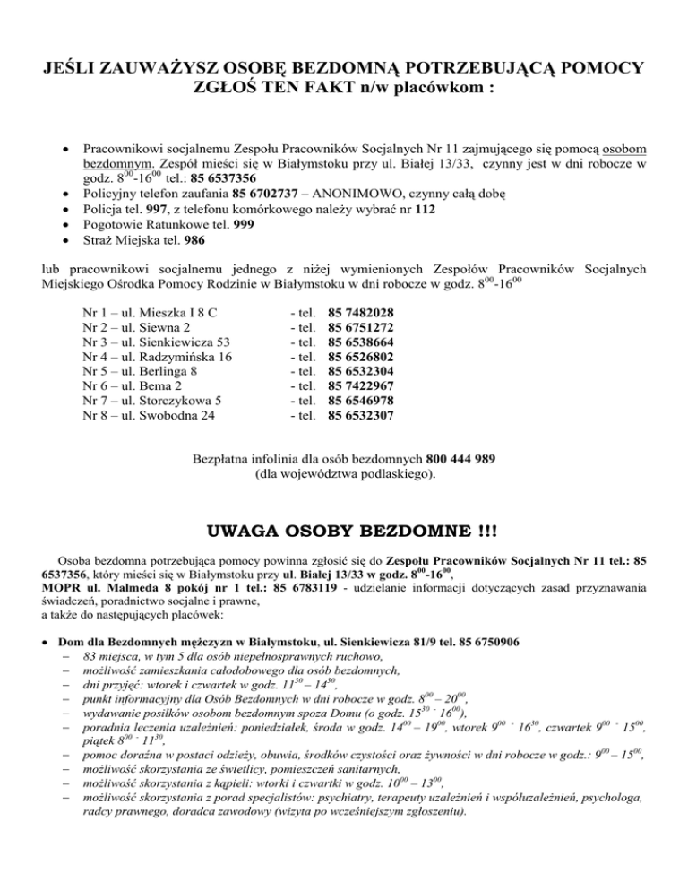 JEŚLI ZAUWAŻYSZ OSOBĘ BEZDOMNĄ POTRZEBUJĄCĄ POMOCY ZGŁOŚ TEN FAKT n/w placówkom : • • • • • Pracownikowi socjalnemu Zespołu Pracowników Socjalnych Nr 11 zajmującego się pomocą osobom bezdomnym. Zespół mieści się w Białymstoku przy ul. Białej 13/33, czynny jest w dni robocze w godz. 800-1600 tel.: 85 6537356 Policyjny telefon zaufania 85 6702737 – ANONIMOWO, czynny całą dobę Policja tel. 997, z telefonu komórkowego należy wybrać nr 112 Pogotowie Ratunkowe tel. 999 Straż Miejska tel. 986 lub pracownikowi socjalnemu jednego z niżej wymienionych Zespołów Pracowników Socjalnych Miejskiego Ośrodka Pomocy Rodzinie w Białymstoku w dni robocze w godz. 800-1600 Nr 1 – ul. Mieszka I 8 C Nr 2 – ul. Siewna 2 Nr 3 – ul. Sienkiewicza 53 Nr 4 – ul. Radzymińska 16 Nr 5 – ul. Berlinga 8 Nr 6 – ul. Bema 2 Nr 7 – ul. Storczykowa 5 Nr 8 – ul. Swobodna 24 - tel. - tel. - tel. - tel. - tel. - tel. - tel. - tel. 85 7482028 85 6751272 85 6538664 85 6526802 85 6532304 85 7422967 85 6546978 85 6532307 Bezpłatna infolinia dla osób bezdomnych 800 444 989 (dla województwa podlaskiego). UWAGA OSOBY BEZDOMNE !!! Osoba bezdomna potrzebująca pomocy powinna zgłosić się do Zespołu Pracowników Socjalnych Nr 11 tel.: 85 6537356, który mieści się w Białymstoku przy ul. Białej 13/33 w godz. 800-1600, MOPR ul. Malmeda 8 pokój nr 1 tel.: 85 6783119 - udzielanie informacji dotyczących zasad przyznawania świadczeń, poradnictwo socjalne i prawne, a także do następujących placówek: • Dom dla Bezdomnych mężczyzn w Białymstoku, ul. Sienkiewicza 81/9 tel. 85 6750906 − 83 miejsca, w tym 5 dla osób niepełnosprawnych ruchowo, − możliwość zamieszkania całodobowego dla osób bezdomnych, − dni przyjęć: wtorek i czwartek w godz. 1130 – 1430, − punkt informacyjny dla Osób Bezdomnych w dni robocze w godz. 800 – 2000, − wydawanie posiłków osobom bezdomnym spoza Domu (o godz. 1530 - 1600), − poradnia leczenia uzależnień: poniedziałek, środa w godz. 1400 – 1900, wtorek 900 - 1630, czwartek 900 - 1500, piątek 800 - 1130, − pomoc doraźna w postaci odzieży, obuwia, środków czystości oraz żywności w dni robocze w godz.: 900 – 1500, − możliwość skorzystania ze świetlicy, pomieszczeń sanitarnych, − możliwość skorzystania z kąpieli: wtorki i czwartki w godz. 1000 – 1300, − możliwość skorzystania z porad specjalistów: psychiatry, terapeuty uzależnień i współuzależnień, psychologa, radcy prawnego, doradca zawodowy (wizyta po wcześniejszym zgłoszeniu). • Noclegownia dla mężczyzn w Białymstoku, ul. Sienkiewicza 81/9, tel. 85 6750906 − noclegownia dysponuje 40 miejscami noclegowymi, − placówka czynna od października do marca w godz. 1800 – 800 od kwietnia do września w godz. 1900 – 700, − bezdomni mężczyźni przyjmowani są do godziny 2130; a w niedziele, święta lub podczas niekorzystnych warunków atmosferycznych całodobowo. • Noclegownia dla kobiet w Białymstoku, ul. Raginisa 55, tel. 85 6750950 − noclegownia dysponuje 20 miejscami noclegowymi, − placówka czynna od października do marca w godz.: 1800 – 800 od kwietnia do września w godz.: 1900 – 700, − bezdomne kobiety przyjmowane są do godziny 2130; a w niedziele, święta lub podczas niekorzystnych warunków atmosferycznych całodobowo. • Schronisko Stowarzyszenia Penitencjarnego „Patronat” w Białymstoku, ul. Świętojańska 2A, tel. 85 7322412 − dysponuje 23 miejscami w pokojach 2 i 3 osobowych, − podstawą przyjęcia jest zawarcie umowy pobytu, po wcześniejszym skierowaniu przez kuratora zawodowego, pracownika socjalnego lub korespondencyjnie, − schronisko przeznaczone jest dla bezdomnych byłych więźniów, samotnych mężczyzn, osobom spoza schroniska pomoc świadczona jest od poniedziałku do piątku w godz.: 900 – 1700 − formy pomocy: nocleg, gorące posiłki, wydawanie środków czystości, odzieży, obuwia, leków, − poradnictwo prawne, pedagogiczne, − warsztaty korekcyjno-edukacyjne. • Ogrzewalnia w Białymstoku, ul. Kolejowa 26 A, Białystok tel. 85 6512153 − ogrzewalnia dla mężczyzn i kobiet (40 miejsc siedzących), w sytuacjach ostrych mrozów dodatkowe 20 miejsc (w świetlicy), − czynna całodobowo (z przerwami: 900 – 1100 i 1700 – 1900), − wydawanie posiłków - gorąca zupa o godz. 1530. • Noclegownia dla mężczyzn w Białymstoku, ul. Zaściańska 84, tel. 85 7433998 − noclegownia funkcjonuje wyłącznie w okresie zimowym (20 miejsc), − możliwość noclegu tylko dla mężczyzn w godz. 1900 – 700 (przyjmowanie osób od godz. 1900 do godz. 2300), − możliwość skorzystania z prysznica, a w umotywowanych przypadkach z kontaktu z lekarzem. • Dom Matki i Dziecka ”NAZARET” w Wasilkowie, ul. Białostocka 1A, tel. 85 7194500 − Dom posiada 15 miejsc, godziny przyjęć 800 - 1600 w dni robocze, − placówka świadczy usługi całodobowo, stacjonarnie, zapewnia schronienie kobietom oczekującym na urodzenie dziecka, matkom z dziećmi, które utraciły − mieszkanie oraz samotnym matkom, których sytuacja materialna lub rodzinna nie pozwalają na godne życie i wychowywanie dzieci (placówka nieinterwencyjna). • Ośrodek Interwencji Kryzysowej, ul. Włókiennicza 7, tel. 85 7445027 Ośrodek dysponuje liczbą 15 miejsc (dostępny całodobowo) – możliwość zamieszkania dla kobiet (także z dziećmi) - będących w sytuacji kryzysowej spowodowanej przemocą w rodzinie, katastrofą, żałobą itp. Formy pomocy: poradnictwo psychologiczne, rodzinne, pedagogiczne, socjalne i prawne, możliwość konsultacji psychiatrycznej, możliwość korzystania z kuchni, świetlicy i pralni. UWAGA OSOBY BEZDOMNE !!! • Prawosławny Ośrodek Miłosierdzia Diecezji Białostocko – Gdańskiej „ELEOS” w Białymstoku, ul. Warszawska 47, tel. 85 7328907 − bezpłatna jadłodajnia dla osób bezdomnych: wydawanie zupy z wkładką od poniedziałku do piątku 