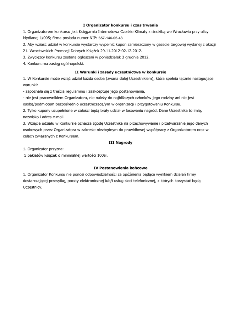 I Organizator konkursu i czas trwania 1. Organizatorem konkursu jest Księgarnia Internetowa Czeskie Klimaty z siedzibą we Wrocławiu przy ulicy Mydlanej 1/005; firma posiada numer NIP: 657-146-05-48 2. Aby wziaść udział w konkursie wystarczy wypełnić kupon zamieszczony w gazecie targowej wydanej z okazji 21. Wrocławskich Promocji Dobrych Książek 29.11.2012-02.12.2012. 3. Zwycięzcy konkursu zostaną ogłoszeni w poniedziałek 3 grudnia 2012. 4. Konkurs ma zasięg ogólnopolski. II Warunki i zasady uczestnictwa w konkursie 1. W Konkursie może wziąć udział każda osoba (zwana dalej Uczestnikiem), która spełnia łącznie następujące warunki: - zapoznała się z treścią regulaminu i zaakceptuje jego postanowienia, - nie jest pracownikiem Organizatora, nie należy do najbliższych członków jego rodziny ani nie jest osobą/podmiotem bezpośrednio uczestniczącą/ym w organizacji i przygotowaniu Konkursu. 2. Tylko kupony uzupełnione w całości będą brały udział w losowaniu nagród. Dane Uczestnika to imię, nazwisko i adres e-mail. 3. Wzięcie udziału w Konkursie oznacza zgodę Uczestnika na przechowywanie i przetwarzanie jego danych osobowych przez Organizatora w zakresie niezbędnym do prawidłowej współpracy z Organizatorem oraz w celach związanych z Konkursem. III Nagrody 1. Organizator przyzna: 5 pakietów książek o minimalnej wartości 100zł. IV Postanowienia końcowe 1. Organizator Konkursu nie ponosi odpowiedzialności za opóźnienia będące wynikiem działań firmy dostarczającej przesyłkę, poczty elektronicznej lub/i usług sieci telefonicznej, z których korzystać będą Uczestnicy.