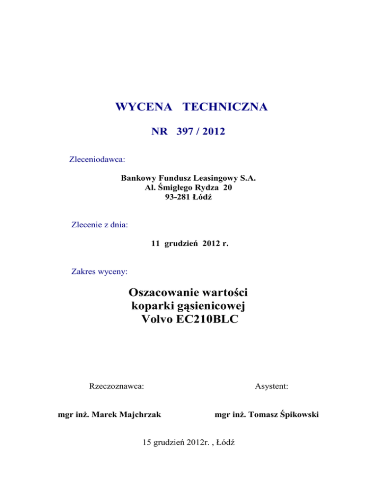 WYCENA TECHNICZNA NR 397 / 2012 Zleceniodawca: Bankowy Fundusz Leasingowy S.A. Al. Śmigłego Rydza 20 93-281 Łódź Zlecenie z dnia: 11 grudzień 2012 r. Zakres wyceny: Oszacowanie wartości koparki gąsienicowej Volvo EC210BLC Rzeczoznawca: mgr inż. Marek Majchrzak Asystent: mgr inż. Tomasz Śpikowski 15 grudzień 2012r. , Łódź SPIS TREŚCI 1. Zleceniodawca 2. Przedmiot zlecenia 3. Cel opracowania 4. Podstawa metodologiczna oszacowania 5. Opis przedmiotu oszacowania 6. Opis stanu technicznego przedmiotu oszacowania 7. Oszacowanie wartości koparki gąsienicowej Volvo EC210BLC 8. Uwagi końcowe i zastrzeżenia 9. Dokumentacja zdjęciowa 2 1. Zleceniodawca Bankowy Fundusz Leasingowy S.A. Al. Śmigłego Rydza 20 93-281 Łódź 2. Przedmiot zlecenia Przedmiotem opracowania jest koparka gąsienicowa Volvo EC210BLC o numerze PIN: EC210V14776, wyprodukowana w: 2005 roku przez: Volvo Construction Equipment Korea Ltd. 3. Cel opracowania Celem opracowania jest oszacowanie wartości koparki gąsienicowej Volvo EC210BLC, na zlecenie Bankowego Funduszu Leasingowego w Łodzi, zgodnie, z którym oszacowanie powinno zawierać: oszacowanie wartości rynkowej koparki gąsienicowej Volvo EC210BLC; dokumentacja zdjęciowa. 4. Podstawa metodologiczna oszacowania1 Aby spełnić cel i przeznaczenie oszacowania, określone potrzebą Zleceniodawcy, należy ustalić następujące wartości przedmiotów oszacowania: Wartość rynkowa – jest definiowana, jako ilość pieniędzy, którą chętny kupujący będzie skłonny zaoferować chętnemu sprzedającemu w zamian za przedmiot transakcji, przy założeniu równości stron, bez istnienia przymusu wpływającego na decyzję o zakupie i sprzedaży, przy pełnej znajomości przedmiotu i okoliczności transakcji, oraz przy zachowaniu odpowiednio długiego czasu wyeksponowania przedmiotu sprzedaży na wolnym rynku. Powyższa wartość uwzględnia między innymi wytwórcę, kompletność, stan techniczny, nowoczesność konstrukcji i wiek urządzenia, okres i sposób eksploatacji, a także warunki popytu i podaży odzwierciedlone ofertami, poszczególnych pozycji wyceny, na rynku pierwotnym lub wtórnym. Wartość likwidacyjna przy sprzedaży wymuszonej - jest to przewidywana cena, która może być uzyskana ze sprzedaży wyposażenia lub 1 Na podstawie wydawnictwa „Podstawy wyceny wartości środków technicznych „Tadeusz Klimek – Wydawnictwo BOMIS Press – Poznań 2003 r. 3 urządzenia, na prawidłowo ogłoszonym i przeprowadzonym przetargu publicznym, aukcji lub licytacji, przy konieczności bezzwłocznej sprzedaży i przy założeniu, że sprzedawca jest zmuszony do transakcji poprzez okoliczności, zaś wyposażenie lub urządzenie sprzedaje się w takim stanie i w takim miejscu, w jakim aktualnie się znajduje. Wycenę wykonano stosując podejście porównawcze. Podejście porównawcze opiera się na metodzie cenowo – porównawczej, a oszacowanie wartości przedmiotów wyceny winno być oparte na znajomości cen transakcyjnych podobnych, porównywalnych środków technicznych. Jeśli porównywalne środki techniczne nie są dokładnie takie same jak środek wyceniany, dokonuje się korektę wartości środków wycenianych. Korekty te wynikają najczęściej z różnic stanu technicznego, wieku modelu (wydajności, rozmiarów), lokalizacji, a także ze względu na inne atrybuty różniące obiekt porównywany z wycenianymi. Podejście to ma doprowadzić do określenia najbardziej prawdopodobnej ceny sprzedaży środków technicznych. W podejściu porównawczym, jeśli nie stosuje się porównania parami, to można użyć relacji wartości, tzn. stosunku wartości obiektu używanego do kosztu zastąpienia obiektu nowego. 5. Opis przedmiotu oszacowania Koparka – maszyna do robót ziemnych, służąca do oddzielania urobku od gruntu i przeniesienia na środki transportowe lub na składowisko. Koparka może również pełnić rolę urządzenia przeładunkowego. Są maszynami powszechnie stosowanymi przy pracach ziemnych budowlanych, transportowych lub górniczych. Podczas oględzin nie przedstawiono żadnej dokumentacji techniczno ruchowej szacowanej koparki gąsienicowej Volvo EC210BLC, poniższy opis sporządzono w oparciu o informacje zawarte w broszurach firmowych Volvo. Tabela 1 Dane techniczne silnika koparki gąsienicowej Volvo EC210BLC 4 Rysunek 1 Widok ogólny koparki gąsienicowej Volvo EC210BLC Rysunek 2 Wymiary koparki gąsienicowej Volvo EC210BLC 5 Rysunek 3 Zasięg roboczy koparki gąsienicowej Volvo EC210BLC 6 Wyposażenie: układ hydrauliczny; kabina ogrzewana i klimatyzowana; kabina oszklona z wycieraczką; fotel amortyzowany, podgrzewany, pas bezpieczeństwa. 6. Opis stanu technicznego przedmiotu oszacowania Koparka gąsienicowa Volvo EC210BLC - będąca przedmiotem oszacowania w chwili oględzin znajdowała się na terenie firmy „Transland” w Łodzi przy ulicy Elektronowej 8. Ogólny wizualny stan techniczny maszyny określono jako: dostateczny. Podczas oględzin uruchomiono silnik. Układ hydrauliczny sprawny. Stwierdzono następujące uszkodzenia oraz usterki: - brak łyżki , zużycie kół napędowych gąsienic: około 80 %; liczne głębokie zarysowania oraz ubytki powłoki lakierowej; liczne ogniska korozji wgłębnej; liczne wgniecenia; pokrywa boczne tylna lewa – lekko zdeformowana ; popękana szyba czołowa – część dolna oraz górna; mocno zabrudzona kabina. Brak jest dokumentacji techniczno – ruchowej. Nie znana jest historia napraw oraz czy były przestrzegane czynności konserwacyjno – naprawcze. Wskazanie licznika motogodzin: 5691 mth Ilość kluczyków: 1 + 1. 7. Oszacowanie wartości koparki gąsienicowej Volvo EC210BLC Oszacowanie wartości koparki gąsienicowej Volvo EC210BLC, wykonano metodą cenowo – porównawczą. Wartość ustalono na podstawie ofert średnich cen rynkowych używanych, podobnych koparek gąsienicowych o zbliżonych parametrach oraz przez zastosowanie korekt wynikających z r
