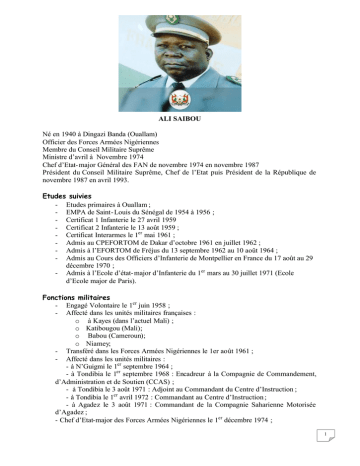 ALI SAIBOU Né en 1940 à Dingazi Banda (Ouallam) Officier des Forces Armées Nigériennes Membre du Conseil Militaire Suprême Ministre d’avril à Novembre 1974 Chef d’Etat- major Général des FAN de novembre 1974 en novembre 1987 Président du Conseil Militaire Suprême, Chef de l’Etat puis Président de la République de novembre 1987 en avril 1993. Etudes suivies - Etudes primaires à Ouallam ; - EMPA de Saint- Louis du Sénégal de 1954 à 1956 ; - Certificat 1 Infanterie le 27 avril 1959 - Certificat 2 Infanterie le 13 août 1959 ; - Certificat Interarmes le 1er mai 1961 ; - Admis au CPEFORTOM de Dakar d’octobre 1961 en juillet 1962 ; - Admis à l’EFORTOM de Fréjus du 13 septembre 1962 au 10 août 1964 ; - Admis au Cours des Officiers d’Infanterie de Montpellier en France du 17 août au 29 décembre 1970 ; - Admis à l’Ecole d’état- major d’Infanterie du 1er mars au 30 juillet 1971 (Ecole d’Ecole major de Paris). Fonctions militaires - Engagé Volontaire le 1er juin 1958 ; - Affecté dans les unités militaires françaises : o à Kayes (dans l’actuel Mali) ; o Katibougou (Mali); o Babou (Cameroun); o Niamey; - Transféré dans les Forces Armées Nigériennes le 1er août 1961 ; - Affecté dans les unités militaires : - à N’Guigmi le 1er septembre 1964 ; - à Tondibia le 1er septembre 1968 : Encadreur à la Compagnie de Commandement, d’Administration et de Soutien (CCAS) ; - à Tondibia le 3 août 1971 : Adjoint au Commandant du Centre d’Instruction ; - à Tondibia le 1er avril 1972 : Commandant au Centre d’Instruction ; - à Agadez le 3 août 1971 : Commandant de la Compagnie Saharienne Motorisée d’Agadez ; - Chef d’Etat-major des Forces Armées Nigériennes le 1er décembre 1974 ; 1 - Chef d’Etat-major Général des Forces Armées Nigériennes le 1er avril 1976 ; - Officier Opérateur de la Zone de défense n°1 (Niamey). Fonctions Politiques - Membre du Conseil Militaire Suprême (avril 1974-décembre 1989), directoire militaire parvenu au pouvoir à la suite du coup d’Etat militaire du 15 avril 1974 ; - Du 22 avril 1974 au 30 novembre 1974 : Ministre de l’Economie rurale, du Climat et de l’Aide aux populations ; - Du 1er décembre 1974 au 1er avril 1976 : Chef d’état- major des Forces Armées Nigériennes ; - Du 1er avril 1976 au 23 novembre 1987 : Chef d’état-major général des Forces Armées Nigériennes, Responsable de l’Aide aux populations ; - Désigné le 10 novembre 1987 par un groupe d’Officiers des FAN pour assurer L’intérim du Président du Conseil Militaire Suprême, Chef de l’Etat, le Général Seyni Kountché, évacué sanitaire à Paris ; - Désigné le 14 novembre 1987 Président du Conseil Militaire Suprême, Chef de l’Etat suite au décès du Général Seyni Kountché (le 10 novembre 1987) ; - Président du Conseil Militaire Suprême, Chef de l’Etat, Ministre de la Défense Nationale, Ministre de l’Intérieur du 20 novembre 1987 au 19 mai 1989, date de la ténue du Congrès Constitutif d’une nouvelle formation politique unique : le Mouvement National pour la Société de Développement (MNSD), parti-Etat ; mise en place de l’organe dirigeant appelé alors Conseil Supérieur d’Orientation Nationale (CSON) et Président du bureau Exécutif National du parti unique ; - Président du Conseil d’Orientation Nationale, Ministre de la Défense, Ministre de l’Intérieur du 19 mai 1989 au 20 décembre 1989 ; - Président de la République, Ministre de al Défense Nationale pour compter du 20 décembre 1989 ; - Le 10 décembre 1989, le Général Ali Saibou, candidat unique du parti- Etat (le MNSD) est élu Président de la République pour un mandat de 7 ans. L’arrêt de la Cour d’Etat donne les précisions suivantes : «Inscrits : 3.508.274 Votants : 3.334.913 Nuls : 5.259 Suffrages valablement exprimés : 3.329.654 Voix obtenues par Ali Saibou : 3.316.182 soit 99,60% Non : 13.472 soit 0,40% ». - Le mandant du Général Ali Saibou prend effet à compter du 14 décembre 1989 et devrait expirer le 13 décembre 1996 à minuit. Mais, la conjugaison d’évènements aussi bien nationaux qu’internationaux va contribuer à affaiblir la IIe République et en définitive avoir raison d’elle : o La chute du mur de Berlin le 10 novembre 1989 et conséquemment l’effondrement du bloc soviétique, l’implosion de l’URSS, la fin de la guerre froide et la mondialisation voire le triomphe du libéralisme ; o La Conférence des Chefs d’Etat et de Gouvernement des pays de France et d’Afrique tenue à la Baule (France) assises au cours desquelles le Président François Mitterrand a fait une apologie pour le moins magistrale du système politique démocratique en liant notamment toute aide occidentale à l’instauration du multipartisme et de la démocratie ; 2 o L’effervescence politique intérieure à la suite des évènements malheureux survenus notamment le 9 février 1990 à Niamey et en mai 1990 (évènements dits de Tchin Tabarenden) ; o La réinstauration du multipartisme en novembre 1990 pour les raisons certes extérieures mais également pour des causes intérieures ; o La tenue d’une Conférence Nationale Souveraine en juillet – novembre 1991 du fait de l’activisme de la nouvelle classe politique, des syndicats des scolaires et des travailleurs. Les participants à la Conférence Nationale Souveraine prennent, sur le plan politique et juridique, des décisions immédiatement exécutoires appelées Actes dont : • le premier en date du 30 juillet 1991 proclame la souveraineté de la Conférence Nationale ; • l’Acte numéro III en date du 9 août 1991 : il abroge la Charte Nationale (article 1er), dissout la Constitution du 24 septembre 1989 modifiée par la loi nº 91 – 002 du 24 avril 1991 (l’article 2) et maintient provisoirement le Président de la République dans des fonctions protocolaires de Chef de l’Etat sous contrôle de la Conférence Nationale (article 