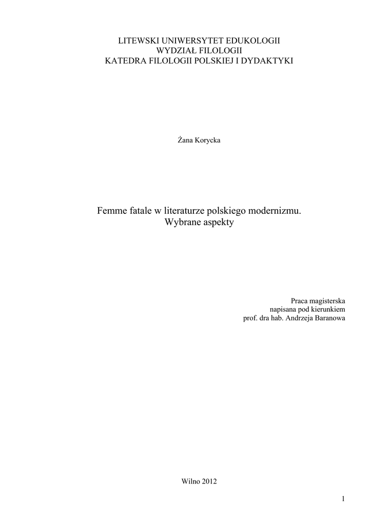 LITEWSKI UNIWERSYTET EDUKOLOGII WYDZIAŁ FILOLOGII KATEDRA FILOLOGII POLSKIEJ I DYDAKTYKI Żana Korycka Femme fatale w literaturze polskiego modernizmu. Wybrane aspekty Praca magisterska napisana pod kierunkiem prof. dra hab. Andrzeja Baranowa Wilno 2012 1 Spis treści Wstęp………………………………………………………………………………………..…...4 Rozdział I Zagadnienia teoretyczne…………………………………………………………………..7 Rozdział II Kobieta fatalna w kontekście europejskiego wampiryzmu………………………………12 Rozdział III Modernistyczne ujęcia femme fatale w literaturze polskiej……………………………...31 1. Problem kobiecej cielesności. Zarys wprowadzający……………………………31 2. Jan Kasprowicz. Dies irae………………………………………………………..34 3. Seksualno-estetyczne „projekty” S. Przybyszewskiego…………………………43 4. Wampir W. S. Reymonta………………………………………………………...59 5. Demoniczne kobiety w utworach S. I. Witkiewicza……………………………..70 Zakończenie…………………………………………………………………………………...83 Bibliografia………………………………………………………………………………...…..85 Aneksy……………………………………………………………………………………….…90 Santrauka……………………………………………………………………………………….98 Summary……………………..………………………………………………………………...99 2 Wstęp Młoda Polska jest to jedna z wielu nazw okresu, obejmującego lata 1890-1918. Tę epokę nazywano także: neoromantyzmem 1, modernizmem 2. Z przyjściem nowej epoki zaczynają panować takie uczucia, jak apatia, niechęć działania, stają się one wszechobecne. Zaczyna dominować skłonność do irracjonalizmu, deformacji rzeczywistości, melancholii, bierności. Artyści interesują się neurozami, stanami chorobliwymi, samoanalizą. Przyczyny wszelkiego zła upatrywano w ewolucji, naturze. Próbowano sprzeciwiać się tym dwóm czynnikom jako napominaniom o nadchodzącej śmierci. Próbowano także uciekać na łono przyrody egzotycznej, która nie była jeszcze „skalana” przez osiągnięcia cywilizacyjne. Literaturę okresu Młodej Polski charakteryzuje ustawiczne przeciwstawianie się banalności. Sztuka musiała dostarczać takich wrażeń, które jeszcze nie były doznawane. Jeśli tego nie czyni, jest zła i nędzna, choćby jej wytwór obwołano arcydziełem 3. Pisarzy ciekawiło głównie to, czego nie można było wyjaśnić, a więc mistycyzm, pierwotny chaos, mare tenebrarum. Zadaniem literatury stało się wyeksponowanie wszystkich zaułków psychiki człowieka, jakie w ogóle da się poznać. Zaczęły ujawniać się wszechobecny pesymizm i niewiara w naprawę panującej sytuacji. Ratunku próbowano szukać w hedonizmie, dlatego też w utworach pojawiła się tematyka zmysłowości, narkomanii itd. Pisarz nie opisywał rzeczywistości, która jego otacza, ale swoje refleksje względem tej rzeczywistości, której nie można objaśnić logicznie. Sztuka pisarska składała się „głównie z opisów, rozmyślań, psychologicznych introspekcji przesyconych subiektywizmem, często jakby z pogranicza jawy i snu, połączonych ze sobą w sposób bardzo luźny, bez pretensji do interpretacji czy wniosków uogólniających” 4. Fantasmagoria występowała praktycznie wszędzie, niczym nie ograniczona fantazja podsycana narkotykami stwarzała niesamowite wizje. Sztuka więc otrzymała nowe znaczenie. Stała się dynamiczna, zaczęła odtwarzać zmienności świata, które jest trudno uchwycić. Najbardziej stosowane było to w malarstwie, np. W. Podkowiński W ogrodzie (1892) (patrz aneks nr 1), C. Monet Japoński mostek w Giverny Kierunek w modernizmie polskim, wskazujący pewne podobieństwa do artystycznych i ideologicznych założeń romantyzmu, nawiązujący zwłaszcza do indywidualizmu społecznego i artystycznego w romantyzmie. S. Sierotwiński, Słownik terminów literackich, Ossolineum, Wrocław-Warszawa-Kraków 1966, s. 168. 2 Modernizm – od fr. moderne – nowoczesny, współczesny, niektórzy uważają za termin najbardziej trafny. Określa przeciwstawianie się „starych” i „nowych”. Ten konflikt był obecny we wszystkich poczynaniach młodych artystów. 3 T. Weiss, Młoda Polska, wyd. I, Wydawnictwa Szkolne i Pedagogiczne, Warszawa 1988, s. 46. 4 Tamże, s. 144. 1 3 (1900) (patrz aneks nr 2). Najważniejszym zadaniem dzieł artystycznych stało się wyeksponowanie duszy twórcy, jego uczuć. Powstały takie hasła, jak: „naga dusza”, „sztuka dla sztuki”, „absolut”. Nowe znaczenie sztuki najlepiej określił ojciec modernizmu w Polsce S. Przybyszewski. W swym słynnym manifeście pt. Confiteor (1899) pisał o tym, jakie funkcje musi pełnić artyzm. Twierdził, że sztuka powinna być uwolniona od konieczności służenia społeczeństwu. Ma sens sama w sobie. Artysta powinien odtwarzać stan duszy taki, jaki on jest, nie krępując się praw etycznych i społecznych. Autor Dzieci szatana twierdził, że sztuka tendencyjna, sztuka pouczająca, sztuka-rozrywka, sztuka-patriotyzm, sztuka mająca jakiś cel moralny lub społeczny przestaje być sztuką, a staje się biblią pauperum dla ludzi, którzy nie umieją myśleć 5. Źródła inspiracji artystów polskich znajdowały się w Europie Zachodniej. Młodzież, która nie chciała studiować na uniwersytetach znajdujących się pod zaborem, udawała się do Niemiec, Francji itd. Tam skupiali się czołujący twórcy nowej sztuki. Swoje teorie próbowali opierać na filarze filozofii. Przypomniano o myślicielu epoki romantycznej Arthurze Schopenhauerze. Jego filozofia stała się m