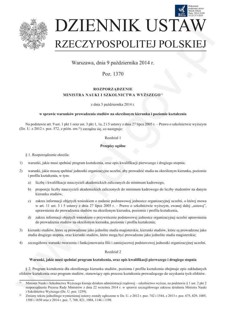 Dokument podpisany przez Marek Głuch Data: 2014.10.09 15:25:37 CEST DZIENNIK USTAW v.p l RZECZYPOSPOLITEJ POLSKIEJ Warszawa, dnia 9 października 2014 r. Poz. 1370 ROZPORZĄDZENIE MINISTRA NAUKI I SZKOLNICTWA WYŻSZEGO 1) .go z dnia 3 października 2014 r. w sprawie warunków prowadzenia studiów na określonym kierunku i poziomie kształcenia Na podstawie art. 9 ust. 1 pkt 1 oraz ust. 3 pkt 1, 1a, 2 i 5 ustawy z dnia 27 lipca 2005 r. – Prawo o szkolnictwie wyższym (Dz. U. z 2012 r. poz. 572, z późn. zm.2)) zarządza się, co następuje: Rozdział 1 Przepisy ogólne 1) 2) w. rcl § 1. Rozporządzenie określa: warunki, jakie musi spełniać program kształcenia, oraz opis kwalifikacji pierwszego i drugiego stopnia; warunki, jakie muszą spełniać jednostki organizacyjne uczelni, aby prowadzić studia na określonym kierunku, poziomie i profilu kształcenia, w tym: a) liczbę i kwalifikacje nauczycieli akademickich zaliczanych do minimum kadrowego, b) proporcje liczby nauczycieli akademickich zaliczonych do minimum kadrowego do liczby studentów na danym kierunku studiów, c) zakres informacji objętych wnioskiem o nadanie podstawowej jednostce organizacyjnej uczelni, o której mowa w art. 11 ust. 3 i 5 ustawy z dnia 27 lipca 2005 r. – Prawo o szkolnictwie wyższym, zwanej dalej „ustawą”, uprawnienia do prowadzenia studiów na określonym kierunku, poziomie i profilu kształcenia, d) zakres informacji objętych wnioskiem o przywrócenie podstawowej jednostce organizacyjnej uczelni uprawnienia do prowadzenia studiów na określonym kierunku, poziomie i profilu kształcenia; 3) szczegółowe warunki tworzenia i funkcjonowania filii i zamiejscowej podstawowej jednostki organizacyjnej uczelni. ww 4) kierunki studiów, które są prowadzone jako jednolite studia magisterskie, kierunki studiów, które są prowadzone jako studia drugiego stopnia, oraz kierunki studiów, które mogą być prowadzone jako jednolite studia magisterskie; Rozdział 2 Warunki, jakie musi spełniać program kształcenia, oraz opis kwalifikacji pierwszego i drugiego stopnia § 2. Program kształcenia dla określonego kierunku studiów, poziomu i profilu kształcenia obejmuje opis zakładanych efektów kształcenia oraz program studiów, stanowiący opis procesu kształcenia prowadzącego do uzyskania tych efektów. 1) 2) Minister Nauki i Szkolnictwa Wyższego kieruje działem administracji rządowej – szkolnictwo wyższe, na podstawie § 1 ust. 2 pkt 2 rozporządzenia Prezesa Rady Ministrów z dnia 22 września 2014 r. w sprawie szczegółowego zakresu działania Ministra Nauki i Szkolnictwa Wyższego (Dz. U. poz. 1259). Zmiany tekstu jednolitego wymienionej ustawy zostały ogłoszone w Dz. U. z 2012 r. poz. 742 i 1544, z 2013 r. poz. 675, 829, 1005, 1588 i 1650 oraz z 2014 r. poz. 7, 768, 821, 1004, 1146 i 1198. Dziennik Ustaw –2– Poz. 1370 v.p l § 3. 1. Opis zakładanych efektów kształcenia uwzględnia efekty kształcenia w zakresie wiedzy, umiejętności oraz kompetencji społecznych właściwe dla kierunku studiów, poziomu i profilu kształcenia wybrane z efektów kształcenia dla obszaru lub obszarów kształcenia, do których został przyporządkowany kierunek studiów, określonych w przepisach wydanych na podstawie art. 9 ust. 1 pkt 2 ustawy. 2. Opis zakładanych efektów kształcenia dla kierunku studiów kończących się uzyskaniem tytułu zawodowego inżyniera lub magistra inżyniera uwzględnia również pełny zakres efektów kształcenia dla studiów o profilu ogólnoakademickim lub praktycznym, prowadzących do uzyskania kompetencji inżynierskich, określonych w przepisach wydanych na podstawie art. 9 ust. 1 pkt 2 ustawy. 3. W przypadku gdy podstawowa jednostka organizacyjna uczelni prowadzi na danym kierunku i poziomie kształcenia studia o profilach ogólnoakademickim i praktycznym, opis zakładanych efektów kształcenia sporządza się odrębnie dla każdego profilu. .go 4. W przypadku gdy podstawowa jednostka organizacyjna uczelni prowadzi na danym kierunku, poziomie i profilu kształcenia studia w formie stacjonarnej i niestacjonarnej, proces kształcenia umożliwia uzyskanie takich samych efektów kształcenia na każdej z tych form studiów. § 4. 1. Program studiów dla kierunku studiów, poziomu i profilu kształcenia określa: formę studiów; 2) liczbę semestrów i liczbę punktów ECTS konieczną do uzyskania kwalifikacji odpowiadających poziomowi kształcenia; 3) moduły zajęć – zajęcia lub grupy zajęć – wraz z przypisaniem do każdego modułu efektów kształcenia oraz liczby punktów ECTS; 4) sposoby weryfikacji zakładanych efektów kształcenia osiąganych przez studenta; 5) plan studiów; 6) łączną liczbę punktów ECTS, którą student musi uzyskać w ramach zajęć: w. rcl 1) a) wymagających bezpośredniego udziału nauczycieli akademickich i studentów, b) z zakresu nauk podstawowych właściwych dla danego kierunku studiów, do których odnoszą się efekty kształcenia dla tego kierunku, poziomu i profilu kształcenia, c) o charakterze praktycznym, w tym zajęć laboratoryjnych, warsztatowych i projektowych; 7) 8) 9) minimalną liczbę punktów ECTS, którą student musi uzyskać w ramach niezwiązanych z kierunkiem studiów zajęć ogólnouczelnianych lub zajęć na innym kierunku studiów; liczbę punktów ECTS, którą student musi uzyskać w ramach zajęć z obszarów nauk humanistycznych i nauk społecznych, nie mniejszą niż 5 punktów ECTS; liczbę punktów ECTS, którą student musi uzyskać w ramach zajęć z języka obcego; 10) liczbę punktów ECTS, którą student musi uzyskać w ramach zajęć z wychowania fizycznego; ww 11) wymiar, zasady i formę odbywania praktyk zawodowych dla kierunku studiów o profilu praktycznym, a w przypadku kierunku studiów o profilu ogólnoakademickim – jeżeli program kształcenia na tych studiach przewiduje praktyki; 12) łączną liczbę punktów ECTS, którą student musi uzyskać w ramach p
