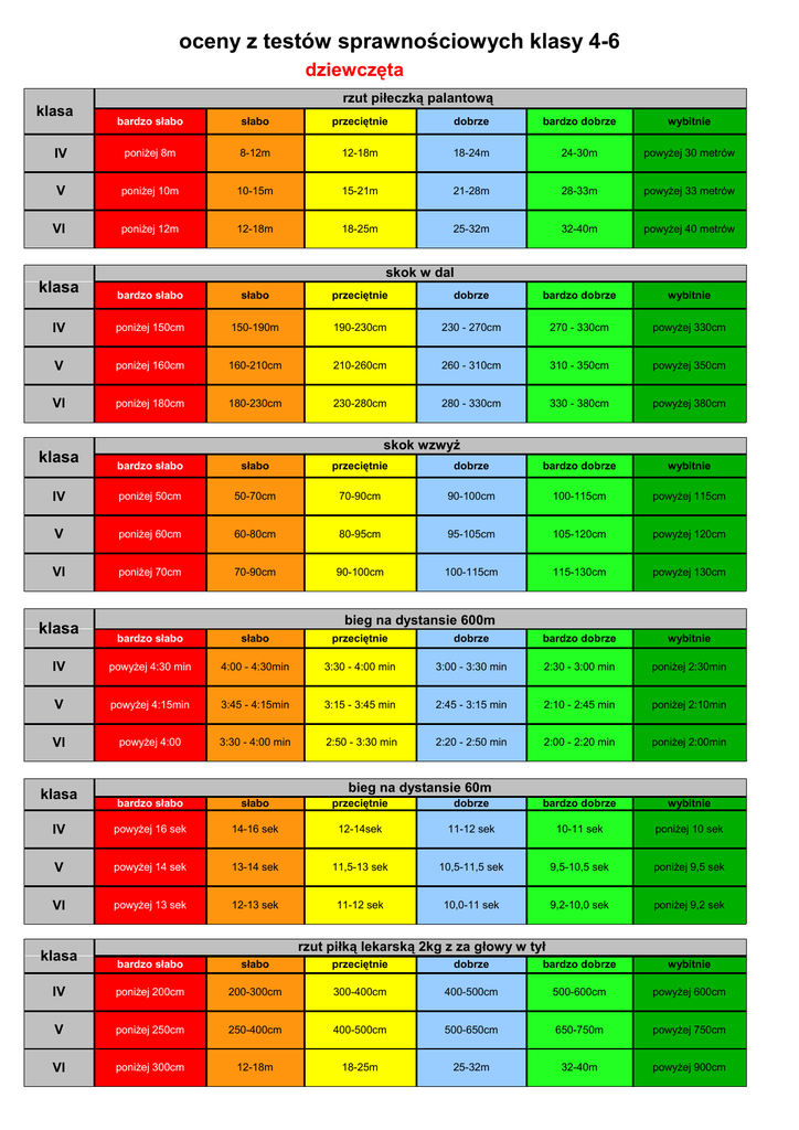 oceny z testów sprawnościowych klasy 4-6 dziewczęta klasa rzut piłeczką palantową bardzo słabo słabo przeciętnie dobrze bardzo dobrze wybitnie IV poniżej 8m 8-12m 12-18m 18-24m 24-30m powyżej 30 metrów V poniżej 10m 10-15m 15-21m 21-28m 28-33m powyżej 33 metrów VI poniżej 12m 12-18m 18-25m 25-32m 32-40m powyżej 40 metrów klasa skok w dal bardzo słabo słabo przeciętnie dobrze bardzo dobrze wybitnie IV poniżej 150cm 150-190m 190-230cm 230 - 270cm 270 - 330cm powyżej 330cm V poniżej 160cm 160-210cm 210-260cm 260 - 310cm 310 - 350cm powyżej 350cm VI poniżej 180cm 180-230cm 230-280cm 280 - 330cm 330 - 380cm powyżej 380cm klasa skok wzwyż bardzo słabo słabo przeciętnie dobrze bardzo dobrze wybitnie IV poniżej 50cm 50-70cm 70-90cm 90-100cm 100-115cm powyżej 115cm V poniżej 60cm 60-80cm 80-95cm 95-105cm 105-120cm powyżej 120cm VI poniżej 70cm 70-90cm 90-100cm 100-115cm 115-130cm powyżej 130cm bardzo słabo słabo przeciętnie dobrze bardzo dobrze wybitnie IV powyżej 4:30 min 4:00 - 4:30min 3:30 - 4:00 min 3:00 - 3:30 min 2:30 - 3:00 min poniżej 2:30min V powyżej 4:15min 3:45 - 4:15min 3:15 - 3:45 min 2:45 - 3:15 min 2:10 - 2:45 min poniżej 2:10min VI powyżej 4:00 3:30 - 4:00 min 2:50 - 3:30 min 2:20 - 2:50 min 2:00 - 2:20 min poniżej 2:00min bardzo słabo słabo przeciętnie dobrze bardzo dobrze wybitnie IV powyżej 16 sek 14-16 sek 12-14sek 11-12 sek 10-11 sek poniżej 10 sek V powyżej 14 sek 13-14 sek 11,5-13 sek 10,5-11,5 sek 9,5-10,5 sek poniżej 9,5 sek VI powyżej 13 sek 12-13 sek 11-12 sek 10,0-11 sek 9,2-10,0 sek poniżej 9,2 sek bardzo słabo słabo przeciętnie dobrze bardzo dobrze wybitnie IV poniżej 200cm 200-300cm 300-400cm 400-500cm 500-600cm powyżej 600cm V poniżej 250cm 250-400cm 400-500cm 500-650cm 650-750m powyżej 750cm VI poniżej 300cm 12-18m 18-25m 25-32m 32-40m powyżej 900cm klasa klasa klasa bieg na dystansie 600m bieg na dystansie 60m rzut piłką lekarską 2kg z za głowy w tył oceny z testów sprawnościowych klasy 4-6 chłopcy klasa rzut piłeczką palantową bardzo słabo słabo przeciętnie dobrze bardzo dobrze wybitnie IV poniżej 12m 12-18m 18-24m 24-32m 32-40m powyżej 40 metrów V poniżej 14m 14-19m 19-26m 26-36m 36-44m powyżej 44metrów VI poniżej 16m 16-22m 22-30m 30-42m 42-50m powyżej 50 metrów klasa skok w dal bardzo słabo słabo przeciętnie dobrze bardzo dobrze wybitnie IV poniżej 150cm 150-200m 200-250cm 250-300cm 300-350cm powyżej 350cm V poniżej 170cm 170-220cm 220-280cm 280-320cm 320-380cm powyżej 380cm VI poniżej 190cm 190-240cm 240-300cm 300-350cm 350-430cm powyżej 430cm klasa skok wzwyż bardzo słabo słabo przeciętnie dobrze bardzo dobrze wybitnie IV poniżej 60cm 60-80cm 80-90cm 90-110cm 110-120cm powyżej 120cm V poniżej 70cm 70-85cm 85-95cm 95-115cm 115-130cm powyżej 130cm VI poniżej 75cm 75-90cm 90-110cm 110-125cm 125-140cm powyżej 140cm bardzo słabo słabo przeciętnie dobrze bardzo dobrze wybitnie IV powyżej 8:00 min 6:00 - 8:00min 5:00 - 6:00 min 4:30 - 5:00 4:00 - 4:30 ponizej 4:00min V powyżej 7:00min 6:00 - 7:00min 4:50 - 6:00 min 4:20 - 4:50 3:50 - 4:20 ponizej 3:50min VI powyżej 6:30 min 5:30 - 6:30min 4:40 - 5:30 min 4:10 - 4:40 3:45 - 4:10 ponizej 3:45min bardzo słabo słabo przeciętnie dobrze bardzo dobrze wybitnie IV powyżej 14.8 sek 12.8-14.8 sek 11.8-12.8sek 10.6-11.8sek 9.8-10.6sek poniżej 9.8sek V powyżej 14.5 sek 12.5-14.0 sek 11.5-12.5sek 10.5-11.5sek 9.7-10.5sek poniżej 9.7 sek VI powyżej 14.0 sek 12.0-14.0 sek 11.0-12.0sek 10.0-11.0sek 8.8-10.0sek poniżej 8.8 sek bardzo słabo słabo przeciętnie dobrze bardzo dobrze wybitnie IV poniżej 250cm 250-350cm 350-450cm 450-550cm 550-650cm powyżej 650cm V poniżej 300cm 300-400cm 400-550cm 550-700cm 700-800cm powyżej 800cm VI poniżej 350cm 350-500cm 500-650cm 650-800cm 800-950cm powyżej 950cm klasa klasa klasa bieg na dystansie 1000m bieg na dystansie 60m rzut piłką lekarską 2kg z za głowy w tył