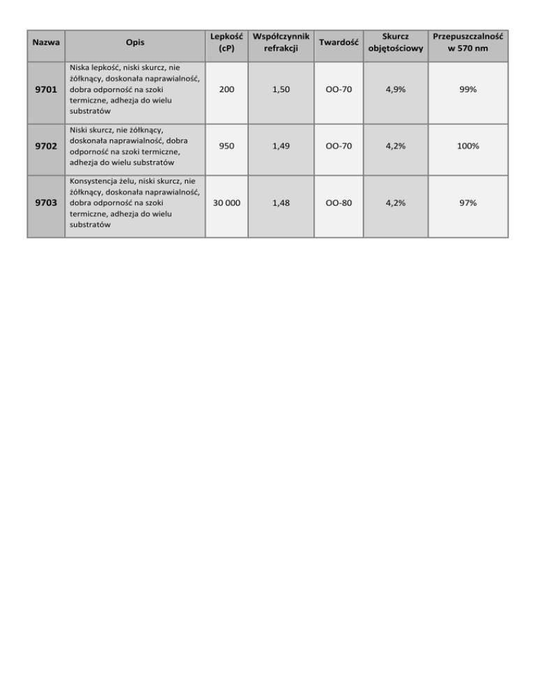 Lepkość Współczynnik Skurcz Przepuszczalność Twardość (cP) refrakcji objętościowy w 570 nm Nazwa Opis 9701 Niska lepkość, niski skurcz, nie żółknący, doskonała naprawialność, dobra odporność na szoki termiczne, adhezja do wielu substratów 200 1,50 OO-70 4,9% 99% 9702 Niski skurcz, nie żółknący, doskonała naprawialność, dobra odporność na szoki termiczne, adhezja do wielu substratów 950 1,49 OO-70 4,2% 100% 9703 Konsystencja żelu, niski skurcz, nie żółknący, doskonała naprawialność, dobra odporność na szoki termiczne, adhezja do wielu substratów 30 000 1,48 OO-80 4,2% 97%