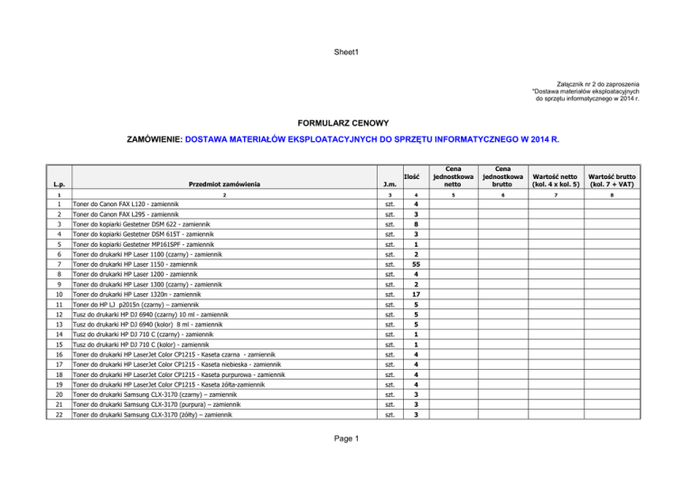 Sheet1 Załącznik nr 2 do zaproszenia "Dostawa materiałów eksploatacyjnych do sprzętu informatycznego w 2014 r. FORMULARZ CENOWY ZAMÓWIENIE: DOSTAWA MATERIAŁÓW EKSPLOATACYJNYCH DO SPRZĘTU INFORMATYCZNEGO W 2014 R. Ilość L.p. Przedmiot zamówienia 1 J.m. 3 4 1 Toner do Canon FAX L120 - zamiennik 2 szt. 4 2 Toner do Canon FAX L295 - zamiennik szt. 3 3 Toner do kopiarki Gestetner DSM 622 - zamiennik szt. 8 4 Toner do kopiarki Gestetner DSM 615T - zamiennik szt. 3 5 Toner do kopiarki Gestetner MP161SPF - zamiennik szt. 1 6 Toner do drukarki HP Laser 1100 (czarny) - zamiennik szt. 2 7 Toner do drukarki HP Laser 1150 - zamiennik szt. 55 8 Toner do drukarki HP Laser 1200 - zamiennik szt. 4 9 Toner do drukarki HP Laser 1300 (czarny) - zamiennik szt. 2 10 Toner do drukarki HP Laser 1320n - zamiennik szt. 17 11 Toner do HP LJ p2015n (czarny) – zamiennik szt. 5 12 Tusz do drukarki HP DJ 6940 (czarny) 10 ml - zamiennik szt. 5 13 Tusz do drukarki HP DJ 6940 (kolor) 8 ml - zamiennik szt. 5 14 Tusz do drukarki HP DJ 710 C (czarny) - zamiennik szt. 1 15 Tusz do drukarki HP DJ 710 C (kolor) - zamiennik szt. 1 16 Toner do drukarki HP LaserJet Color CP1215 - Kaseta czarna - zamiennik szt. 4 17 Toner do drukarki HP LaserJet Color CP1215 - Kaseta niebieska - zamiennik szt. 4 18 Toner do drukarki HP LaserJet Color CP1215 - Kaseta purpurowa - zamiennik szt. 4 19 Toner do drukarki HP LaserJet Color CP1215 - Kaseta żółta-zamiennik szt. 4 20 Toner do drukarki Samsung CLX-3170 (czarny) – zamiennik szt. 3 21 Toner do drukarki Samsung CLX-3170 (purpura) – zamiennik szt. 3 22 Toner do drukarki Samsung CLX-3170 (żółty) – zamiennik szt. 3 Page 1 Cena jednostkowa netto Cena jednostkowa brutto Wartość netto (kol. 4 x kol. 5) Wartość brutto (kol. 7 + VAT) 5 6 7 8 Sheet1 23 Toner do drukarki Samsung CLX-3170 (niebieski) – zamiennik szt. 24 Bęben światłoczuły OPC DRUM do drukarki Samsung CLX-3170– oryginał szt. 1 25 Toner do drukarki Samsung ML-2850DR– zamiennik szt. 18 26 Toner do drukarki Samsung ML-2010 - zamiennik szt. 1 27 Tusz do drukarki HP Officejet Pro 8000 (czarny) 49 ml – oryginał szt. 2 28 Tusz do drukarki HP Officejet Pro 8000 (niebieski) 16 ml – oryginał szt. 2 29 Tusz do drukarki HP Officejet Pro 8000 (purpura) 16 ml – oryginał szt. 2 30 Tusz do drukarki HP Officejet Pro 8000 (żółty) 16 ml– oryginał szt. 2 31 Głowica drukująca do drukarki HP Officejet Pro 8000 (czarno-żółta) – oryginał szt. 1 32 Głowica drukująca do drukarki HP Officejet Pro 8000 (niebiesko-czerwona) – oryginał szt. 1 33 Bęben do drukarki OKI C610 (czarny) - oryginał szt. 1 34 Bęben do drukarki OKI C610 (niebieski) - oryginał szt. 1 35 Bęben do drukarki OKI C610 (purpura) - oryginał szt. 1 36 Bęben do drukarki OKI C610 (żółty) - oryginał szt. 1 37 Toner do drukarki OKI C610 (czarny) – oryginał szt. 2 38 Toner do drukarki OKI C610 (niebieski) – oryginał szt. 2 39 Toner do drukarki OKI C610 (purpura) – oryginał szt. 2 40 Toner do drukarki OKI C610 (żółty) – oryginał szt. 2 41 Bęben do OKI c8800 (niebieski) – oryginał szt. 1 42 Bęben do OKI c8800 (purpura) – oryginał szt. 1 43 Bęben do OKI c8800 (żółty) – oryginał szt. 1 44 Bęben do OKI c8800 (czarny) – oryginał szt. 1 45 Toner do drukarki HP Color Laser Jet 5500 (kaseta niebieska) - zamiennik szt. 0 46 Toner do drukarki HP Color Laser Jet 5500 (kaseta żółta) - zamiennik szt. 1 47 Toner do drukarki HP Color Laser Jet 5500 (kaseta purpurowa) - zamiennik szt. 0 48 Taśma do drukarki igłowej OKI ML 6300FB – oryginał szt. 10 49 Taśma do drukarki igłowej OKI ML 321 – zamiennik szt. 0 50 Bęben światłoczuły OPC DRUM do drukarki Konica Minolta Magicolor 2550 - zamiennik szt. 3 51 Toner do drukarki Konica Minolta Magicolor 2550 (kaseta czarna) - zamiennik szt. 22 52 Toner do drukarki Konica Minolta Magicolor 2550 (kaseta niebieska) - zamiennik szt. 22 53 Toner do drukarki Konica Minolta Magocolor 2550 (kaseta żółta) – zamiennik szt. 22 54 Toner do drukarki Konica Minolta Magicolor 2550 (kaseta purpurowa) – zamiennik szt. 22 55 Toner do drukarki XeroxWorkCentre 3220 (czarny) – zamiennik szt. 2 56 Toner do drukarki EPSON M2300 (czarny) - zamiennik szt. 15 57 Toner do kopiarki Toshiba E-Studio 255 - zamiennik szt. 1 58 Tusz do Plotera OCE CS 2044 (czarny) - oryginał szt. 1 Page 2 3 X X X X X X X X X X X X Sheet1 59 Tusz do Plotera OCE CS 2044 (żółty) - oryginał szt. 1 60 Tusz do Plotera OCE CS 2044 (niebieski) - oryginał szt. 0 X X X X 61 Tusz do Plotera OCE CS 2044 ( purpura) - oryginał szt. 0 X X X X 62 Tusz do Plotera OCE CS 2044 ( niebieski - foto) - oryginał szt. 0 X X X X 63 Tusz do Plotera OCE CS 2044 (purpura – foto) - oryginał szt. 0 X X X X 64 Toner do kopiarki Konica Minolta BizHub C-203 (czarny) – oryginał szt. 1 65 Toner do kopiarki Konica Minolta BizHub C-203 (niebieski) – oryginał szt. 1 66 Toner do kopiarki Konica Minolta BizHub C-203 (purpura) – oryginał szt. 1 67 Bęben do kopiarki Konica Minolta BizHub C-203 (czarny) – oryginał szt. 1 68 Bęben do kopiarki Konica Minolta BizHub C-203 (żółty) – oryginał szt. 1 69 Bęben do kopiarki Konica Minolta BizHub C-203 (niebieski) – oryginał szt. 1 70 Bęben do kopiarki Konica Minolta BizHub C-203 (purpura) – oryginał szt. 1 71 Płyta CD-R 700 MB w kopercie szt. 250 72 Płyta CD-R 700MB w opakowaniu plastikowym szt. 20 73 Płyta CD-RW 700 MB szt. 10 74 Płyta DVD+R szt. 10 75 Podkładka pod mysz szt. 2 76 Sprężone powietrze szt. 5 77 Ściereczki suche, grube, bezpyłowe do czyszczenia i polerowania o zwiększonej absorbcji (op.=50szt.) szt. 2 Wartość (cena) oferty: * Pozycje oznaczone "X" nie podlegają wycenie. Page 3 ....................................... ............................................ (miejscowość i data) (podpis i pieczęć Wykonawcy)