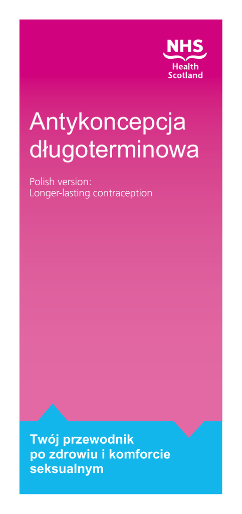 Antykoncepcja długoterminowa Polish version: Longer-lasting contraception Twój przewodnik po zdrowiu i komforcie seksualnym Chętnie rozważymy prośby o wersje w innych językach lub w innym formacie. Kontakt: telefon 0131 314 5300 lub e-mail [email protected] Opublikowano przez NHS Health Scotland 1 South Gyle Crescent Edinburgh EH12 9EB © NHS Health Scotland 2009, 2011, 2013 (dwukrotnie), 2014 Wszelkie prawa zastrzeżone. Materiał zawarty w niniejszej publikacji nie może być powielany w całości ani części bez uprzedniej zgody NHS Health Scotland (lub innych właścicieli praw autorskich). Dokładamy wszelkich starań, aby informacje zawarte w niniejszym materiale były rzetelne i zgodne z prawdą, jednak nie ponosimy odpowiedzialności prawnej za błędy, pominięcia ani stwierdzenia wprowadzające w błąd. NHS Health Scotland jest ośrodkiem współpracującym WHO (WHO Collaborating Centre) w zakresie promowania zdrowia i publicznych programów opieki zdrowotnej. Twój przewodnik po antykoncepcji długoterminowej W tej ulotce zawarto najważniejsze informacje na temat trzech najskuteczniejszych metod rodzajów antykoncepcji długoterminowej – wkładki domacicznej (IUD), wewnątrzmacicznego systemu hormonalnego (IUS) oraz podskórnego implantu hormonalnego. Dodatkowe informacje na temat innych rodzajów antykoncepcji są dostępne pod adresem: www.sexualhealthscotland.co.uk. Metoda antykoncepcji zależy od indywidualnej decyzji i może zmieniać się wielokrotnie wraz ze zmianami twojego trybu życia. Najlepszą metodą może okazać się antykoncepcja długoterminowa, która nie wymaga pamiętania o niej codziennie. Antykoncepcja długoterminowa nie jest nowa, a w Szkocji stosuje ją już jedna na 25 kobiet. Być może nie wiesz o niej zbyt wiele, a może wiesz tylko tyle, ile przeczytałaś w prasie lub usłyszałaś od innych ludzi – niektóre z tych informacji mogą być nie do końca rzetelne. 1 Co oznacza pojęcie „antykoncepcja długoterminowa”? Nie musisz pamiętać, by przyjmować ją codziennie, ani myśleć o niej przy każdym stosunku. Jest ona przy tym niezwykle skuteczna – zapewnia ponad 99-procentową skuteczność w zapobieganiu ciąży. Antykoncepcja długoterminowa działa przez kilka lat. Zaczyna chronić bardzo szybko po zastosowaniu, a jej działanie wygasa w zaledwie kilka dni po jej usunięciu z organizmu i nie wpływa na płodność w przyszłości. Jest bardzo bezpieczna – większość kobiet może ją stosować aż do menopauzy. Czasami pojawiają się skutki uboczne, w tym zmiany w przebiegu miesiączek. Mimo to należy pamiętać o przestrzeganiu zasad bezpiecznego seksu. Podobnie jak pigułki antykoncepcyjne, antykoncepcja długoterminowa nie chroni przed chorobami przenoszonymi drogą płciową (chorobami wenerycznymi), dlatego nadal należy stosować prezerwatywy, dopóki ty i twój partner nie zbadacie się pod kątem tych chorób. 2 W jakim celu stosuje się antykoncepcję długoterminową? Zastanów się, czy antykoncepcja długoterminowa byłaby odpowiednia dla ciebie i dla twojego obecnego trybu życia. Pomyśl spokojnie o: • swoim życiu seksualnym, • swojej pracy, • swoim zdrowiu, • swojej rodzinie. Wybór antykoncepcji to decyzja o tym, co jest dla ciebie odpowiednie, bez względu na wiek. Pamiętanie o przyjmowaniu pigułek może być trudne, szczególnie jeśli masz dużo spraw na głowie, często podróżujesz lub pracujesz w nienormowanych godzinach. Możesz także potrzebować antykoncepcji, która złagodzi obfite lub bolesne miesiączki. Być może nie chcesz mieć dzieci w tej chwili albo wcale – a może uważasz, że twoja rodzina jest już kompletna albo chcesz odczekać jakiś czas, zanim urodzisz kolejne dziecko. Twój GP (lekarz rodzinny) lub pracownicy poradni zdrowia seksualnego wyjaśnią ci, jakie rodzaje antykoncepcji długoterminowej mogą być dla ciebie odpowiednie – wszystkie rodzaje wymienione w tej ulotce mogą być stosowane przez kobiety w każdym wieku bez względu na to, czy rodziłaś już wcześniej, czy nie. Zostanie przeprowadzony z tobą wywiad lekarski, zostaniesz również zapytana o rodzaje wcześniej stosowanych środków antykoncepcyjnych. Otrzymasz także pomoc w wyborze optymalnej metody, informacje dotyczące jej stosowania oraz uzgodnisz termin założenia. Odpowiesz również na kilka pytań w celu stwierdzenia, czy nie jesteś już w ciąży albo czy nie jesteś zagrożona chorobą przenoszoną drogą płciową. 3 W jaki sposób zakłada się antykoncepcję długoterminową? Założenie antykoncepcji długoterminowej wymaga wizyty u przeszkolonego lekarza lub pielęgniarki. Wizyta może się odbyć w twojej przychodni rodzinnej lub w poradni zdrowia seksualnego – możesz także zostać skierowana do innej placówki, jeśli wybrany ośrodek nie będzie w stanie zaoferować wybranej przez ciebie metody. Podobnie jak w przypadku wszystkich metod antykoncepcji, twój organizm może potrzebować czasu na przyzwyczajenie się – jeśli wybrana przez ciebie metoda długoterminowa nie będzie ci pasowała, można ją usunąć w dowolnej chwili. Jeżeli masz jakiekolwiek obawy, omów je ze swoim GP lub z pracownikami poradni zdrowia seksualnego. 4 Jakie są rodzaje antykoncepcji długoterminowej? Wyróżniamy trzy główne rodzaje antykoncepcji długoterminowej – wkładki domaciczne (IUD), wewnątrzmaciczne systemy hormonalne (IUS) oraz hormonalne implanty podskórne. Ich działanie polega na zatrzymaniu owulacji lub zapłodnienia albo obu tych procesów. Zapewniają ponad 99-procentową ochronę przed zajściem w ciążę. Można je stosować w każdym wieku bez względu na to, czy już rodziłaś, czy nie. Wszystkie trzy metody są dyskretne. Po założeniu nie będziesz musiała już myśleć o antykoncepcji długoterminowej – pielęgniarka lub lekarz pokażą ci, jak sprawdzić, czy urządzenie nadal jest na miejscu. 5 Wkładka domaciczna (IUD) • Wkładka domaciczn