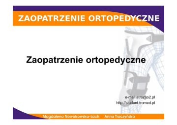 Zaopatrzenie ortopedyczne e-mail:[email protected] http://student.tromed.pl Literatura: 1. T.Myśliborski „Zaopatrzenie ortopedyczne (protetyka i ortotyka) Warszawa 1985 2. B.Przeźniak „Zaopatrzenie rehabilitacyjne” Gdańsk 2003 3. J.Marciniak, A.Szewczenko „Sprzęt rehabilitacyjny” Gliwice 2003 4. M.Vitali, K.Robinson, B.Andew, E.Harris „Amputacje i protezowanie” PZWL Warszawa 1985 5. W.Dega, A.Singer „Ortopedia i rehabilitacja” Warszawa 1996 6. E.Mikołajewska „Neurorehabilitacja, Zaopatrzenie ortopedyczne”, Warszawa 2009 Zaopatrzenie ortopedyczne - zespół procedur medycznych stosowany w leczeniu schorzeń i obrażeń narządu ruchu oraz nowoczesne podejście do problemu zniesienia barier architektonicznych. W przypadku braku możliwości pełnego powrotu do zdrowia zapewnienie komfortu życia stosownie do stopnia niepełnosprawności celem zmniejszenia skutków niepełnosprawności. Zaopatrzenie ortopedyczne obejmuje: Protetyka (gr.protesis – przyłączenie) – w ujęciu klasycznym jest nauką o zastosowaniu w procesie leczenia lub profilaktyki dodatkowych urządzeń umożliwiających wykonywanie funkcji organizmu (ortezy) lub urządzeń uzupełniających nieobecne, brakujące części organizmu (protez) dla realizacji tych funkcji. Aktualnie mówi się o protetyce oraz ortotyce jako o odrębnych działach, chociaż zawsze w systematyce występujących wspólnie. Ortotyka – nauka i umiejętność leczenia za pomocą ortez. Orteza (aparat ortotyczny) – aparat użytku zewnętrznego stosowany do modyfikacji cech budowy i funkcjonowania układu nerwowo- mięśniowego oraz kostnego. Działy protetyki klasycznej: - protetyka właściwa - ortotyka - kalceotyka - epitetyka - adiuwatyka Sposoby wspomagania ortopedycznego: - stałe - czasowe Charakter działania: - Bierny - Czynny - Mieszany Podział zaopatrzenia ortopedycznego: 1. Stosowane profilaktycznie 2. Stosowane leczniczo 3. Stosowane w leczeniu zachowawczym 4. Stosowane w toku przygotowania do leczenia operacyjnego 5. Stosowane w doleczaniu pooperacyjnym Podział zaopatrzenia ortopedycznego c.d. 1. zaopatrzenie ortopedyczne czaszki 2. zaopatrzenie ortopedyczne odcinka czaszkowoszyjnego 3. zaopatrzenie odcinka czaszkowo- szyjno- piersiowego 4. zaopatrzenie odcinka szyjno piersiowego 5. zaopatrzenie ortopedyczne klatki piersiowej (tułowia) 6. zaopatrzenie ortopedyczne brzucha 7. zaopatrzenie ortopedyczne miednicy 8. zaopatrzenie ortopedyczne kończyn dolnych 9. zaopatrzenie ortopedyczne kończyn górnych Podział zaopatrzenia ortopedycznego c.d. 1. elastyczne – stabilizujące 2. półsztywne – stabilizujące, odciążające, unieruchamiające, korekcyjne 3. sztywne Nazewnictwo ortez: FO – foot orthosis AFO – ankle foot ortosis KO – knee orthosis KAFO – knee ankle foot orthosis HO – hip orthosis HKO – hip knee orthosis HKAFO – hip knee ankle foot orthosis FO – finger orthosis HO – hand orthosis WHO – wrist hand orthosis WHFO – wrist hand finger orthosis EO – elbow orthosis EWHO – elbow elbow wrist hand orthosis SO – shoulder orthosis SEO – shoulder elbow orthosis SEWHO – shoulder elbow wrist hand orthosis EO – elbow orthosis EWHO – elbow elbow wrist hand orthosis SO – shoulder orthosis SEO – shoulder elbow orthosis SEWHO – shoulder elbow wrist hand orthosis SIO – sacro iliac orthosis LSO – lumbo sacral orthosis TLSO – thoraco lumbo sacral orthosis CO – cervical orthosis CTO – cervico thoracic orthosis CTLSO – cervico thoraco lumbo sacral orthosis Powszechnie używane do wyrobu przedmiotów ortopedycznych są: - Szyny (łuski) - Tutory - Taśmy - Peloty - Kapy - Druty Pręty Fiszbiny Płaskowniki Rurki Ortezy: 1. Zastosowanie 2. Funkcje: - Stabilizacja Korekcja Odciążenie Kontrola zakresu ruchów Substytucja funkcjonalna Historia: - Hipokrates (ok. 460-377 p.n.e. ) leczył stopy szpotawe, przykurcze w stawach i zniekształcenia kręgosłupa - Galen, Claudius Galenus (129 - 199 r.n.e.) – leczył skrzywienia kręgosłupa prymitywnymi gorsetami - Ambroise Paré (1530- 1590) – stworzył pierwsze protezy uszu, nosa zajmował się leczeniem stóp szpotawych przy porażeniach kończyn - Jean Andre Venel (1740-1791) –założył w Szwajcarii pierwszy zakład leczniczy zajmujący się aparatowaniem chorych Gorset do leczenia skolioz z żelaza Proteza szczudłowa goleni Historia c.d -James Pott – w 1800 roku skonstruował protezę mającą przegubowe połączenie stopy z podudziem - G. Rule – w 1812 skonstruował mechaniczną protezę uda z wyrzutnią kolanową sprężynową i zamkiem kolanowym Historia c.d Rafał Józef Czerniakowski (1743-1816) – wydał pierwszy polski podręcznik chirurgii teoretycznej i praktycznej w którym podaje po za amputacjami i protezami opis szeregu aparatów ortopedycznych stosowanych w schorzeniach narządu ruchu Aktualne przepisy i sposoby pozyskiwania sprzętu ortopedycznego, normy prawne i zasady przyznawania ROZPORZĄDZENIE MINISTRA ZDROWIA z dnia 17 grudnia 2004 r. w sprawie limitu cen dla wyrobów medycznych będących przedmiotami ortopedycznymi i środków pomocniczych, o takim samym zastosowaniu, ale różnych cenach, oraz limitu cen dla napraw przedmiotów ortopedycznych Na podstawie art. 40 ust. 4 ustawy z dnia 27 sierpnia 2004 r. o świadczeniach opieki zdrowotnej finansowanych ze środków publicznych (Dz. U. Nr 210, poz. 2135) zarządza się, co następuje: § 1. Ustala się limity cen dla wyrobów medycznych będących przedmiotami ortopedycznymi, o takim samym zastosowaniu, ale różnych cenach, określone w załączniku nr 1 do rozporządzenia. § 2. Ustala się limity cen dla środków pomocniczych, o takim samym zastosowaniu, ale różnych cenach, określone w załączniku nr 2 do rozporządzenia. § 3. Ustala się limity cen dla napraw przedmiotów ortopedycznych, określone w załączniku nr 3 do rozporządzenia. § 4. Rozporządzenie wchodzi w życie z dniem 1 stycznia 2005 r. Minister Zdrowia: 