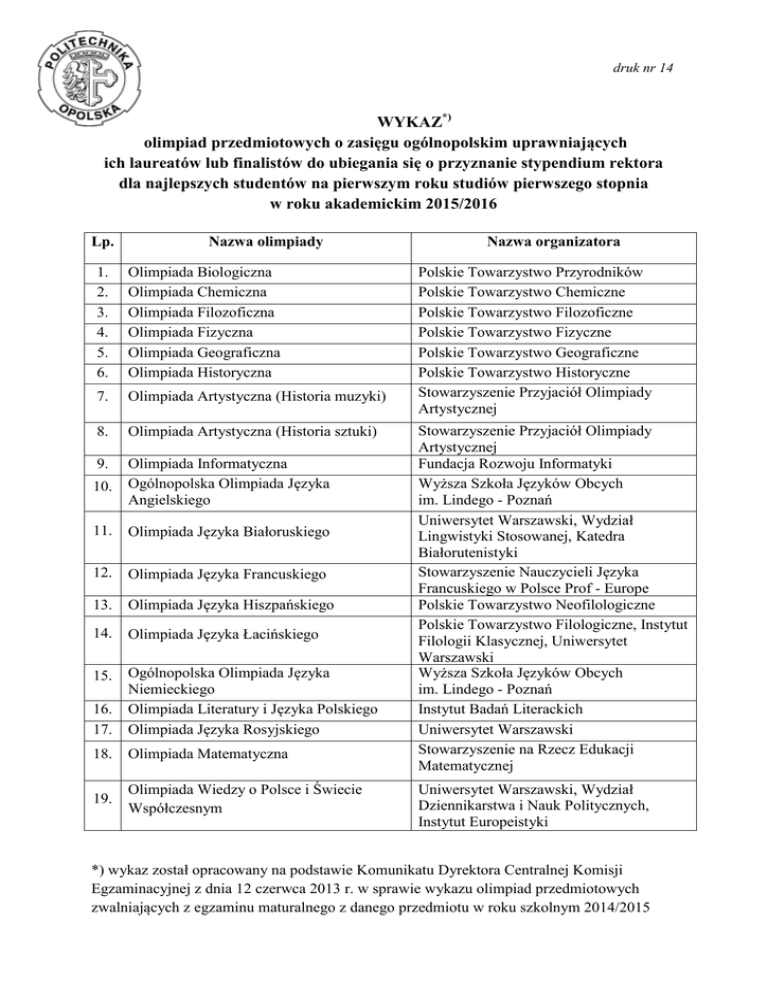 druk nr 14 WYKAZ*) olimpiad przedmiotowych o zasięgu ogólnopolskim uprawniających ich laureatów lub finalistów do ubiegania się o przyznanie stypendium rektora dla najlepszych studentów na pierwszym roku studiów pierwszego stopnia w roku akademickim 2015/2016 Lp. Nazwa olimpiady 1. 2. 3. 4. 5. 6. Olimpiada Biologiczna Olimpiada Chemiczna Olimpiada Filozoficzna Olimpiada Fizyczna Olimpiada Geograficzna Olimpiada Historyczna 7. Olimpiada Artystyczna (Historia muzyki) 8. Olimpiada Artystyczna (Historia sztuki) 9. 10. Olimpiada Informatyczna Ogólnopolska Olimpiada Języka Angielskiego 11. Olimpiada Języka Białoruskiego 12. Olimpiada Języka Francuskiego 13. Olimpiada Języka Hiszpańskiego 14. Olimpiada Języka Łacińskiego 15. 16. 17. Ogólnopolska Olimpiada Języka Niemieckiego Olimpiada Literatury i Języka Polskiego Olimpiada Języka Rosyjskiego 18. Olimpiada Matematyczna 19. Olimpiada Wiedzy o Polsce i Świecie Współczesnym Nazwa organizatora Polskie Towarzystwo Przyrodników Polskie Towarzystwo Chemiczne Polskie Towarzystwo Filozoficzne Polskie Towarzystwo Fizyczne Polskie Towarzystwo Geograficzne Polskie Towarzystwo Historyczne Stowarzyszenie Przyjaciół Olimpiady Artystycznej Stowarzyszenie Przyjaciół Olimpiady Artystycznej Fundacja Rozwoju Informatyki Wyższa Szkoła Języków Obcych im. Lindego - Poznań Uniwersytet Warszawski, Wydział Lingwistyki Stosowanej, Katedra Białorutenistyki Stowarzyszenie Nauczycieli Języka Francuskiego w Polsce Prof - Europe Polskie Towarzystwo Neofilologiczne Polskie Towarzystwo Filologiczne, Instytut Filologii Klasycznej, Uniwersytet Warszawski Wyższa Szkoła Języków Obcych im. Lindego - Poznań Instytut Badań Literackich Uniwersytet Warszawski Stowarzyszenie na Rzecz Edukacji Matematycznej Uniwersytet Warszawski, Wydział Dziennikarstwa i Nauk Politycznych, Instytut Europeistyki *) wykaz został opracowany na podstawie Komunikatu Dyrektora Centralnej Komisji Egzaminacyjnej z dnia 12 czerwca 2013 r. w sprawie wykazu olimpiad przedmiotowych zwalniających z egzaminu maturalnego z danego przedmiotu w roku szkolnym 2014/2015