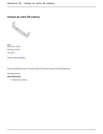 akcesoria CB : Uchwyt do radia CB srebrny Uchwyt do radia CB srebrny Cena Cena brutto: 15,00 z? Cena netto: 12,20 z? VAT:2,80 z? Producent: Blow Car System Uchwyt do radia CB montowany. Rozsuwane wsporniki umo?liwiaj? dopasowanie do dowolnego radia. Szczegó?y produktu dane techniczne materia? stal cynkowana 1 / 1 Powered by TCPDF (www.tcpdf.org)