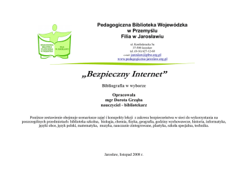 Pedagogiczna Biblioteka Wojewódzka w Przemyślu Filia w Jarosławiu ul. Konfederacka 5u 37-500 Jarosław tel. (0-16) 627-12-60 e-mail: [email protected] www.pedagogiczna-jaroslaw.org.pl „Bezpieczny Internet” Bibliografia w wyborze Opracowała mgr Dorota Grząba nauczyciel - bibliotekarz Poniższe zestawienie obejmuje scenariusze zajęć i konspekty lekcji z zakresu bezpieczeństwa w sieci do wykorzystania na poszczególnych przedmiotach: biblioteka szkolna, biologia, chemia, fizyka, geografia, godziny wychowawcze, historia, informatyka, języki obce, język polski, matematyka, muzyka, nauczanie zintegrowane, plastyka, szkoła specjalna, technika. Jarosław, listopad 2008 r. Biblioteka • Biblioteka czy centrum informacji multimedialnej i internetowej? / • • • • • • • Sowińska B. // „Edukacja Medialna”.- 2003, nr 2, s. 12-15 Biblioterapia z Internetu. Na podstawie opracowania Noli Kostner Aiex / Szulc W. // „Poradnik Bibliotekarza”.- 2000, nr 11, s. 11-13 Internet – a moŜe jednak warto? / Misiak J. // „Biblioteka w Szkole”.- 2003, nr 4, s. 4-5 Internet w bibliotece / Szczerbacz M. // „Poradnik Bibliotekarza”.2002, nr 6, s. 7-8 „Komputer nie jest realnym światem”. Scenariusz zajęć z elementami biblioterapii w klasie piątej z zastosowaniem komputera / Pietrzykowska L. // „Poradnik Bibliotekarza”.- 2008, nr 5, s. 31-32 Od Gutenberga do ksiąŜki w wydaniu internetowym / Biliński L. // „Poradnik Bibliotekarza”.- 2000, nr 11, s. 3-9 Programy wyszukiwawcze, czyli jak odnaleźć informacje w Internecie / Zych A. // „Poradnik Bibliotekarza”.- 2008, nr 3, s. 31-34 Wycieczka do internetowego muzeum - konspekt lekcji regionalnej / Wojciechowska D. // „Biblioteka w Szkole”.- 2008, nr 10, s. 24-25 Biologia • Czy zawsze wierzyć informacjom z Internetu? / Kusion I. // „Biologia w Szkole”.- 2003, nr 2, s. 88-89 • Lekcja biologii z Internetu / Kucia U. // „Biologia w Szkole”.- 2002, nr 4, s. 244 Chemia • Jak program „Układ okresowy pierwiastków” moŜe pomóc w nauczaniu chemii (scenariusz lekcji w klasie I gimnazjum) / Jasińska I. // Edukacja Medialna.- 2001, nr 2, s. 41-43 • Szukanie informacji w Internecie – praktyczne wskazówki / KrólBogomilski J. // „Chemia w Szkole”. - 2001, nr 4, s. 248-250 • Wykorzystanie Internetu do uatrakcyjnienia lekcji chemii / Cęckiewicz M. // „Chemia w Szkole”.- 2001, nr 2, s. 98-100 Fizyka • Fizyka w Internecie. Cz. 1 / Łoś M. // „Fizyka w Szkole”.- 2000, nr 4, s. 197-199 • Znalezione w Internecie. (1) / Łoś M. // „Fizyka w Szkole”.- 2003, nr 3, s. 169-170 Geografia • Internet jako źródło informacji o parkach narodowych w Polsce/ Pokojska P., Pokojski W. // „Geografia w Szkole”. - 2000, nr 1, s. 54-58 • Międzyprzedmiotowy projekt „Kontynenty”. Wykorzystanie technologii informacyjnej w nauczaniu / Perlak A. // „Geografia w Szkole”.- 2001, nr 3, s. 165-169 • Surowce mineralne Polski. (Scenariusz lekcji geografii w gimnazjum) / Gołdowska M. // „Geografia w Szkole”.- 2004, nr 2, s. 36-40 • Unia Europejska w prezentacji multimedialnej – plan metodyczny zajęć edukacyjnych geografii i informatyki / Klunder I., Kaczmarek J. // „Geografia w Szkole”.- 2002, nr 4, s. 232-235 Godziny wychowawcze • Sąd nad mediami (scenariusz lekcji w gimnazjum) / Słomka I. // „Wychowawca”.- 2003, nr 6, s. 26 – 27 • śadnych ograniczeń w cyberprzestrzeni? Zajęcia dla uczniów gimnazjum / Duda B. // „Biblioteka w Szkole”.- 2008, nr 7-8, dod. „Biblioteka centrum Informacji”, s. 24 Historia • Internet na lekcjach historii / Wojdon J. // „Wiadomości Historyczne”.-2002, nr 2, s. 77-79 • Internet w nauczaniu i uczeniu się historii / Wojdon J. // „Wiadomości Historyczne”.-2002, nr 4, s. 203-207 • Internet na zajęciach koła historycznego w gimnazjum / Durka J. // „Wiadomości Historyczne”.- 2002, nr 4, s. 207-209 Informatyka • Nasz program innowacyjny techniki z informatyką / Sosnowska- Rutka B., Łoszczyk B. // „Wychowanie Techniczne w Szkole”.2005, nr 2, s. 4-11 • Tworzenie strony tytułowej prezentacji: scenariusz lekcji z informatyki / Studzińska D. // „Wychowanie techniczne w Szkole”, 2005, nr 1, s. 55-57 • Tworzenie testów z informatyki przy pomocy formularzy (instrukcja obsługi) / Fieducik J. // „Wychowanie Techniczne w Szkole”.- 2006, nr 4/5, s. 35-40 • Wirusy komputerowe – niepoŜądany lokator / Prauzner M., Ujma M., Puchta G. // „Wychowanie Techniczne w Szkole”.- 2003, nr 5, s. 59-62 • Wyszukiwanie informacji na stronach internetowych: scenariusz lekcji z informatyki / Konca H. // „Wychowanie Techniczne w Szkole, 2001, nr 5, s. 54-56 Języki obce • Co to jest „Footbag” ? Tekst z biblioteki internetowej na lekcji języka angielskiego / Gajek – Kawecka E. // „Języki Obce w Szkole”.- 2000, nr 2/3, s. 138-142 • O praktycznym wykorzystaniu Internetu w nauczaniu języka polskiego jako obcego / Małachowska – Pasek Ewa // „Poradnik Językowy”. – 2000, nr 4, s. 57-62 • Nauka posługiwania się skanerem. Pozyskiwanie materiałów graficznych do witryny szkoły / Studzińska D. // „Wychowanie Techniczne w Szkole”.- 2004, nr 5, s. 49-50 • Ochrona przyrody w Polsce – Parki Narodowe (konspekt lekcji informatyki dla klasy V) / Olszowska E. // „Wychowanie Techniczne w Szkole”.- 2004, nr 4, s. 24-25 • Tworzenie i zarządzanie szkolną stroną internetową / Koczy S. // „Wychowanie Techniczne w Szkole”.- 2006, nr 4/5, s. 31-34 Język polski szkoła podstawowa • Internetowa podróŜ w krainę baśni / Czechowicz J. // „Język Polski w Szkole dla klas IV-VI”.- 2007/2008. R. IX, nr 1, s. 88-95 • Internetowy panteon / Jarosław Czechowicz // „Język Polski w Szkole dla klas IV-VI”.- 2007/2008, R. IX, nr 3, s. 76-82 • Jak wykorzystać komputer w pracy nauczyciela polonisty? / • • • • Pawłowicz H. // Język Polski w Szkole IV-