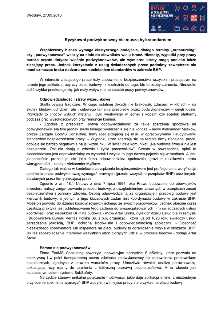 Wrocław, 27.09.2016 Ryzykowni podwykonawcy nie muszą być standardem Współczesny biznes wymaga elastycznego podejścia, dlatego terminy „outsourcing” czy „podwykonawca” weszły na stałe do słowników wielu branż. Niestety, wypadki przy pracy bardzo często dotyczą właśnie podwykonawców, ale wymierne straty mogą ponieść także zlecający prace. Jednak korzystanie z usług świadczonych przez podmioty zewnętrzne nie musi oznaczać braku nadzoru nad spełnianiem standardów w zakresie BHP. W interesie zlecającego prace leży zapewnienie bezpieczeństwa wszystkim pracującym na terenie jego zakładu pracy czy placu budowy - niezależnie od tego, kto te osoby zatrudnia. Nierzadko dość szybko przekonuje się, jak mały wpływ ma na sposób pracy podwykonawców. Odpowiedzialność i straty wizerunkowe Skutki bywają tragiczne. W ciągu ostatniej dekady nie brakowało zdarzeń, w których – na skutek błędów, uchybień, ale i celowego łamania przepisów przez podwykonawców – ginęli ludzie. Przykłady to choćby wybuch metanu i pyłu węglowego w jednej z kopalni czy spadek platformy podczas prac wysokościowych przy remoncie komina. - Zgodnie z przepisami prawa odpowiedzialność za takie zdarzenia spoczywa na podwykonawcy. Na tym jednak skutki takiego wydarzenia się nie kończą – mówi Aleksander Myśkow, prezes Zarządu EcoMS Consulting, firmy specjalizującej się m.in. w opracowywaniu i audytowaniu standardów bezpieczeństwa pracy. – Wypadki, które zdarzają się na terenie firmy zlecającej prace, odbijają się bardzo negatywnie na jej wizerunku. W świat idzie komunikat: „Na budowie firmy X nie jest bezpiecznie. Oni nie dbają o zdrowie i życie pracowników”. Często w powszechnej opinii to zleceniodawca jest odpowiedzialny za wypadek i zwykle to jego nazwa pojawia się w mediach. A jeśli jednocześnie prezentuje się jako firma odpowiedzialna społecznie, grozi mu całkowita utrata wiarygodności – dodaje Aleksander Myśkow. Dlatego tak ważna w kontekście zarządzania bezpieczeństwem jest profesjonalna weryfikacja spełnienia przez podwykonawcę wymagań prawnych (przede wszystkim przepisów BHP) oraz innych, stawianych przez firmę zlecającą prace. Zgodnie z art. 18.1 Ustawy z dnia 7 lipca 1994 roku Prawo budowalne do obowiązków inwestora należy zorganizowanie procesu budowy, z uwzględnieniem zawartych w przepisach zasad bezpieczeństwa i ochrony zdrowia. Osobą odpowiedzialną za organizację i przebieg budowy jest kierownik budowy, a jednym z jego kluczowych zadań jest koordynacja budowy w zakresie BHP. Może on powołać do działań koordynacyjnych jednego ze swoich pracowników. Jednak obecnie coraz częstszą praktyką jest oddelegowanie tego zadania do wyspecjalizowanych firm świadczących usługi koordynacji oraz inspektora BHP na budowie - mówi Artur Sroka, dyrektor działu Usług dla Przemysłu i Budownictwa Bureau Veritas Polska Sp. z o.o, organizacji, która już od 1828 roku świadczy usługi zarządzania jakością, BHP, ochroną środowiska i odpowiedzialnością społeczną. - Obecność niezależnego koordynatora lub inspektora na placu budowy to ograniczenie ryzyka w obszarze BHP, jak też zabezpieczenie interesów wszystkich stron biorących udział w procesie budowy - dodaje Artur Sroka. Pomoc dla podwykonawców Firma EcoMS Consulting stworzyła innowacyjne narzędzie SubSafety, które pozwala na obiektywną i w pełni transparentną ocenę zdolności podwykonawcy do zapewnienia pracownikom bezpiecznych, zgodnych z prawem warunków pracy. Umożliwia również analizę porównawczą, pokazującą, czy mamy do czynienia z faktyczną poprawą bezpieczeństwa. A to właśnie jest ostatecznym celem systemu SubSafety. Narzędzie stanowi unikalne połączenie możliwości, jakie daje aplikacja online, z niezbędnym przy ocenie spełnienia wymagań BHP audytem w miejscu pracy, na przykład na placu budowy. Wrocław, 27.09.2016 Aplikacja zawiera ankietę dla podwykonawców, która jest stale aktualizowana w oparciu o najnowsze wymagania prawne BHP. Każdy z podwykonawców ma swój unikalny profil, w którym zapisywane są osiągane przez niego rezultaty. SubSafety przelicza odpowiedzi na punkty i tworzy raporty w poszczególnych kategoriach. Jest też miejsce na ocenę własną wykonującego zlecenie. Po wypełnieniu ankiety zespół doświadczonych i niezależnych audytorów bezpieczeństwa EcoMS Consulting przeprowadza audyt, w oparciu o dokumentację oraz wizytę w miejscu pracy. Raport z badania, zawierający ocenę w poszczególnych kategoriach, wraz z dostrzeżonymi niezgodnościami i ewentualnymi zaleceniami, jest dostępny online. - Każdy przedsiębiorca korzystający z usług firm zewnętrznych powinien pomagać im zrozumieć najlepsze zasady BHP. SubSafety pozwala podnieść poziom bezpieczeństwa pracy u podwykonawców. Narzędzie warto użyć nie tylko jednokrotnie, lecz stosować do monitorowania i tworzenia historii zmian spełniania przez wykonawców wymagań w zakresie BHP – zauważa Aleksander Myśkow. Dwa dni o BHP u podwykonawców Tematowi minimalizowania ryzyka przy korzystaniu z usług firm zewnętrznych poświęcona będzie konferencja, którą 24 i 25 listopada 2016 r. organizują we Wrocławiu EcoMS Consulting oraz polski oddział Bureau Veritas – światowego lidera branży TIC (Testing, Inspection, Certification). Podczas dwudniowego wydarzenia doświadczeni polscy i zagraniczni eksperci, z wielu firm i różnych branż, zaprezentują konkretne narzędzia, metodologię oraz nowe kierunki w podejściu do bezpieczeństwa, jak również już stosowane rozwiązania oraz normy. Omówione zostaną najlepsze rozwiązania dostosowane do konkretnych rodzajów i miejsc pracy, jak praca na wysokościach czy zarządzanie materiałami niebezpiecznymi na placu budowy. Szczegóły na stronie wydarzenia: www.podwykonawcybezryzyka.pl --Kontakt dla mediów: Paweł Żurawski, e-mail: [email protected] t