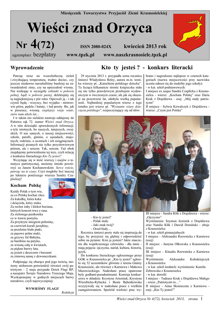 Miesięcznik Towarzystwa Przyjaciół Ziemi Krasnosielckiej Wieści znad Orzyca Nr 4(72) egzemplarz bezpłatny ISSN 2080-024X www.tpzk.pl kwiecień 2013 rok www.naszkrasnosielc.tpzk.pl Kto ty jesteś ? - konkurs literacki Wprowadzenie Patrząc teraz na wszechobecną zieleń i zwyżkującą temperaturę, trudno dociec, czy jeszcze niedawno narzekaliśmy bardziej na zatwardziałość zimy, czy na opieszałość wiosny. Nie wnikając w szczegóły szklanki w połowie pełnej, bądź w połowie pustej, delektujmy się tą najpiękniejszą z pór roku. Opiewali ją - i tak czynić będą - wszyscy, bez wyjątku - mistrzowie pióra, pędzla i batuty, i lud prosty. Bo, jak w piosence, wiosną: cieplejszy wieje wiatr, znów nam ubyło lat… I w takim oto sielskim nastroju oddajemy do Państwa rąk 72. numer Wieści znad Orzyca. A w nim dziesiątki sprawdzonych informacji, o tyle istotnych, bo naszych, tutejszych, swojskich. O nas samych, o naszej miejscowości, szkole, parafii, gminie, o sąsiadach, znajomych, rodzinie, o uczniach i ich osiągnięciach. Informacji pisanych nie tylko przysłowiowym piórem, ale i sercem. Tak, sercem. Tuż obok znajdujemy potwierdzenie tej tezy, czyli relację z konkursu literackiego Kto Ty jesteś? Wczytując się w treść wierszy i esejów o tematyce patriotycznej, możemy śmiało powtórzyć za Janem Kochanowskim: Serce roście, patrząc na te czasy. Czyż mogłoby być inaczej po lekturze poniższego wiersza Sandry Czaplickiej? 29 stycznia 2013 r. przypadła setna rocznica śmierci Władysława Bełzy, autora m.in. tomiku wierszy pt. „Katechizm polskiego dziecka”. Ta licząca kilkanaście stronic książeczka stała się nie tylko prawdziwym przebojem wydawniczym w ówczesnym czasie, ale jak się okazuje na przestrzeni lat, zdobyła wielką popularność. Najbardziej popularnym wiersz z tego tomiku jest wiersz pt. "Wyznanie wiary dziecięcia polskiego", rozpoczynający się od słów: brano i nagrodzono najlepsze w czterech kategoriach (nazwa miejscowości przy nazwisku ucznia odnosi się do siedziby jego szkoły): - w kat. szkół podstawowych: I miejsce ex aequo Sandra Czaplicka z Krasnosielca - wiersz: „Kocham Polskę” oraz Daria Kruk z Drążdżewa - esej: „Mój mały patriotyzm” II miejsce - Sylwia Kowalczyk z Drążdżewa wiersz: „Czym jest Polska” - Kto ty jesteś? - Polak mały. - Jaki znak twój? - Orzeł biały… Rocznica śmierci poety stała się inspiracją do tego, by przyjrzeć się głębiej i odpowiedzieć sobie na pytanie: Kim ja jestem? Jakie znaczenie dla współczesnego człowieka - dla mnie mają pojęcia: ojczyzna, naród, kultura, historia, język. Do konkursu literackiego ogłoszonego przez GOK w Krasnosielcu pt. „Kto ty jesteś” zgłosiło się 52 uczestników głównie z terenu Gminy Krasnosielc, ale również z Karniewa i Makowa Mazowieckiego. Nadesłane prace opatrzone były godłami-pseudonimami. Komisja konkursowa w składzie: Krystyna Artemiuk, Krystyna Wierzbicka-Rybacka i Beata Bębenkowska wczytywały się w nadesłane prace z wielkim zaangażowaniem. Spośród wielości prac wy- III miejsce - Sandra Klik z Drążdżewa - wiersz: „Ojczyzno” Wyróżnienia: Szymon Jeziorek z Drążdżewa oraz Natalia Klik i Dawid Domiński - oboje z Krasnosielca - w kat. szkół gimnazjalnych: I miejsce - Aleksandra Rzewnicka z Karniewa (esej) II miejsce - Justyna Olkowska z Krasnosielca (esej) III miejsce - Klaudia Rzewnicka z Karniewa (esej) Wyróżnienie: Aleksandra Kołodziejczyk z Krasnosielca - w kat. szkół średnich: wyróżnienie: Kamila Żebrowska z Krasnosielca - w kat. dorośli: I miejsce - Tadeusz Kruk z Drążdżewa Małego - wiesz „Patriotyzm to…” II miejsce - Anna Skonieczna z Karniewa esej: „Kto Ty jesteś?” Kocham Polskę Każdy Polak o tym wie, za co Polskę kochać chce. Za kukułkę, która kuka i dzięcioła, który stuka. Za rechot żaby i klekot bociana, których koncert trwa z rana. Za zielonego pasikonika co w trawie pomyka. Za przykryte śniegiem połoniny, za czerwień korali jarzębiny, za przelotne białe ptaki, za pąsowe polne maki, za grzywy fal Bałtyku, za bambino na patyku, za wiosnę całą w kwiatach, za piękne barwy lata, za jesień z deszczem i burzami za zimową sannę z dzwoneczkami. Podpisując się oburącz pod jego treścią, możemy niebawem potwierdzić również swój patriotyzm - 2 maja przypada Dzień Flagi RP, a nazajutrz Święto Narodowe Trzeciego Maja. Wyeksponujmy w godnych miejscach barwy narodowe, czyli najzwyczajniej: WYWIEŚMY FLAGI! Redakcja Wieści znad Orzyca Nr 4(72), kwiecień 2013, strona 1 Nazwiska autorów oraz nagrodzone teksty są umieszczone również w protokole na naszej stronie internetowej. Nagrody rzeczowe dla autorów najlepszych prac zostały ufundowane przez organizatora, tj. Gminny Ośrodek Kultury w Krasnosielcu. Uroczystość wręczenia nagród odbyła się 15 kwietnia br. w Urzędzie Gminy w Krasnosielcu. Po powitaniu przybyłych przez wójta gminy i dyrektor GOK, głos zabrała przewodnicząca komisji konkursowej Krystyna Arte- miuk. Profesjonalnie podsumowała konkurs, odnosząc się do nagrodzonych i wyróżnionych prac. Następnie wręczono dyplomy i nagrody książkowe laureatom konkursu i opiekunom. Podsumowując konkurs, organizatorzy i uczestnicy mieli podobne zdanie, że należy propagować tego typu konkursy w przyszłości. A więc, do zobaczenia na kolejnym konkursie… Beata Heromińska Od redakcji: Gratulujemy pani Beacie Heromińskiej - dyrektor GOK-u wspaniałego pomysłu na rozbudzenie w społeczeństwie poczucia patriotyzmu. O trafności przedsięwzięcia świadczy liczba uczestników i wysoki kunszt literacki nadesłanych na konkurs utworów. Tegoroczny Konkurs odbył się w formie pisemnej, jednocześnie w obu krasnosielckich zespołach szkół, przy życzliwym wsparciu i pomocy ze strony obu dyrekcji i nauczycieli zainteresowanych tematem. Uczestnicy zmierzyli się z testami autorstwa Tadeusza Kruka, lic