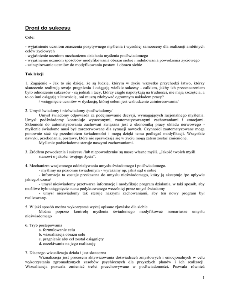 Drogi do sukcesu Cele: - wyjaśnienie uczniom znaczenia pozytywnego myślenia i wysokiej samooceny dla realizacji ambitnych celów życiowych - wyjaśnienie uczniom mechanizmu działania myślenia podświadomego - wyjaśnienie uczniom sposobów modyfikowania obrazu siebie i indukowania powodzenia życiowego - zainspirowanie uczniów do modyfikowania postaw i obrazu siebie Tok lekcji 1. Zagajenie - Jak to się dzieje, że są ludzie, którym w życiu wszystko przychodzi łatwo, którzy skutecznie realizują swoje pragnienia i osiągają wielkie sukcesy - całkiem, jakby ich przeznaczeniem było odnoszenie sukcesów - są jednak i tacy, którzy ciągle napotykają na trudności, nie mają szczęścia, a to co inni osiągają z łatwością, oni muszą zdobywać ogromnym nakładem pracy? / wciągnięcie uczniów w dyskusję, której celem jest wzbudzenie zainteresowania/ 2. Umysł świadomy i nieświadomy /podświadomy/ Umysł świadomy odpowiada za podejmowanie decyzji, wymagających racjonalnego myślenia. Umysł podświadomy kontroluje wyuczonymi, zautomatyzowanymi zachowaniami i emocjami. Skłonność do automatyzowania zachowań związana jest z ekonomiką pracy układu nerwowego myślenie świadome musi być zarezerwowane dla sytuacji nowych. Czynności zautomatyzowane mogą ponownie stać się przedmiotem świadomości i mogą dzięki temu podlegać modyfikacji. Wszystkie nawyki, przekonania, postawy, które nie sprawdzają się w życiu mogą zatem zostać zmienione. Myślenie podświadome steruje naszymi zachowaniami. 3. Źródłem powodzenia i sukcesu /lub niepowodzenia/ są nasze własne myśli. „Jakość twoich myśli stanowi o jakości twojego życia”. 4. Mechanizm wzajemnego oddziaływania umysłu świadomego i podświadomego. - myślimy na poziomie świadomym - wyrażamy np. jakiś sąd o sobie - informacja ta zostaje przekazana do umysłu nieświadomego, który ją akceptuje /po upływie jakiegoś czasu/ - umysł nieświadomy przetwarza informację i modyfikuje program działania, w taki sposób, aby możliwe było osiągnięcie stanu podyktowanego wcześniej przez umysł świadomy - umysł nieświadomy tak steruje naszymi zachowaniami, aby ten nowy program był realizowany. 5. W jaki sposób można wykorzystać wyżej opisane zjawisko dla siebie Można poprzez kontrolę myślenia świadomego modyfikować nieświadomego scenariusze umysłu 6. Tryb postępowania a. formułowanie celu b. wizualizacja obrazu celu c. pragnienie aby cel został osiągnięty d. oczekiwanie na jego realizację 7. Dlaczego wizualizacja działa i jest skuteczna Wizualizacja jest procesem aktywizowania doświadczeń zmysłowych i emocjonalnych w celu wykorzystania zgromadzonych zasobów psychicznych dla przyszłych planów i ich realizacji. Wizualizacja pozwala zmieniać treści przechowywane w podświadomości. Pozwala również 1 zasmakować w odczuwaniu sukcesu. Emocje, które pojawiają się podczas, gdy wizualizujemy moment osiągnięcia sukcesu, są atrakcyjne same w sobie. Chęć osiągania ich w rzeczywistości jest dodatkowym elementem motywacyjnym. 8. Inne metody oddziaływania na podświadomość - autosugestia - afirmacje 9. W jakich dziedzinach życia możemy aktywnie oddziaływać na nasze funkcjonowanie poprzez modyfikowanie zapisów zamieszczonych w podświadomości? /”giełda pomysłów”/ 10. Formowanie własnej osobowości 11. Postulat podstawowy: bądźcie świadomi własnych myśli, zmieniajcie te, które was ograniczają. Uwagi o realizacji Wprowadzenie tej metody w sytuacji, gdy uczniowie mają za sobą już znaczną część kursu za sobą i mieli możliwość sprawdzenia skuteczności dotychczas stosowanych metod nie sprawia większych trudności. Uczniowie zdążyli zaakceptować pewne mechanizmy i do następnych nowości podchodzą z większą ufnością. W dalszym ciągu jednak należy podawać teoretyczne przesłanki zachodzących zmian. Uwiarygodnia to metodę. W gruncie rzeczy nie chodzi tutaj o systematyczny wykład, który miałby doprowadzić do zrozumienia obiektywnych zmian, lecz swego rodzaju racjonalizację, która likwiduje opory. 2