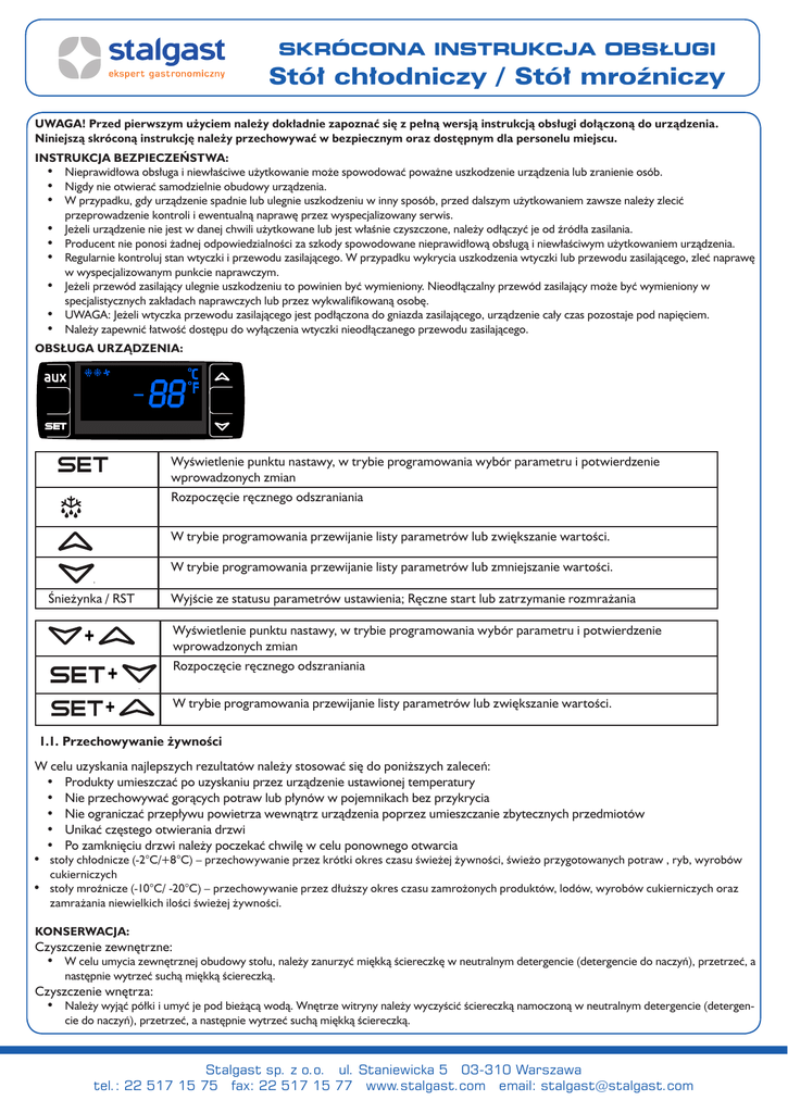 SKRÓCONA INSTRUKCJA OBSŁUGI Stół chłodniczy / Stół mroźniczy UWAGA! Przed pierwszym użyciem należy dokładnie zapoznać się z pełną wersją instrukcją obsługi dołączoną do urządzenia. Niniejszą skróconą instrukcję należy przechowywać w bezpiecznym oraz dostępnym dla personelu miejscu. INSTRUKCJA BEZPIECZEŃSTWA: •• Nieprawidłowa obsługa i niewłaściwe użytkowanie może spowodować poważne uszkodzenie urządzenia lub zranienie osób. •• Nigdy nie otwierać samodzielnie obudowy urządzenia. •• W przypadku, gdy urządzenie spadnie lub ulegnie uszkodzeniu w inny sposób, przed dalszym użytkowaniem zawsze należy zlecić przeprowadzenie kontroli i ewentualną naprawę przez wyspecjalizowany serwis. •• Jeżeli urządzenie nie jest w danej chwili użytkowane lub jest właśnie czyszczone, należy odłączyć je od źródła zasilania. •• Producent nie ponosi żadnej odpowiedzialności za szkody spowodowane nieprawidłową obsługą i niewłaściwym użytkowaniem urządzenia. •• Regularnie kontroluj stan wtyczki i przewodu zasilającego. W przypadku wykrycia uszkodzenia wtyczki lub przewodu zasilającego, zleć naprawę w wyspecjalizowanym punkcie naprawczym. •• Jeżeli przewód zasilający ulegnie uszkodzeniu to powinien być wymieniony. Nieodłączalny przewód zasilający może być wymieniony w specjalistycznych zakładach naprawczych lub przez wykwalifikowaną osobę. •• UWAGA: Jeżeli wtyczka przewodu zasilającego jest podłączona do gniazda zasilającego, urządzenie cały czas pozostaje pod napięciem. •• Należy zapewnić łatwość dostępu do wyłączenia wtyczki nieodłączanego przewodu zasilającego. OBSŁUGA URZĄDZENIA: Wyświetlenie punktu nastawy, w trybie programowania wybór parametru i potwierdzenie wprowadzonych zmian Rozpoczęcie ręcznego odszraniania AUX AUX AUX AUX AUX AUX / RST Śnieżynka AUX + +++ + +++ + + +++ + ++ + ++ W trybie programowania przewijanie listy parametrów lub zwiększanie wartości. W trybie programowania przewijanie listy parametrów lub zmniejszanie wartości. Wyjście ze statusu parametrów ustawienia; Ręczne start lub zatrzymanie rozmrażania Wyświetlenie punktu nastawy, w trybie programowania wybór parametru i potwierdzenie wprowadzonych zmian Rozpoczęcie ręcznego odszraniania W trybie programowania przewijanie listy parametrów lub zwiększanie wartości. 1.1. Przechowywanie żywności W celu uzyskania najlepszych rezultatów należy stosować się do poniższych zaleceń: •• Produkty umieszczać po uzyskaniu przez urządzenie ustawionej temperatury •• Nie przechowywać gorących potraw lub płynów w pojemnikach bez przykrycia •• Nie ograniczać przepływu powietrza wewnątrz urządzenia poprzez umieszczanie zbytecznych przedmiotów •• Unikać częstego otwierania drzwi •• Po zamknięciu drzwi należy poczekać chwilę w celu ponownego otwarcia •• stoły chłodnicze (-2°C/+8°C) – przechowywanie przez krótki okres czasu świeżej żywności, świeżo przygotowanych potraw , ryb, wyrobów cukierniczych •• stoły mroźnicze (-10°C/ -20°C) – przechowywanie przez dłuższy okres czasu zamrożonych produktów, lodów, wyrobów cukierniczych oraz zamrażania niewielkich ilości świeżej żywności. KONSERWACJA: Czyszczenie zewnętrzne: •• W celu umycia zewnętrznej obudowy stołu, należy zanurzyć miękką ściereczkę w neutralnym detergencie (detergencie do naczyń), przetrzeć, a następnie wytrzeć suchą miękką ściereczką. Czyszczenie wnętrza: •• Należy wyjąć półki i umyć je pod bieżącą wodą. Wnętrze witryny należy wyczyścić ściereczką namoczoną w neutralnym detergencie (detergencie do naczyń), przetrzeć, a następnie wytrzeć suchą miękką ściereczką. Stalgast sp. z o.o. ul. Staniewicka 5 03-310 Warszawa tel.: 22 517 15 75 fax: 22 517 15 77 www.stalgast.com email: [email protected]