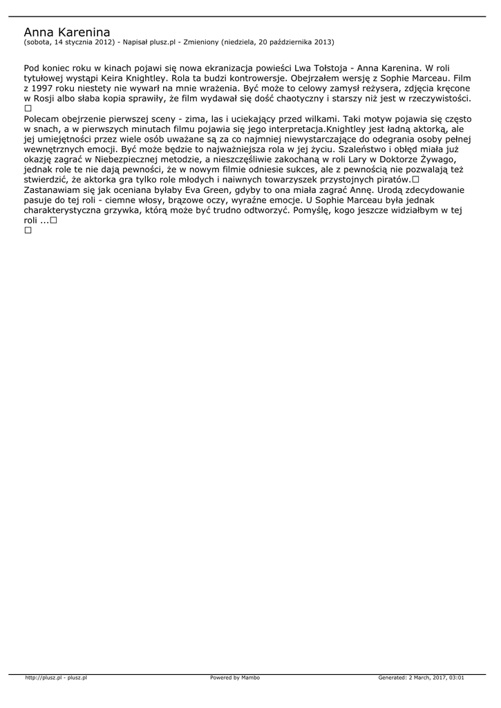 Anna Karenina (sobota, 14 stycznia 2012) - Napisał plusz.pl - Zmieniony (niedziela, 20 października 2013) Pod koniec roku w kinach pojawi się nowa ekranizacja powieści Lwa Tołstoja - Anna Karenina. W roli tytułowej wystąpi Keira Knightley. Rola ta budzi kontrowersje. Obejrzałem wersję z Sophie Marceau. Film z 1997 roku niestety nie wywarł na mnie wrażenia. Być może to celowy zamysł reżysera, zdjęcia kręcone w Rosji albo słaba kopia sprawiły, że film wydawał się dość chaotyczny i starszy niż jest w rzeczywistości. Polecam obejrzenie pierwszej sceny - zima, las i uciekający przed wilkami. Taki motyw pojawia się często w snach, a w pierwszych minutach filmu pojawia się jego interpretacja.Knightley jest ładną aktorką, ale jej umiejętności przez wiele osób uważane są za co najmniej niewystarczające do odegrania osoby pełnej wewnętrznych emocji. Być może będzie to najważniejsza rola w jej życiu. Szaleństwo i obłęd miała już okazję zagrać w Niebezpiecznej metodzie, a nieszczęśliwie zakochaną w roli Lary w Doktorze Żywago, jednak role te nie dają pewności, że w nowym filmie odniesie sukces, ale z pewnością nie pozwalają też stwierdzić, że aktorka gra tylko role młodych i naiwnych towarzyszek przystojnych piratów. Zastanawiam się jak oceniana byłaby Eva Green, gdyby to ona miała zagrać Annę. Urodą zdecydowanie pasuje do tej roli - ciemne włosy, brązowe oczy, wyraźne emocje. U Sophie Marceau była jednak charakterystyczna grzywka, którą może być trudno odtworzyć. Pomyślę, kogo jeszcze widziałbym w tej roli ... http://plusz.pl - plusz.pl Powered by Mambo Generated: 2 March, 2017, 03:01
