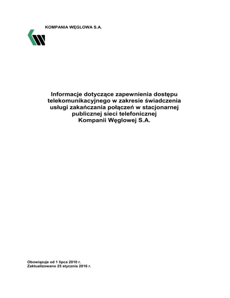 KOMPANIA WĘGLOWA S.A. Informacje dotyczące zapewnienia dostępu telekomunikacyjnego w zakresie świadczenia usługi zakańczania połączeń w stacjonarnej publicznej sieci telefonicznej Kompanii Węglowej S.A. Obowiązuje od 1 lipca 2010 r. Zaktualizowano 25 stycznia 2016 r. I. Spis treści I. SPIS TREŚCI................................................................................................................................................ 2 II. WSTĘP .......................................................................................................................................................... 4 III. DEFINICJE TERMINÓW UŻYTYCH W DOKUMENCIE ................................................................... 5 IV. ZASADY POŁĄCZENIA SIECI PRZEDSIĘBIORCY TELEKOMUNIKACYJNEGO Z SIECIĄ KOMPANIA WĘGLOWA ................................................................................................................................... 8 4.1 INTERFEJS TECHNICZNY POŁĄCZENIA SIECI ........................................................................................... 8 4.2 ZACHOWANIE INTEGRALNOŚCI SIECI ...................................................................................................... 8 4.3 PROCEDURA ZGŁASZANIA WNIOSKU O POŁĄCZENIE SIECI...................................................................... 9 4.4 PROCEDURA ZAWIERANIA UMOWY O POŁĄCZENIU SIECI........................................................................ 9 4.5 PROCEDURY ROZSTRZYGANIA SPORÓW DOTYCZĄCYCH POŁĄCZENIA SIECI ........................................... 9 4.6 PROCEDURY POSTĘPOWANIA W PRZYPADKU ZMIAN W SIECIACH LUB ZMIANY OFERTY ....................... 10 4.6.1. Zmiany w sieciach ....................................................................................................................... 10 4.6.2. Zmiany Oferty ............................................................................................................................. 10 4.7 WARUNKI ZACHOWANIA TAJEMNICY TELEKOMUNIKACYJNEJ LUB OCHRONY DANYCH W SIECI............ 10 4.8 WARUNKI ROZWIĄZANIA UMOWY O POŁĄCZENIU SIECI ...................................................................... 12 4.8.1. Przestanki wypowiedzenia Umowy ............................................................................................. 12 4.8.2. Tryb konsultacji w przypadku naruszenia postanowień Umowy przez jedną ze Stron................ 12 V. OFERTA USŁUG W RAMACH POŁĄCZENIA SIECI ....................................................................... 13 5.1 KATALOG USŁUG MIĘDZYOPERATORSKICH .......................................................................................... 13 5.1.1. Usługi zakańczania połączenia ................................................................................................... 13 5.1.2. Usługi związane z połączeniem sieci - wywiad techniczny ......................................................... 13 5.1.3. Usługa połączenia sieci - Tryb Połączenia Liniowego (jednorazowe) ....................................... 13 5.1.4. Usługa połączenia sieci - Tryb Połączenia Liniowego (cykliczne) ............................................. 14 5.1.5. Usługa połączenia sieci - w Trybie Połączenia Liniowego (obsługa KOMPANIA WĘGLOWA) 14 5.1.6. Usługa połączenia sieci - Tryb Łącza Dedykowanego (jednorazowe) ........................................ 14 5.1.7. Usługa połączenia sieci - Tryb Łącza Dedykowanego (cykliczne) ............................................. 14 5.1.8. Usługa uruchomienia połączenia sieci, pomiarów i przekazania do eksploatacji. ..................... 14 5.1.9. Eksploatacja Wiązek Łączy Międzysieciowych ........................................................................... 14 5.1.10. Dostęp do sieci komutacyjnej i sygnalizacyjnej KOMPANIA WĘGLOWA ................................. 15 VI. TECHNICZNE WARUNKI POŁĄCZENIA SIECI TELEKOMUNIKACYJNYCH......................... 16 6.1 POŁĄCZENIE SIECI W TRYBIE ŁĄCZA DEDYKOWANEGO ....................................................................... 16 6.2 POŁĄCZENIE SIECI W TRYBIE POŁĄCZENIA LINIOWEGO ....................................................................... 16 6.2.1. Sposób realizacji połączenia sieci w Trybie Połączenia Liniowego ........................................... 17 6.3 LOKALIZACJA FIZYCZNYCH PUNKTÓW STYKU SIECI ........................................................................... 17 6.4 KONFIGURACJA ORAZ WYMAGANIA DOTYCZĄCE SYGNALIZACJI .......................................................... 17 6.5 ZARZĄDZANIE WIĄZKAMI ŁĄCZY MIĘDZYSIECIOWYCH ...................................................................... 18 VII. WARUNKI REALIZACJI POŁĄCZENIA SIECI I ZASADY WSPÓŁPRACY STRON W TRAKCIE OBOWIĄZYWANIA UMOWY..................................................................................................... 19 7.1 PLANOWANIE I PROJEKTOWANIE POŁĄCZENIA SIECI ............................................................................. 19 7.2 PROCES SKŁADANIA ZAMÓWIEŃ DOTYCZĄCYCH POŁĄCZENIA SIECI..................................................... 19 7.2.1. Realizacja wywiadu technicznego związanego z budową punktu styku sieci .............................. 19 7.3 PROCES REALIZACJI ZAMÓWIEŃ DOTYCZĄCYCH POŁĄCZENIA SIECI..................................................... 20 7.3.1. Realizacja testów wykonywanych przed otwarciem punktu styku sieci....................................... 20 7.3.2. Uruchomienie komercyjne punktu styku sieci. ............................................................................ 21 7.3.3. Redukcja przepustowości istniejącego punktu styku sieci........................................................... 21 7.4 WARUNKI EKSPLOATACJI .................................................................................................................