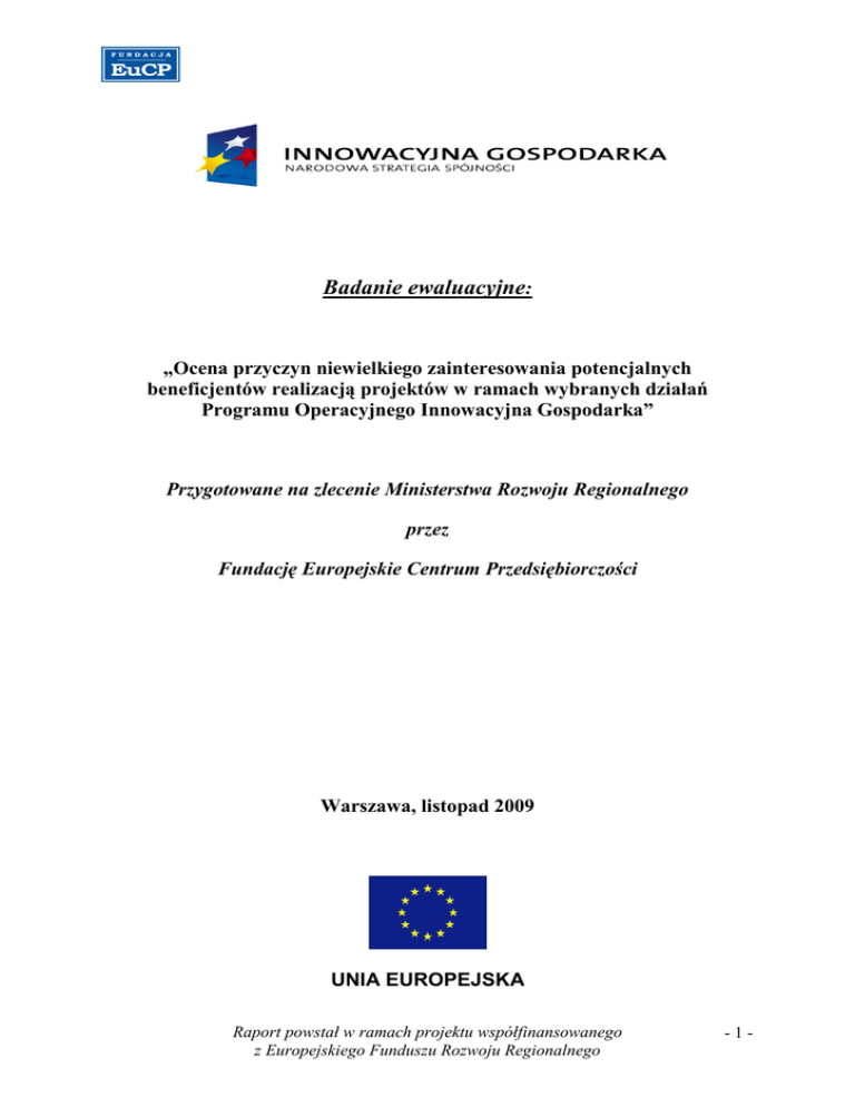 Badanie ewaluacyjne: „Ocena przyczyn niewielkiego zainteresowania potencjalnych beneficjentów realizacją projektów w ramach wybranych działań Programu Operacyjnego Innowacyjna Gospodarka” Przygotowane na zlecenie Ministerstwa Rozwoju Regionalnego przez Fundację Europejskie Centrum Przedsiębiorczości Warszawa, listopad 2009 UNIA EUROPEJSKA Raport powstał w ramach projektu współfinansowanego z Europejskiego Funduszu Rozwoju Regionalnego -1- Badanie ewaluacyjne zostało przeprowadzone przez zespół w składzie: dr Jerzy Kwieciński (kierujący zespołem) Piotr Stefaniak Natalia Wojciechowska (koordynator merytoryczny) Joanna Warczachowska Aneta Kondraszuk Anna Konieczko Beata Rulak Irena Szczepaniak Grzegorz Stawicki Anna Chmielak Raport powstał w ramach projektu współfinansowanego z Europejskiego Funduszu Rozwoju Regionalnego -2- Wykaz zastosowanych skrótów: BCC - Business Centre Club EFRR - Europejski Fundusz Rozwoju Regionalnego EFS - Europejski Fundusz Społeczny FEuCP – Fundacja Europejskie Centrum Przedsiębiorczości KIG - Krajowa Izba Gospodarcza KIGEiT - Krajowa Izba Gospodarcza Elektroniki i Telekomunikacji KSI – Krajowy System Informatyczny MG - Ministerstwo Gospodarki MNiSW - Ministerstwo Nauki i Szkolnictwa WyŜszego MRR - Ministerstwo Rozwoju Regionalnego MSWiA - Ministerstwo Spraw Wewnętrznych i Administracji MŚP - małe i średnie przedsiębiorstwa NOT - Naczelna Organizacja Techniczna OPI - Ośrodek Przetwarzania Informacji PAN – Polska Akademia Nauk PARP - Polska Agencja Rozwoju Przedsiębiorczości PKPP Lewiatan - Polska Konfederacja Pracodawców Prywatnych „Lewiatan” Prace B+R – prace badawczo-rozwojowe PO IG - Program Operacyjny Innowacyjna Gospodarka RPO - Regionalne Programy Operacyjne UKE - Urząd Komunikacji Elektronicznej WWPE - Władza WdraŜająca Programy Europejskie Raport powstał w ramach projektu współfinansowanego z Europejskiego Funduszu Rozwoju Regionalnego -3- Spis treści: 1. Wprowadzenie -5 2. Cel i zakres badania ewaluacyjnego -8 3. Opis zastosowanej metodologii oraz źródła informacji - 10 wykorzystywanych w badaniu 4. Opis wyników ewaluacji w podziale na poszczególne - 15 działania/poddziałania 5. Wnioski i rekomendacje w podziale na poszczególne - 37 działania/poddziałania Aneks - 46 Streszczenia w języku polskim i angielskim - 64 Załącznik nr 1 (Tabela rekomendacji) - 75 Raport powstał w ramach projektu współfinansowanego z Europejskiego Funduszu Rozwoju Regionalnego -4- 1. Wprowadzenie Program Operacyjny Innowacyjna Gospodarka to najwaŜniejszy program dla polskich przedsiębiorców i dla sektora nauki w ramach Narodowej Strategii Spójności 2007-2013. Program ten teŜ jest liderem wśród duŜych programów krajowych pod względem zaawansowania stopnia jego realizacji, mierzonego jako procent wartości podpisanych umów w odniesieniu do całej alokacji. Pierwsze nabory projektów rozpoczęły się w I kwartale 2008 roku. Według danych Ministerstwa Rozwoju Regionalnego z raportu miesięcznego na koniec września 2009 roku w ramach wszystkich działań PO IG złoŜono 6 911 wniosków o dofinansowanie poprawnych pod względem formalnym, na łączną kwotę wnioskowanego dofinansowania ponad 44,8 mld PLN, przekraczającą alokację środków na realizację całego Programu. A według danych z dnia 13 listopada 2009 roku, zatwierdzono do dofinansowania 3030 wniosków na łączną kwotę dofinansowania 18,7 mld PLN z EFRR (45,2% całkowitej alokacji) i podpisano 2084 umów o dofinansowanie projektów na łączną kwotę wsparcia, wynoszącą 15,0 mld PLN z EFRR (36,3% alokacji z EFRR). ChociaŜ generalnie moŜemy stwierdzić, Ŝe program cieszy się olbrzymim zainteresowaniem, to nie wszystkie działania/poddziałania cieszą się takim samym zainteresowaniem beneficjentów i rozkład złoŜonych wniosków o dofinansowanie i podpisanych umów w poszczególnych działaniach/poddziałaniach jest bardzo nierównomierny. Działania/podziałania, w których składanych jest najmniej wniosków o dofinansowanie (wniosków poprawnych pod względem formalnym; dane MRR pochodzące z KSI), są następujące wg stanu na koniec października 2009 roku: a) poddziałanie 1.3.2 Wsparcie ochrony własności przemysłowej tworzonej w jednostkach naukowych w wyniku prac B+R (łącznie 36 złoŜonych wniosków o dofinansowanie), b) poddziałanie 4.5.1 Wsparcie inwestycji w sektorze produkcyjnym (łącznie 6 złoŜonych wniosków o dofinansowanie), c) działanie 5.1 Wspieranie rozwoju powiązań kooperacyjnych o znaczeniu ponadregionalnym (łącznie 9 złoŜonych wniosków o dofinansowanie), Raport powstał w ramach projektu współfinansowanego z Europejskiego Funduszu Rozwoju Regionalnego 5 d) poddziałanie 5.4.1 Wsparcie na uzyskanie/realizację ochrony własności przemysłowej (łącznie 45 złoŜonych wniosków o dofinansowanie), e) poddziałanie 6.2.2 Wsparcie działań studyjno-koncepcyjnych w ramach przygotowania terenów inwestycyjnych dla projektów inwestycyjnych (łącznie 27 złoŜonych wniosków o dofinansowanie), f) działanie 8.4 Zapewnienie dostępu do Internetu na etapie „ostatniej mili” (łącznie 14 złoŜonych wniosków o dofinansowanie). Na te działania/poddziałania zostały zaalokowane znaczne kwoty. Według danych Ministerstwa Rozwoju Regionalnego na koniec października 2009, wykorzystanie środków w Ŝadnym z powyŜszych działań nie przekroczyło 7 % alokacji biorąc pod uwagę wartość podpisanych umów. W celu wykluczenia zagroŜenia niezrealizowania zasady n+3 i osiągnięcia załoŜonych celów programu konieczne jest zbadanie przyczyn niewielkiego zainteresowania wnioskodawców oferowanym wsparciem w tych działaniach/poddziałaniach oraz zaproponowanie działań naprawczych. Określenie przyczyn niewielkiego zainteresowania jest takŜe bardzo istotne w obecnej chwili z punktu widzenia wsparcia beneficjentów tych działań/poddziałań ze względu na trwające spowolnienie gos