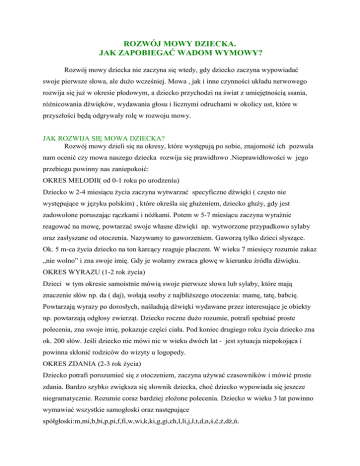 ROZWÓJ MOWY DZIECKA. JAK ZAPOBIEGAĆ WADOM WYMOWY? Rozwój mowy dziecka nie zaczyna się wtedy, gdy dziecko zaczyna wypowiadać swoje pierwsze słowa, ale dużo wcześniej. Mowa , jak i inne czynności układu nerwowego rozwija się już w okresie płodowym, a dziecko przychodzi na świat z umiejętnością ssania, różnicowania dźwięków, wydawania głosu i licznymi odruchami w okolicy ust, które w przyszłości będą odgrywały rolę w rozwoju mowy. JAK ROZWIJA SIĘ MOWA DZIECKA? Rozwój mowy dzieli się na okresy, które występują po sobie, znajomość ich pozwala nam ocenić czy mowa naszego dziecka rozwija się prawidłowo .Nieprawidłowości w jego przebiegu powinny nas zaniepokoić: OKRES MELODII( od 0-1 roku po urodzeniu) Dziecko w 2-4 miesiącu życia zaczyna wytwarzać specyficzne dźwięki ( często nie występujące w języku polskim) , które określa się głużeniem, dziecko głuży, gdy jest zadowolone poruszając rączkami i nóżkami. Potem w 5-7 miesiącu zaczyna wyraźnie reagować na mowę, powtarzać swoje własne dźwięki np. wytworzone przypadkowo sylaby oraz zasłyszane od otoczenia. Nazywamy to gaworzeniem. Gaworzą tylko dzieci słyszące. Ok. 5 m-ca życia dziecko na ton karcący reaguje płaczem. W wieku 7 miesięcy rozumie zakaz „nie wolno” i zna swoje imię. Gdy je wołamy zwraca głowę w kierunku źródła dźwięku. OKRES WYRAZU (1-2 rok życia) Dzieci w tym okresie samoistnie mówią swoje pierwsze słowa lub sylaby, które mają znaczenie słów np. da ( daj), wołają osoby z najbliższego otoczenia: mamę, tatę, babcię. Powtarzają wyrazy po dorosłych, naśladują dźwięki wydawane przez interesujące je obiekty np. powtarzają odgłosy zwierząt. Dziecko roczne dużo rozumie, potrafi spełniać proste polecenia, zna swoje imię, pokazuje części ciała. Pod koniec drugiego roku życia dziecko zna ok. 200 słów. Jeśli dziecko nie mówi nic w wieku dwóch lat - jest sytuacja niepokojąca i powinna skłonić rodziców do wizyty u logopedy. OKRES ZDANIA (2-3 rok życia) Dziecko potrafi porozumieć się z otoczeniem, zaczyna używać czasowników i mówić proste zdania. Bardzo szybko zwiększa się słownik dziecka, choć dziecko wypowiada się jeszcze niegramatycznie. Rozumie coraz bardziej złożone polecenia. Dziecko w wieku 3 lat powinno wymawiać wszystkie samogłoski oraz następujące spółgłoski:m,mi,b,bi,p,pi,f,fi,w,wi,k,ki,g,gi,ch,l,li,j,ł,t,d,n,ś,ć,ż,dź,ń. OKRES SWOISTEJ MOWY DZIECIĘCEJ( 4-5 rok życia) Dziecko rozróżnia i nazywa kolory. Zna coraz więcej słów. Wypowiada się coraz poprawniej. W wieku 4 lat dziecko uczy się mówić głoski s,z,c,dz. W wieku 5 lat dziecko uczy się wymawiać sz, ż,cz,dż, r. Mowa dziecka sześcioletniego powinna być już ukształtowana. ROLA ODDYCHANIA I KARMIENIA W ROZWOJU PRAWIDŁOWEJ WYMOWY. Karmienie piersią jest największym dobrodziejstwem, jakie matka może ofiarować swojemu dziecku. Dziecko w czasie ssania zaspokaja nie tylko głód, ale także odruch ssania, a także ćwiczy pracę języka i warg, wzmacnia mięśnie zapobiegające opadaniu żuchwy, a tym samym wyrabia nawyk oddychania przez nos. Jeżeli z różnych względów jest to niemożliwe, należy korzystać z butelek ze smoczkami specjalnie profilowanymi, o wielu małych otworach, najlepiej jednak jak najczęściej karmić dziecko łyżeczką. Nie należy przedłużać jednak karmienia piersią powyżej 2 roku życia. W momencie wyrzynania się u dziecka pierwszych ząbków podajemy dziecku do gryzienia np. skórkę od chleba, nieco późniejjabłko, aktywizując je w ten sposób do żucia i powodując powolne wygaszanie odruchu ssania. Nadmierne ssanie blokuje rozwój żucia, obniża napięcie mięśni ust, co uniemożliwia wytworzenie nawyku zamykania ust. Jeśli usta są otwarte język opada na dno jamy ustnej i nie pionizuje się. Pionizacja języka, a więc jego zdolność do unoszenia się na górne dziąsło jest niezbędna dla prawidłowej artykulacji. Także nieprawidłowe oddychanie blokuje pionizację języka. Otwarta stale buzia uniemożliwia unoszenie języka. Dlatego rodzice od urodzenia dziecka winni zwracać uwagę na sposób, w jaki ono oddycha. Odpowiednie układanie dziecka w łóżeczku i wózku tak, aby jego główka znajdowała się nieco wyżej, sprzyja domykaniu warg i oddychaniu przez nos. Rodzice muszą dbać, aby w miarę możliwości nos dziecka był cały czas drożny. Jeśli dojdzie do przerośnięcia III migdała- musi zostać on obkurczony lub usunięty, ponieważ uniemożliwia dziecku prawidłowe oddychanie. Pokarm dziecka rocznego nie powinien być zbyt rozdrabniany, należy coraz częściej podawać dziecku poramy wymagające gryzienia i żucia, jest to naturalna gimnastyka narządów mowy. Z punktu widzenia rozwoju mowy niekorzystne jest ssanie przez dziecko smoczka. Smoczek unieruchamia język, który jest przyciskany do dna jamy ustnej, przez co wtórnie język staje się niesprawny, w konsekwencji dziecko nieprawidłowo połyka i później także nieprawidłowo mówi. Dodatkowym skutkiem nadmiernego ssania , także smoczka, są wady zgryzu. A konsekwencją wad zgryzu- wady wymowy. CO MOGĘ ZROBIC JESZCZE BY MOWA MOJEGO DZIECKA PRAWIDŁOWO SIĘ ROZWIJAŁA? Często mów do dziecka , rozmawiaj z nim używając zrozumiałych słów. Słuchaj dziecka uważnie – utrzymując z nim kontakt wzrokowy. Choć jest to sprawa podstawowa i oczywista, a jednak często niełatwa w naszych kontaktach z dzieckiem. Umiejętność słuchania tego, co dziecko do nas mówi jest najlepszą formą zachęcania dziecka do mówienia. Czytaj dziecku dużo książek, bajek powoli- szeroko otwierając usta. Słuchanie bajek wzbogaca słownictwo dziecka, uczy je poprawności językowej, rozwija myślenie poprzez lepsze rozumienie związków przyczynowo- skutkowych. Systematycznie kontroluj rozwój ruchowy dziecka u pediatry. Rozwój motoryczny jest ściśle związany z rozwojem mowy. Zapobiegaj po