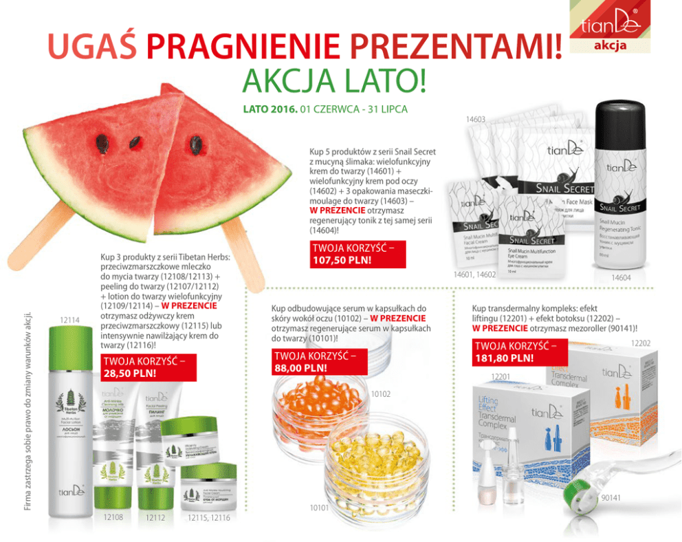 UGAŚ PRAGNIENIE PREZENTAMI! akcja AKCJA LATO! LATO 2016. 01 CZERWCA - 31 LIPCA 14603 Firma zastrzega sobie prawo do zmiany warunków akcji. Kup 5 produktów z serii Snail Secret z mucyną ślimaka: wielofunkcyjny krem do twarzy (14601) + wielofunkcyjny krem pod oczy (14602) + 3 opakowania maseczkimoulage do twarzy (14603) – W PREZENCIE otrzymasz regenerujący tonik z tej samej serii (14604)! 12114 Kup 3 produkty z serii Tibetan Herbs: przeciwzmarszczkowe mleczko do mycia twarzy (12108/12113) + peeling do twarzy (12107/12112) + lotion do twarzy wielofunkcyjny (12109/12114) – W PREZENCIE otrzymasz odżywczy krem przeciwzmarszczkowy (12115) lub intensywnie nawilżający krem do twarzy (12116)! Twoja korzyść – 28,50 PLN! Twoja korzyść – 107,50 PLN! 14601, 14602 Kup odbudowujące serum w kapsułkach do skóry wokół oczu (10102) – W PREZENCIE otrzymasz regenerujące serum w kapsułkach do twarzy (10101)! Twoja korzyść – 88,00 PLN! 14604 Kup transdermalny kompleks: efekt liftingu (12201) + efekt botoksu (12202) – W PREZENCIE otrzymasz mezoroller (90141)! 12202 Twoja korzyść – 181,80 PLN! 12201 10102 12108 12112 12115, 12116 10101 90141 Kup kosmetyczkę czerwoną (100653) lub złotą (100653/01) – W PREZENCIE otrzymasz płatki do zmywania lakieru (90140)! Twoja korzyść – 15,00 PLN! 100653/01, 100653 Kup 3 produkty z serii Master Herb: żel do mycia twarzy (11319) + fito-korektor (11322) + krem przeciw zaskórnikom i bliznom (11323) – W PREZENCIE otrzymasz żel „Aloe vera” (14701)! Twoja korzyść – 71,00 PLN! 11322 11323 11319 14701 14901-14905 Kup dowolny krem do twarzy z serii «Asian Beauty» (14901-14905) + mleczko do mycia twarzy „Algi morskie“ (10204) – W PREZENCIE otrzymasz krem do rąk „Tropikalny Noni“ (14906)! 90140 Twoja korzyść – 16,90 PLN! 10204 14906 Kup tusz do rzęs „Mascara” (80203) – W PREZENCIE otrzymasz eye-liner do powiek “City Style” (80407)! Twoja korzyść – 19,10 PLN! Kup puder sypki „City Chic” (80807) – W PREZENCIE otrzymasz dowolny balsam owocowy do ust (80112)! Twoja korzyść – 11,70 PLN! 80203 80407 80807 80112 33701-33704 Twoja korzyść – 43,70 PLN! Firma zastrzega sobie prawo do zmiany warunków akcji. Kup 2 kostki ręcznie robionego naturalnego mydła spośród: „Orzeźwiająca cytryna” (140101), „Bella Rosa” (140102), „Lawenda” (140103), „Zielone jabłko” (140104) – W PREZENCIE otrzymasz krem do rąk „Złoty żeń-szeń“ (40111)! akcja Kup dowolny produkt z serii «Bio Rehab» (23401-23403) – W PREZENCIE otrzymasz jeden z produktów z serii Pro Botanic: fito-maseczkę do twarzy «Komfort i blask» (14704) lub szampon roślinny „Siła włosów” (14708) lub maskę roślinną z argininą „Siła włosów” (14709)! 23401-23403 20131, 20133 20125, 20126, 20128 Kup szampon “Nokturn jaśminowy” (20131) lub “Rapsodia miłości” (20133) + dowolny kremowy żel pod prysznic z serii Dolce Vita (33701-33704) – W PREZENCIE otrzymasz kremowy balsam do włosów „Zielona herbata“ (20125) lub „Ananas” (20126) lub „Jujube” (20128)! Twoja korzyść – 18,20 PLN lub 14,80 PLN! 14704, 14708, 14709 140101-140104 Kup szampon odmładzający z ekstraktem z ziół Shou Wu (20108) – W PREZENCIE otrzymasz maskę modelującą antyoksydacyjną „Zielona herbata” z serii SPA technology (50222)! Twoja korzyść – 13,80 PLN! 30255 40111 Twoja korzyść – 22,00 PLN! 30254 Kup 2 maski do ciała: z solą z Morza Martwego (30254) + z popiołem wulkanicznym (30255) – W PREZENCIE otrzymasz kremową maskę odświeżającą do twarzy „Woda lodowcowa (50110)! Twoja korzyść – 9,50 PLN! 50110 20108 50222 Kup 2 kąpiele do stóp z serii Talasso: ziołową (42301) oraz tonizującą (42303) – W PREZENCIE otrzymasz pilnik do stóp „Master Quartz” (90202)! Twoja korzyść – 39,00 PLN! 42303 42301 Kup maskę detoksykacyjną z turmalinem do stóp (41326) – W PREZENCIE otrzymasz opakowanie masek do twarzy i szyi „Aktywny tlen“ (54101) lub „Pestki winogron (54102)! Twoja korzyść – 65,80 PLN! Kup ziołowy plaster do ciała „Dong Feng“ (30119) – W PREZENCIE otrzymasz ziołowy plaster do ciała „Tie Gao“ (30113)! 90202 30248, 30253 Kup kosmetyczne skarpetki żelowe „Hydrobalance” (40113) + jeden z peelingów z serii SPA technology: ogórkowy (30248) lub jabłkowy (30253) – W PREZENCIE otrzymasz kosmetyczne rękawiczki żelowe „Hydrobalance” (40114)! Twoja korzyść – 18,00 PLN! 30119 30113 Twoja korzyść – 51,30 PLN! Kup kule turmalinowe do prania (144301) – W PREZENCIE otrzymasz odmładzający krem do rąk z ekstraktem z Ling Zhi (40106)! Twoja korzyść – 25,00 PLN! 40113 40114 144301 40106 Компания оставляет за собой право изменять условия акций. 54101, 54102 41326