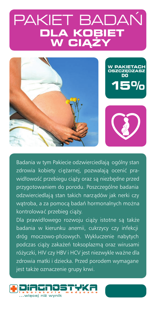 PAKIET BADAŃ DLA KOBIET W CIĄŻY W PAKIETACH OSZCZĘDZASZ DO 15% Badania w tym Pakiecie odzwierciedlają ogólny stan zdrowia kobiety ci ężarnej, pozwalają ocenić prawidłowość przebiegu ciąży oraz są niezbędne przed przygotowaniem do porodu. Poszczególne badania odzwierciedlają stan takich narządów jak nerki czy wątroba, a za pomocą badań hormonalnych można kontrolować przebieg ciąży. Dla prawidłowego rozwoju ciąży istotne są także badania w kierunku anemii, cukrzycy czy infekcji dróg moczowo-płciowych. Wykluczenie nabytych podczas ciąży zakażeń toksoplazmą oraz wirusami różyczki, HIV czy HBV i HCV jest niezwykle ważne dla zdrowia matki i dziecka. Przed porodem wymagane jest także oznaczenie grupy krwi. PAKIET BADAŃ DLA KOBIET W CIĄŻY OBEJMUJE: Mocz-badanie ogólne – jest podstawowym badaniem odzwierciedlającym funkcje układu moczowego służącym do wykrywania m.in. chorób nerek i zakażeń układu moczowo-płciowego. Zakażenia układu moczowego są jedną z głównych przyczyn powikłań położniczych. Morfologia krwi – całościowa analiza wszystkich rodzajów komórek krwi (czerwonych, bia łych i płytek). Badanie służące do oceny ogólnego stanu zdrowia i stanowi ące podstawę rozpoznania wielu chorób m.in. anemii, zaburzeń krzepnięcia krwi, niedoborów odporności czy infekcji. Większość chorób powoduje widoczne zmiany w morfologii krwi. Glukoza – podstawowe badanie w rozpoznawaniu cukrzycy. Jej wczesne rozpoznanie i prawid łowe leczenie jest niezwykle waż ne dla zdrowia ciężarnej i jej przyszłego dziecka. ALT, ALP – próby wątrobowe oceniające funkcje wątroby i dróg żółciowych. Kreatynina – podwyższone wyniki wskazują na choroby nerek. Żelazo – nieprawidłowy, niski poziom żelaza może świadczyć o niewystarczającej podaży żelaza lub jego złym przyswajaniu. Wynikiem niedoboru żelaza może być anemia związana z patologią ciąży. Grupa krwi z kartą identyfikacyjną (2 ozn.) – niezbędne badanie przed porodem. Raz wykonana karta grupy krwi jest przydatna i wa żna do końca życia. www.diag.pl Progesteron – badanie hormonu odpowiedzialnego m.in. za „utrzymanie ciąży”. Beta HCG – badanie wykonuje się w celu potwierdzenia ciąży oraz monitorowania jej przebiegu. HBs przeciwcła a (anty-HBs) – badanie pozwalające ocenić potrzebę powtórnego szczepienia przeciw żółtaczce typu B, a u osób nie szczepionych wynik dodatni wskazuje na kontakt z wirusem HBV (wirus zapalenia wątroby typu B) i potrzeb ę specjalistycznej diagnostyki. HCV przeciwcła (anty-HCV) – badanie pozwalające stwierdzić kontakt z wirusem HCV (wirus zapalenia wątroby typu C). HIV – badanie w kierunku zakażenia wirusem HIV, niezbędne przed porodem. USR– badanie w kierunku wykrycia zakażenia jedną z chorób wenerycznych (badanie wymagane przed przyj ęciem do szpitala). Toksoplazmoza IgM – wynik ujemny wyklucza zakażenie w ciąży pasożytem Toxoplasma gondii. Toksoplazmoza przebyta w ciąży jest bardzo niebezpieczna dla płodu oraz może być przyczyną problemów w przebiegu ciąży. Różyczka IgM – wynik ujemny wyklucza zakażenie w ciąży wirusem różyczki. www.diag.pl Pełnej informacji o ofercie oraz adresów Punktów Pobrań szukaj na www.diag.pl i www.pakiety.diag.pl