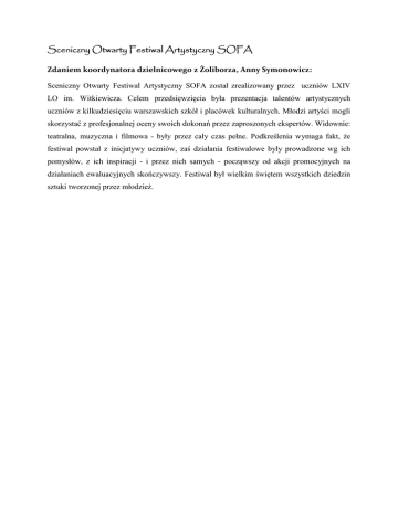 Sceniczny Otwarty Festiwal Artystyczny SOFA Zdaniem koordynatora dzielnicowego z Żoliborza, Anny Symonowicz: Sceniczny Otwarty Festiwal Artystyczny SOFA został zrealizowany przez uczniów LXIV LO im. Witkiewicza. Celem przedsięwzięcia była prezentacja talentów artystycznych uczniów z kilkudziesięciu warszawskich szkół i placówek kulturalnych. Młodzi artyści mogli skorzystać z profesjonalnej oceny swoich dokonań przez zaproszonych ekspertów. Widownie: teatralna, muzyczna i filmowa - były przez cały czas pełne. Podkreślenia wymaga fakt, że festiwal powstał z inicjatywy uczniów, zaś działania festiwalowe były prowadzone wg ich pomysłów, z ich inspiracji - i przez nich samych - począwszy od akcji promocyjnych na działaniach ewaluacyjnych skończywszy. Festiwal był wielkim świętem wszystkich dziedzin sztuki tworzonej przez młodzież.