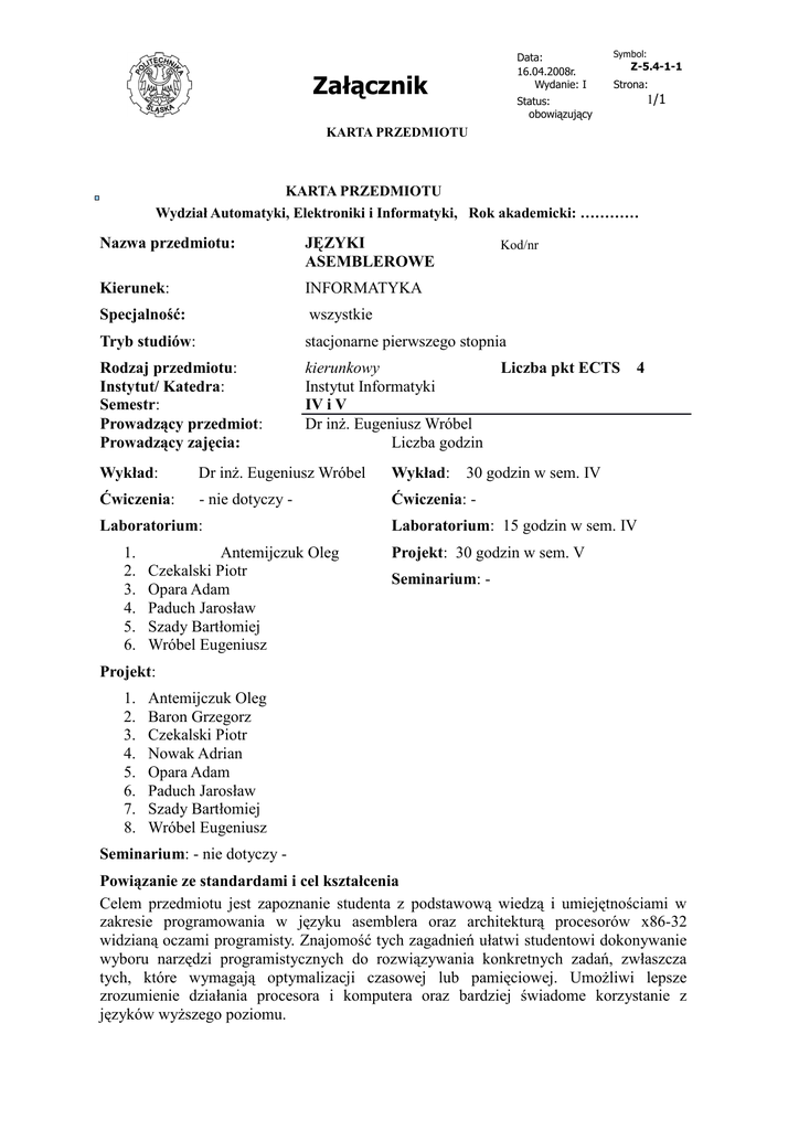 Data: 16.04.2008r. Wydanie: I Załącznik Symbol: Z-5.4-1-1 Strona: 1/1 Status: obowiązujący KARTA PRZEDMIOTU KARTA PRZEDMIOTU Wydział Automatyki, Elektroniki i Informatyki, Rok akademicki: ………… Nazwa przedmiotu: JĘZYKI ASEMBLEROWE Kierunek: INFORMATYKA Specjalność: wszystkie Tryb studiów: stacjonarne pierwszego stopnia Rodzaj przedmiotu: Instytut/ Katedra: Semestr: Prowadzący przedmiot: Prowadzący zajęcia: kierunkowy Instytut Informatyki IV i V Dr inŜ. Eugeniusz Wróbel Liczba godzin Kod/nr Wykład: Dr inŜ. Eugeniusz Wróbel Wykład: Ćwiczenia: - nie dotyczy - Ćwiczenia: - Laboratorium: 1. 2. 3. 4. 5. 6. Antemijczuk Oleg Czekalski Piotr Opara Adam Paduch Jarosław Szady Bartłomiej Wróbel Eugeniusz Liczba pkt ECTS 4 30 godzin w sem. IV Laboratorium: 15 godzin w sem. IV Projekt: 30 godzin w sem. V Seminarium: - Projekt: 1. 2. 3. 4. 5. 6. 7. 8. Antemijczuk Oleg Baron Grzegorz Czekalski Piotr Nowak Adrian Opara Adam Paduch Jarosław Szady Bartłomiej Wróbel Eugeniusz Seminarium: - nie dotyczy Powiązanie ze standardami i cel kształcenia Celem przedmiotu jest zapoznanie studenta z podstawową wiedzą i umiejętnościami w zakresie programowania w języku asemblera oraz architekturą procesorów x86-32 widzianą oczami programisty. Znajomość tych zagadnień ułatwi studentowi dokonywanie wyboru narzędzi programistycznych do rozwiązywania konkretnych zadań, zwłaszcza tych, które wymagają optymalizacji czasowej lub pamięciowej. UmoŜliwi lepsze zrozumienie działania procesora i komputera oraz bardziej świadome korzystanie z języków wyŜszego poziomu. Załącznik Data: 16.04.2008r. Wydanie: I Status: obowiązujący Symbol: Z-5.4-1-1 Strona: 2/1 KARTA PRZEDMIOTU Przedmioty wprowadzające oraz wymagania wstępne Teoria Układów cyfrowych, Arytmetyka systemów cyfrowych, Podstawy programowania komputerów, Konstrukcja układów cyfrowych Treść wykładów: • Wprowadzenie. Miejsce języka symbolicznego (asemblera) we współczesnej informatyce oraz w hierarchii języków programowania. Mity i fakty na temat asemblera. MASM, TASM, NASM. • Architektura mikroprocesorów rodziny x86-32 widziana oczami programisty. Od procesora 8086 do Core i7. Rejestry, znaczniki, organizacja pamięci operacyjnej, adres logiczny fizyczny, liniowy, tryby adresowania, praca procesora w róŜnych trybach, adresowanie układów we/wy, przerwania i "wyjątki", typy danych. • Ogólna charakterystyka listy rozkazów rodziny procesorów Intela x86-32. Formaty rozkazów, podstawowe rozkazy procesora, rozkazy sterujące. • Koprocesor arytmetyczny, technologia MMX i SSE. Arytmetyka zmiennoprzecinkowa , rozszerzenia MMX, SSE, SSE2, SSE3, SSSE3, SSE4, AVX. (Rozszerzenia procesorów firmy AMD). • Ogólna charakterystyka języka makroasemblera. Podstawowe elementy języka, stałe, nazwy symboliczne, składnia wiersza programu, słowa kluczowe, dyrektywy i pseudoinstrukcje. • Wybrane dyrektywy i pseudoinstrukcje. Tworzenie segmentów logicznych, asemblacja warunkowa, makroinstrukcje, przydział danych, połączenia międzymodułowe, struktury danych i rekordy, łańcuchy, bloki powtarzane, sterowanie postacią listingu, procedury, błędy warunkowe, inne. • Symbole, wyraŜenia i operatory, symbole predefiniowane. • Narzędzia. Program asemblera, narzędzia pomocnicze. • MASM w wersji dla systemu operacyjnego MS DOS oraz Windows. • Łączenie modułów asemblerowych z programem w języku wyŜszego poziomu. • Optymalizacja kodu programu. Kryteria optymalizacji, zasady ogólne, czas wykonania a zajętość pamięci, Optymalizacja dla rodziny procesorów Intela. • Przykłady (wplecione przy okazji róŜnych omawianych tematów szczegółowych) Data: 16.04.2008r. Wydanie: I Załącznik Status: obowiązujący Symbol: Z-5.4-1-1 Strona: 3/1 KARTA PRZEDMIOTU Treść/Tematy: Ćw./L./P./Sem. Laboratorium: 1. Prosty program asemblerowy w środowisku MSDOS (Skrypt [1] ćw.1) 2. Program uruchomieniowy. Przykłady uŜycia rozkazów procesora (Skrypt [1] ćw. 2 i 3) 3. Prosty program asemblerowy w środowisku Windows (Skrypt [1] ćw. 4) 4. Struktura programu z jednym oknem głównym (Skrypt [1] ćw. 5) 5. Program asemblerowy w Visual Studio 2008, łączenie modułów w języku asemblerowym z programem w języku C. Projekt: Indywidualny kompletny projekt w języku asemblerowym przygotowany w Visual Studio 2008 (z wykorzystaniem mechanizmu łączenia modułów w asemblerze oraz C oraz technik bibliotek typu dll) lub w MASM32. Metody dydaktyczne Wykład ilustrowany prezentacja multimedialną, slajdy z wykładów udostępnione na stronie internetowej przedmiotu. W laboratorium 1-2 osoby przy jednym stanowisku. Projekt realizowany indywidualnie przez kaŜdego studenta. Obrona projektów w formie prezentacji multimedialnej. Forma egzaminu/zaliczenia przedmiotu 1. Wykład — egzamin pisemny 2. Laboratorium – indywidualne kolokwium na koniec semestru sprawozdania z poszczególnych ćwiczeń, 3. Projekt – obrona projektu (prezentacja programu, pełna dokumentacja programu) Minimalne wymagania do egzaminu /zaliczenia Egzamin pisemny 4-częściowy: a) Test wielokrotnego wyboru (zagadnienia teoretyczne z zakresu języka asemblera oraz listy rozkazów procesora) b) Analiza fragmentu programu c) Synteza niewielkiej procedury według zadanego algorytmu d) Cztery pytania problemowe wymagające pisemnej odpowiedzi opisowej Data: 16.04.2008r. Wydanie: I Załącznik Symbol: Z-5.4-1-1 Strona: Status: obowiązujący 4/1 KARTA PRZEDMIOTU Literatura (podstawowa i specjalistyczna) 1. Wróbel Eugeniusz „Programowanie w języku asemblera MASM. Laboratorium”, Wydawnictwo Politechniki Śląskiej, Gliwice 2005 2. Wróbel Eugeniusz „Asembler. Praktyczny kurs”, Wydawnictwo Helion, Gliwice 2004. 3. Wróbel Eugeniusz (pod red.) „Asembler. Ćwiczenia praktyczne”, Wydawnictwo Helion, Gliwice 2002. 4. Vlad Pirogov „Asembler. Podręcznik programisty”, Wydawnictwo Helion, Gliwice 2005 5. Microsoft Macro 