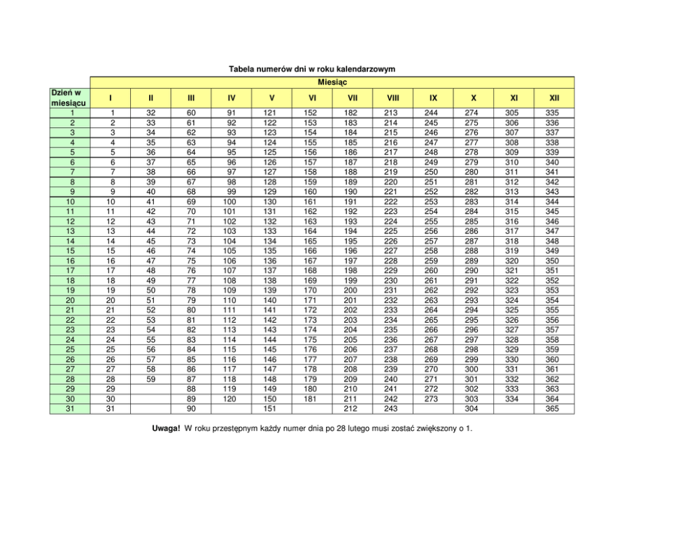 Tabela numerów dni w roku kalendarzowym Miesiąc Dzień w miesiącu 1 2 3 4 5 6 7 8 9 10 11 12 13 14 15 16 17 18 19 20 21 22 23 24 25 26 27 28 29 30 31 I II III IV V VI VII VIII IX X XI XII 1 2 3 4 5 6 7 8 9 10 11 12 13 14 15 16 17 18 19 20 21 22 23 24 25 26 27 28 29 30 31 32 33 34 35 36 37 38 39 40 41 42 43 44 45 46 47 48 49 50 51 52 53 54 55 56 57 58 59 60 61 62 63 64 65 66 67 68 69 70 71 72 73 74 75 76 77 78 79 80 81 82 83 84 85 86 87 88 89 90 91 92 93 94 95 96 97 98 99 100 101 102 103 104 105 106 107 108 109 110 111 112 113 114 115 116 117 118 119 120 121 122 123 124 125 126 127 128 129 130 131 132 133 134 135 136 137 138 139 140 141 142 143 144 145 146 147 148 149 150 151 152 153 154 155 156 157 158 159 160 161 162 163 164 165 166 167 168 169 170 171 172 173 174 175 176 177 178 179 180 181 182 183 184 185 186 187 188 189 190 191 192 193 194 195 196 197 198 199 200 201 202 203 204 205 206 207 208 209 210 211 212 213 214 215 216 217 218 219 220 221 222 223 224 225 226 227 228 229 230 231 232 233 234 235 236 237 238 239 240 241 242 243 244 245 246 247 248 249 250 251 252 253 254 255 256 257 258 259 260 261 262 263 264 265 266 267 268 269 270 271 272 273 274 275 276 277 278 279 280 281 282 283 284 285 286 287 288 289 290 291 292 293 294 295 296 297 298 299 300 301 302 303 304 305 306 307 308 309 310 311 312 313 314 315 316 317 318 319 320 321 322 323 324 325 326 327 328 329 330 331 332 333 334 335 336 337 338 339 340 341 342 343 344 345 346 347 348 349 350 351 352 353 354 355 356 357 358 359 360 361 362 363 364 365 Uwaga! W roku przestępnym każdy numer dnia po 28 lutego musi zostać zwiększony o 1.