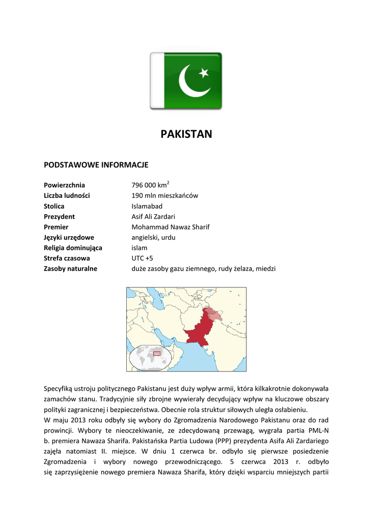 PAKISTAN PODSTAWOWE INFORMACJE Powierzchnia Liczba ludności Stolica Prezydent Premier Języki urzędowe Religia dominująca Strefa czasowa Zasoby naturalne 796 000 km2 190 mln mieszkańców Islamabad Asif Ali Zardari Mohammad Nawaz Sharif angielski, urdu islam UTC +5 duże zasoby gazu ziemnego, rudy żelaza, miedzi Specyfiką ustroju politycznego Pakistanu jest duży wpływ armii, która kilkakrotnie dokonywała zamachów stanu. Tradycyjnie siły zbrojne wywierały decydujący wpływ na kluczowe obszary polityki zagranicznej i bezpieczeństwa. Obecnie rola struktur siłowych uległa osłabieniu. W maju 2013 roku odbyły się wybory do Zgromadzenia Narodowego Pakistanu oraz do rad prowincji. Wybory te nieoczekiwanie, ze zdecydowaną przewagą, wygrała partia PML-N b. premiera Nawaza Sharifa. Pakistańska Partia Ludowa (PPP) prezydenta Asifa Ali Zardariego zajęła natomiast II. miejsce. W dniu 1 czerwca br. odbyło się pierwsze posiedzenie Zgromadzenia i wybory nowego przewodniczącego. 5 czerwca 2013 r. odbyło się zaprzysiężenie nowego premiera Nawaza Sharifa, który dzięki wsparciu mniejszych partii mógł utworzyć rząd samodzielnie. Zamierza on pełnić także funkcje ministra obrony i spraw zagranicznych. Nawaz Sharif zaapelował do przywódców innych partii o współpracę przy rozwiązywaniu najważniejszych problemów państwa. Dość spokojnie przebiegł też proces tworzenia rządów prowincji. Trudniej jest na razie przewidzieć, jak będą się kształtować relacje nowego rządu z dwoma kluczowymi instytucjami państwowymi, jakimi są armia oraz Sąd Najwyższy. Podstawowe informacje na temat Pakistanu Dziesięciolecia wewnętrznych sporów politycznych i niski poziom inwestycji zagranicznych doprowadziły do spowolnienia wzrostu. Rolnictwo stanowi ponad 1/5 PKB i daje dwie piąte zatrudnienia. Tekstylia stanowią większość dochodów z eksportu. Kraj nie potrafił rozszerzyć realnej bazy eksportowej i jest podatny na wahania popytu światowego. Oficjalna stopa bezrobocia wynosi poniżej 6%, lecz nie jest to właściwy obraz ponieważ duża część gospodarki jest w szarej strefie. W ciągu ostatnich kilku lat, niski wzrost i wysoka inflacja, doprowadziły do wzrostu cen żywności. Wzrosła tym samym stopa ubóstwa – wg ocen UN Human Development Report w 2011 roku wyniosła ona prawie 50% populacji. Inflacja jeszcze pogorszyła sytuację, wzrost z 7,7% w 2007 r. do prawie 12% w 2011 r., po czym spadła do 10% w 2012 roku. W wyniku niestabilności politycznej i gospodarczej, rupia pakistańska osłabiła się o ponad 40% od 2007 roku. W listopadzie 2008 r rząd zwrócił się do Międzynarodowego Funduszu Walutowego o pomoc dla załagodzenia kryzysu bilansu płatniczego. Chociaż gospodarka ustabilizowała się od kryzysu, to nie udało się odzyskać poprzedniego poziomu. Inwestycje zagraniczne nie powróciły, ze względu na obawy inwestorów związane z zarządzaniem, problemami z energią, sprawami bezpieczeństwa i generalnego spowolnienia w gospodarce światowej. Stałym źródłem przychodów są transfery z zagranicy, średnio około 1 mld dolarów miesięcznie od marca 2011. Mimo niewielkiej nadwyżki na rachunku obrotów bieżących w roku obrotowym 2011 (lipiec 2010/czerwiec 2011), w roku fiskalnym 2012 znów odnotowano deficyt. Było to spowodowane wyższymi cenami importowanej ropy i niższymi wpływami z eksportu bawełny. Pakistan notuje niskie dochody przy stosunkowo niskim poziomie wzrostu - średnio ok. 3% rocznie w okresie 2008 do 2012. Pakistan musi zreformował budżet państwa i inwestować w produkcję energii w celu pobudzenia wzrostu gospodarczego. Będzie to konieczne dla zapewnienia miejsc pracy rosnącej liczbie ludności, z której ponad 50% ma poniżej 22 lat. Inne długoterminowe wyzwania obejmują zwiększenie inwestycji w edukację i ochronę zdrowia, adaptacji do skutków zmian klimatycznych i klęsk żywiołowych oraz zmniejszenie uzależnienia od darczyńców zagranicznych. Eksport w 2012r. wyniósł 24,63 mld USD (tekstylia - odzież, pościel, tkaniny bawełniane, przędza, ryż, wyroby skórzane, artykuły sportowe, chemikalia, produkcja dywanów i chodników Główni partnerzy: USA (13,3 %), Chiny (10,9 %), ZEA (8,6%), Afganistan(8,5%). Import w 2012 r. wyniósł 39,81 mld USD (ropa naftowa, produkty naftowe, maszyny, tworzywa sztuczne, sprzęt transportowy, oleje jadalne, papieru i tektury, żelaza i stali, herbata Główni partnerzy: Chiny (19,8 %), Arabia Saudyjska (22 %), ZEA (11,9%), Kuwejt (6,2 %), Główne wskaźniki makroekonomiczne Wskaźnik 2010 r. 2011 r. 2012 r. PKB (wg parytetu siły nabywczej PPP (mld $) 490.4 505.3 523.9 PKB na 1 mieszkańca (wg PPP, tys. $) 2,900 2,900 2,900 Wzrost PKB (w %) 3.1 3 3.7 Zadłużenie zagraniczne (mld $) bd 60.18 56.19 48,6 49,4 50,7 Inflacja (w %) bd 11,9 9,7 Stopa bezrobocia (w %) bd 5.6 6.2 Wartość obrotów HZ (mln $) bd 65,16 64,44 Eksport towarów (mld $) bd 26.31 24.63 Import towarów (mld $) bd 38.85 39.81 Rezerwy walutowe, wł.złoto (mld $) bd 18.09 13.8 Całkowity dług publiczny (% PKB) Dane za 2012 r. wykazały obroty handlowe na poziomie 235,59 mln USD (z czego na eksport przypada około 78,09 mln USD, na import 157,50 mln USD). Pomimo spadku w obrotach należy odnotować dynamikę wzrostu eksportu - wyniosła w tym okresie 18%. Podobną dynamikę odnotowaliśmy w okresie 2011/10. Może to oznaczać zwiększające się zainteresowanie rynkiem pakistańskim ze strony polskich przedsiębiorców. Tabela - obroty handlowe Polski i Pakistanu Dynamika Rok Obroty Eksport Import Saldo 2008 205,8 62,5 143,3 - 80,8 2009 183,3 64,1 119,2 - 55,1 2010 199,1 57,5 141,6 - 84,1 2011 257,7 65,7 192,0 - 126,3 2012 235,59 78,09 157,50 -79,40 Dominującymi pozycjami w polskim eksporcie do Pakistanu w 2012 roku były: 2012/2011 89,98 118,96 80,28 x - Wyroby nieszlachetne i wyroby z metali nieszlachetnych (odpady i złom z żeliwa i stali, maszynki do golenia z niewymiennymi ostrzam