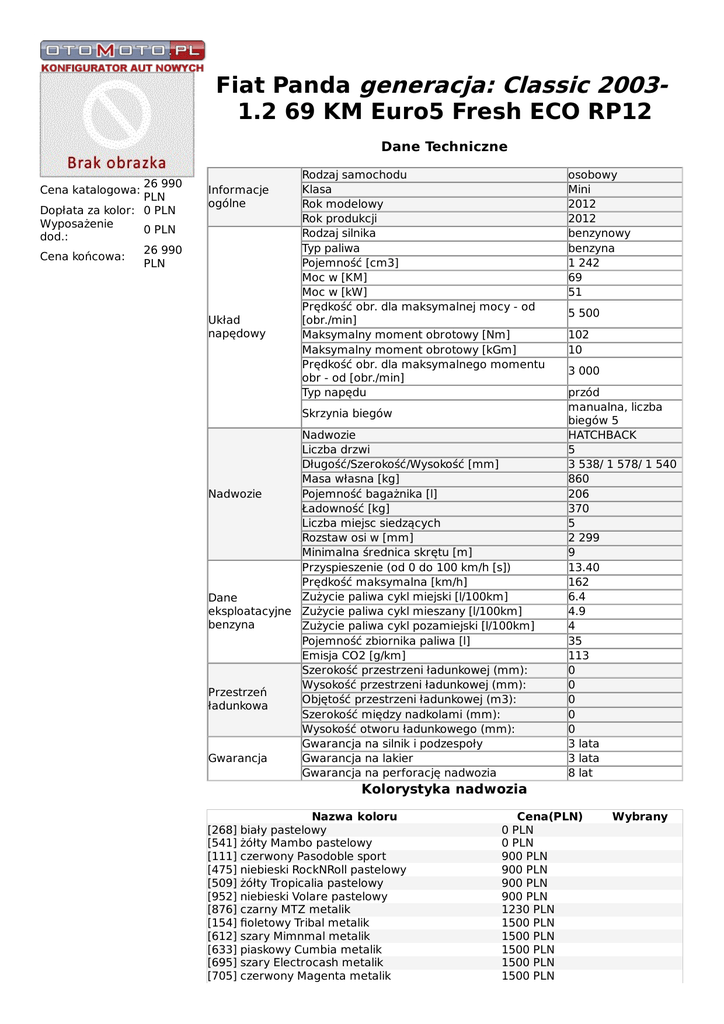 Fiat Panda generacja: Classic 20031.2 69 KM Euro5 Fresh ECO RP12 Dane Techniczne 26 990 PLN Dopłata za kolor: 0 PLN Wyposażenie 0 PLN dod.: 26 990 Cena końcowa: PLN Cena katalogowa: Informacje ogólne Układ napędowy Rodzaj samochodu Klasa Rok modelowy Rok produkcji Rodzaj silnika Typ paliwa Pojemność [cm3] Moc w [KM] Moc w [kW] Prędkość obr. dla maksymalnej mocy - od [obr./min] Maksymalny moment obrotowy [Nm] Maksymalny moment obrotowy [kGm] Prędkość obr. dla maksymalnego momentu obr - od [obr./min] Typ napędu Skrzynia biegów Nadwozie Liczba drzwi Długość/Szerokość/Wysokość [mm] Masa własna [kg] Nadwozie Pojemność bagażnika [l] Ładowność [kg] Liczba miejsc siedzących Rozstaw osi w [mm] Minimalna średnica skrętu [m] Przyspieszenie (od 0 do 100 km/h [s]) Prędkość maksymalna [km/h] Zużycie paliwa cykl miejski [l/100km] Dane eksploatacyjne Zużycie paliwa cykl mieszany [l/100km] benzyna Zużycie paliwa cykl pozamiejski [l/100km] Pojemność zbiornika paliwa [l] Emisja CO2 [g/km] Szerokość przestrzeni ładunkowej (mm): Wysokość przestrzeni ładunkowej (mm): Przestrzeń Objętość przestrzeni ładunkowej (m3): ładunkowa Szerokość między nadkolami (mm): Wysokość otworu ładunkowego (mm): Gwarancja na silnik i podzespoły Gwarancja Gwarancja na lakier Gwarancja na perforację nadwozia osobowy Mini 2012 2012 benzynowy benzyna 1 242 69 51 5 500 102 10 3 000 przód manualna, liczba biegów 5 HATCHBACK 5 3 538/ 1 578/ 1 540 860 206 370 5 2 299 9 13.40 162 6.4 4.9 4 35 113 0 0 0 0 0 3 lata 3 lata 8 lat Kolorystyka nadwozia [268] [541] [111] [475] [509] [952] [876] [154] [612] [633] [695] [705] Nazwa koloru biały pastelowy żółty Mambo pastelowy czerwony Pasodoble sport niebieski RockNRoll pastelowy żółty Tropicalia pastelowy niebieski Volare pastelowy czarny MTZ metalik fioletowy Tribal metalik szary Mimnmal metalik piaskowy Cumbia metalik szary Electrocash metalik czerwony Magenta metalik Cena(PLN) 0 PLN 0 PLN 900 PLN 900 PLN 900 PLN 900 PLN 1230 PLN 1500 PLN 1500 PLN 1500 PLN 1500 PLN 1500 PLN Wybrany [792] błękitny Surf metalik 1500 PLN Wyposażenie standardowe Nazwa elementu ABS + EBD boczki drzwi z tworzywa sztucznego czarne nakładki słupków drzwi cztery zagłówki (przód: 2, tył: 2) czujnik zapięcia pasów fotel pasażera z regulacją przód/tył, oparcie regulowane płynnie, pokrycie przegubó w gaśnica immobiliser Fiat Code lusterka boczne regulowane manualnie opony 155/80 R13 osłona chłodnicy w kolorze czarnym oświetlenie wnętrza pełnowymiarowe koło zapasowe poduszka powietrzna kierowcy pokrywa bagażnika otwierana kluczem przednie pasy bezpieczeństwa ze zwijaczem; napinaczem pirotechnicznym i ogranicznikiem napięcia punkty mocowania relingów dachowych reflektory przednie z funkcją Follow Me Home siedzenie tylne niedzielone; możliwe złożenie oparcia w całości system przeciwpożarowy FPS (układ zapobiegający wystąpieniu pożaru w następstwie kolizji) szyby atermiczne trójkąt ostrzegawczy tylna szyba ogrzewana wentylacja wnętrza z funkcją recyrkulacji powietrza wycieraczka tylnej szyby wycieraczki przedniej szyby ze spryskiwaczem półautomatycznym zderzaki w kolorze nadwozia zestaw wskaźników bazowy (prędkościomierz analogowy, temperatura płynu chłodzenia, poziom paliwa, licznik kilometrów całkowity/dzienny, zegar cyfrowy, korektor ustawienia świateł, kontrolki awaryjne i ostrzegawcze układów bezpieczeństwa czynnego) Wyposażenie dodatkowe Lista wyposażenia dodatkowego [008] centralny zamek sterowany pilotem [082] przystosowanie do montażu radia [097] światła przeciwmgielne [315] radioodtwarzacz CD zintegrowany FUN [357] relingi dachowe [392] ESP + ASR/MSR + HBA + Hill Holder [428] elektrycznie sterowane szyby przednie i centralny zamek [803] dojazdowe koło zapasowe [823] gniazdo z zasilaniem 12v w bagażniku [890] Pakiet Komfort (uchwyt dla pasażera z przodu, dwa z tyłu, regulacja wysokości przednich pasów bezpieczeństwa) [927] listwy boczne [989] Pakiet Konsola Środkowa (zapalniczka + popielniczka + uchwyt na napoje) Cena 500 PLN 500 PLN 700 PLN 1000 PLN 800 PLN 2500 PLN 1200 PLN 0 PLN 200 PLN 300 PLN 300 PLN 200 PLN Wybrany