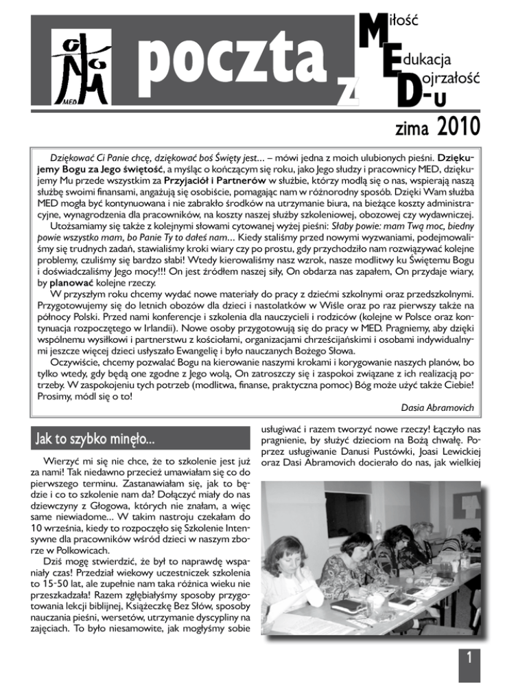 zima 2010 Dziękować Ci Panie chcę, dziękować boś Święty jest... – mówi jedna z moich ulubionych pieśni. Dziękujemy Bogu za Jego świętość, a myśląc o kończącym się roku, jako Jego słudzy i pracownicy MED, dziękujemy Mu przede wszystkim za Przyjaciół i Partnerów w służbie, którzy modlą się o nas, wspierają naszą służbę swoimi finansami, angażują się osobiście, pomagając nam w różnorodny sposób. Dzięki Wam służba MED mogła być kontynuowana i nie zabrakło środków na utrzymanie biura, na bieżące koszty administracyjne, wynagrodzenia dla pracowników, na koszty naszej służby szkoleniowej, obozowej czy wydawniczej. Utożsamiamy się także z kolejnymi słowami cytowanej wyżej pieśni: Słaby powie: mam Twą moc, biedny powie wszystko mam, bo Panie Ty to dałeś nam... Kiedy staliśmy przed nowymi wyzwaniami, podejmowaliśmy się trudnych zadań, stawialiśmy kroki wiary czy po prostu, gdy przychodziło nam rozwiązywać kolejne problemy, czuliśmy się bardzo słabi! Wtedy kierowaliśmy nasz wzrok, nasze modlitwy ku Świętemu Bogu i doświadczaliśmy Jego mocy!!! On jest źródłem naszej siły, On obdarza nas zapałem, On przydaje wiary, by planować kolejne rzeczy. W przyszłym roku chcemy wydać nowe materiały do pracy z dziećmi szkolnymi oraz przedszkolnymi. Przygotowujemy się do letnich obozów dla dzieci i nastolatków w Wiśle oraz po raz pierwszy także na północy Polski. Przed nami konferencje i szkolenia dla nauczycieli i rodziców (kolejne w Polsce oraz kontynuacja rozpoczętego w Irlandii). Nowe osoby przygotowują się do pracy w MED. Pragniemy, aby dzięki wspólnemu wysiłkowi i partnerstwu z kościołami, organizacjami chrześcijańskimi i osobami indywidualnymi jeszcze więcej dzieci usłyszało Ewangelię i było nauczanych Bożego Słowa. Oczywiście, chcemy pozwalać Bogu na kierowanie naszymi krokami i korygowanie naszych planów, bo tylko wtedy, gdy będą one zgodne z Jego wolą, On zatroszczy się i zaspokoi związane z ich realizacją potrzeby. W zaspokojeniu tych potrzeb (modlitwa, finanse, praktyczna pomoc) Bóg może użyć także Ciebie! Prosimy, módl się o to! Dasia Abramovich Jak to szybko minęło... Wierzyć mi się nie chce, że to szkolenie jest już za nami! Tak niedawno przecież umawiałam się co do pierwszego terminu. Zastanawiałam się, jak to będzie i co to szkolenie nam da? Dołączyć miały do nas dziewczyny z Głogowa, których nie znałam, a więc same niewiadome… W takim nastroju czekałam do 10 września, kiedy to rozpoczęło się Szkolenie Intensywne dla pracowników wśród dzieci w naszym zborze w Polkowicach. Dziś mogę stwierdzić, że był to naprawdę wspaniały czas! Przedział wiekowy uczestniczek szkolenia to 15-50 lat, ale zupełnie nam taka różnica wieku nie przeszkadzała! Razem zgłębiałyśmy sposoby przygotowania lekcji biblijnej, Książeczkę Bez Słów, sposoby nauczania pieśni, wersetów, utrzymanie dyscypliny na zajęciach. To było niesamowite, jak mogłyśmy sobie usługiwać i razem tworzyć nowe rzeczy! Łączyło nas pragnienie, by służyć dzieciom na Bożą chwałę. Poprzez usługiwanie Danusi Pustówki, Joasi Lewickiej oraz Dasi Abramovich docierało do nas, jak wielkiej 1 rzeczy się podjęłyśmy oraz że nauczanie dzieci to nic innego, jak zdobywanie dusz dla Boga, dla Jego chwały i ich wiecznego ratunku! To jest cudowne! W czasie szkolenia wytworzyły się między nami serdeczne relacje! W ogóle nie czułyśmy, że jeszcze tak niedawno wcale się nie znałyśmy! Przywilejem było poznać Iwonkę, Danusię, Tereskę i Anetkę z Głogowa! One już są „nasze”, bo łączy nas jedno pragnienie: służenie dzieciom w miejscach, gdzie postawił nas BÓG ! I tak niepostrzeżenie nadszedł dzień podsumowania szkolenia i egzamin z przygotowania lekcji biblijnej. Było dużo radości, śmiechu, ale też stresu (bo to przecież egzamin!!!). Każda z nas prezentowała swoją lekcję przed innymi, co pozwoliło nam wiele się nauczyć od siebie nawzajem, pokonać tremę i zyskać przekonanie, że poradzimy sobie stając przed dziećmi. Na zakończenie szkolenia, 6 listopada, otrzymałyśmy dyplomy. Ten ostatni wieczór był bardzo wzruszający. Po otrzymaniu dyplomów dzieliłyśmy się tym, co dało nam to szkolenie oraz modliłyśmy się o siebie nawzajem. Odczuwałyśmy powagę tej chwili, w której każda z nas została „wyprawiona” do służby. Dziękuję Bogu, że był z nami i zaplanował ten czas w naszym życiu! Dziękuję dziewczynom z MED-u za świetne przygotowanie tego szkolenia i dziewczynom z Głogowa, że chciały być z nami. Dziękuję też naszym „zborowym” dziewczynom, starszym i młodszym, że poświęciły swój cenny czas i postanowiły uczyć się i przygotować do służby, do której powołał nas Bóg! Zachęcam wszystkich do skorzystania z tego szkolenia, bo naprawdę WARTO!!! Joanna Ćwian, Polkowice XV Regionalna Konferencja dla Pracowników wśród Dzieci Tym razem konferencja połączona została z obchodami 20-lecia współpracy MED z kościołami i osobami indywidualnymi z województwa łódzkiego. Odbyła się 20 listopada br. w Ozorkowie. Wybraliśmy to miasto, gdyż tam po raz pierwszy 20 lat temu zawitali nasi pracownicy i wolontariusze, by we współpracy z miejscowym Kościołem Ewangelicko-Augsburskim poprowadzić wakacyjne kluby dla dzieci. W Ozorkowie MED ma także swojego pracownika – Monikę Stępień, a wspólna służba wśród dzieci kontynuowana jest tam do dnia dzisiejszego. Na Konferencji, oprócz wysłuchania wykładu na temat bycia sługą i przyjacielem Boga, wspólnego śpiewu pięknie prowadzonego przez zaprzyjaźnio- 2 ną z MED-em rodzinę z Łodzi, uczestnicy dzielili się świadectwami i wspomnieniami ze spotkań z dziećmi, szkoleń czy konferencji. W czasie oglądania prezentacji o spotkaniach z dziećmi w Zelowie, Zgierzu i Ozorkowie niejednemu z nas zakręciła się w ok