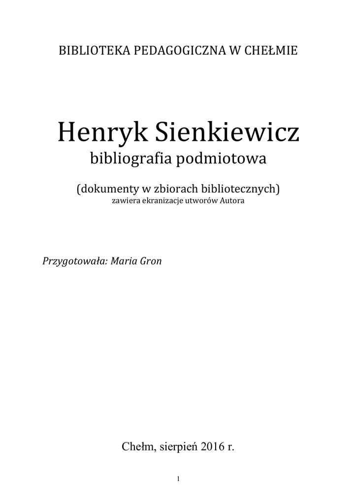 BIBLIOTEKA PEDAGOGICZNA W CHEŁMIE Henryk Sienkiewicz bibliografia podmiotowa (dokumenty w zbiorach bibliotecznych) zawiera ekranizacje utworów Autora Przygotowała: Maria Gron Chełm, sierpień 2016 r. 1 DRUKI ZWARTE Sienkiewicz, Henryk Bartek Zwycięzca / Henryk Sienkiewicz. - Warszawa : Państ. Inst. Wydaw., 1947. - 93, [1] s. [Opowiadanie polskie - 19 w.] sygnatura: 82-1/-9 Sie Sienkiewicz, Henryk Baśnie i legendy / Henryk Sienkiewicz ; wyboru dokonał, wstępem i przypisami opatrzył Tomasz Jodełka-Burzecki ; il. Józef Wilkoń. - Wyd. 4. - [Warszawa] : Lud. Spółdz. Wydaw., 1975. - 241, [3] s., [16] k. tabl. kolor. ; 20 cm sygnatura: 82-1/-9 Sie Sienkiewicz, Henryk Baśnie i legendy / Henryk Sienkiewicz ; wyboru dokonał, wstępem przypisami opatrzył Tomasz Jodełka-Burzecki ; il. Józef Wilkoń. - Wyd. 5. - [Warszawa] : Lud. Spółdz. Wydaw., 1978. - 251, [5] s. ; 17 cm sygnatura: 82-1/-9 Się Sienkiewicz, Henryk Bez dogmatu / Henryk Sienkiewicz ; [posł. Julian Krzyżanowski]. - [Wyd. 4 właśc. 5]. Warszawa : Państ. Inst. Wydaw., 1985. - 366, [2] s. ; 21 cm. - ISBN 83-06-01244-5. -Tekst na podst. wyd. : Dzieła t. 29 31, Warszawa 1949. - Dr. z diapoz. wyd. 1. sygnatura: 82-1/-9 Sie Szewczyk Dratewka : i inne polskie baśnie : lektura z opracowaniem / [aut. J. I. Kraszewki i in. ; oprac. baśni Mariola Jarocka ; oprac.Agnieszka Nożyńska-Demianiuk]. Poznań : Wydawnictwo IBIS, 2013. - 206, [2] s. ; 21 cm. - ISBN 978-83-7738-454-1. Zawiera: Szewczyk Dratewka ; Diabeł Boruta ; Jak to ze lnem było ; Kwiat paproci ; Szklana Góra ; Dwaj bracia: Waligóra i Wyrwidąb ; Chłop, co chodził do piekła z kiełbasą ; Czarodziejska studzienka ; Dlaczego woda morska jest słona? ; Diabelski napój ; O Bartku, który doktorem chciał być ; O parobku i diable ; Zaklęty skarb na dnie potoku ; Żywa woda ; Siostra siedmiu braci / oprac. M. Jarocka. Z chłopa król / J. I. Kraszewski. Madej / K. W. Wójcicki. O królu wężów i o walecznym a czystym młodzieńcu Perłowicu / J. Kasprowicz. Bajka / H. Sienkiewicz. Sobotnia Góra / R. Zmorski. O Panu Jezusie i zbójnikach / K. Przerwa-Tetmajer. O rycerzu miłującym / E. Orzeszkowa Bajka i baśń polska ; Opowiadanie dziecięce polskie sygnatura: 82-93 Sze Sienkiewicz, Henryk Janko Muzykant ; Latarnik / Henryk Sienkiewicz. - Wyd. 31. - Warszawa : Gebethner i Wolff, 1949. - 36 s. ; 21 cm sygnatura: 82-1/-9 Sie Sienkiewicz, Henryk Janko Muzykant / Henryk Sienkiewicz. - Warszawa : Państ. Inst. Wydaw., 1950. - 14 s. ; 17 cm sygnatura: 82-1/-9 Sie 2 Sienkiewicz, Henryk Janko Muzykant / Henryk Sienkiewicz. - Białystok : Kraj. Ag. Wydaw., 1991. - 14 s. ; 21 cm. - ISBN 83-03-03403-0. sygnatura: 82-1/-9 Sie Sienkiewicz, Henryk Janko Muzykant ; Latarnik / Henryk Sienkiewicz; czyta Beata Łuczak. [b. m.] : Propaganda, [ok. 2009]. - 1 płyta (CD) (60 min) ; 12 cm. (Książka czytana)(Audiobook) Nagranie w formacie MP3. Płyta do odtwarzania w komputerach, odtwarzaczach MP3, odtwarzaczach CD/DVD z możliwością odtwarzania plików MP3. sygnatura: Pł 4376 (nr inw. Pł 4376) Sienkiewicz, Henryk Krzyżacy : powieść. T. 1 / Henryk Sienkiewicz. - Warszawa : Państ. Inst. Wydaw., 1953. 410, [1] s. ; 21 cm sygnatura: 82-1/-9 Sie Sienkiewicz, Henryk Krzyżacy : powieść. T. 2 / Henryk Sienkiewicz. - Warszawa : Państ. Inst. Wydaw., 1953. 479, [1] s. ; 21 cm sygnatura: 82-1/-9 Sie Sienkiewicz, Henryk Krzyżacy. T. 2 / Henryk Sienkiewicz. - Warszawa : Państ. Inst. Wydaw., 1960. - 538 s., [13] s. tabl. ; 21 cm sygnatura: 82-1/-9 Sie Sienkiewicz, Henryk Krzyżacy. T. 1 / Henryk Sienkiewicz. - Warszawa : Państ. Inst. Wydaw., 1961. - 494 s. ; 20 cm. - (Biblioteka Szkolna). sygnatura: 82-1/-9 Sie Sienkiewicz, Henryk Krzyżacy. T. 2 / Henryk Sienkiewicz. - Warszawa : Państ. Inst. Wydaw., 1961. - 557 s. ; 20 cm. - (Biblioteka Szkolna). sygnatura: 82-1/-9 Sie Sienkiewicz, Henryk Krzyżacy : powieść historyczna. T. 1 / Henryk Sienkiewicz. - Wyd. 18. - Warszawa : Państ. Inst. Wydaw., 1963. - 398, [2] s ; 21 cm. - Współopr. z tomem drugim. - Pozycja udostępniana łącznie ze współopr. tomem drugim (nr inw. 8168).. sygnatura: 82-1/-9 Sie Sienkiewicz, Henryk Krzyżacy : powieść historyczna. T. 2 / Henryk Sienkiewicz. - Wyd. 18. - Warszawa : Państ. Inst. Wydaw., 1963. - 451, [1] s. - Współopr. z tomem pierwszym. - Pozycja udostępniana łącznie z tomem pierwszym (nr inw. 8167). sygnatura: 82-1/-9 Sie 3 Sienkiewicz, Henryk Krzyżacy : powieść historyczna / Henryk Sienkiewicz ; wstęp oprac. Julian Krzyżanowski. Wyd. 20. - Warszawa : Państ. Inst. Wydaw., 1965. - 774, [2] s. ; 21 cm sygnatura: 82-1/-9 Sie Sienkiewicz, Henryk Krzyżacy. Kaseta 1 - 23 / Henryk Sienkiewicz ; czyta Janusz Linek.- Warszawa : Zakład Wydawnictw i Nagrań Polskiego Związku Niewidomych, 1973. - 1 kas. dźw..Nagranie oparte na wyd. Państwowego Instytutu Wydawniczego z 1949 r.. sygnatura: T 486- 509 Sienkiewicz, Henryk Krzyżacy. T. 1 / Henryk Sienkiewicz. - [Wyd. 37]. - Warszawa : Państ. Inst. Wydaw., 1983. 331, [1] s. ; 20 cm. - Tekst wg Dzieł pod red. J. Krzyżanowskiego t. 23, 24, Warszawa 1948. W metryce mylnie: Wyd. 35. sygnatura: 82-1/-9 Sie Sienkiewicz, Henryk Krzyżacy. T. 2 / Henryk Sienkiewicz. - [Wyd. 37]. - Warszawa : Państ. Inst.Wydaw., 1983. 380, [4] s. ; 20 cm. Tekst wg Dzieł pod red. J. Krzyżanowskiego t. 23, 24, - Warszawa 1948. - W metryce mylnie: Wyd. 35. sygnatura: 82-1/-9 Sie Sienkiewicz, Henryk Krzyżacy. T. 1-2 / Henryk Sienkiewicz ; oprac. Tadeusz Bujnicki. - Wrocław [i in.] : Zakł. Nar. im. Ossolińskich, 1990. - 2 t. w 1 wol. (CVIII, 200 ; 229, [2] s.) ; 17 cm. - (Biblioteka Narodowa). Seria 1, ISSN 0208-4104 ; 270). - ISBN 83-04-03134-5. -Bibliogr. s. CVIICVIII. sygnatura: 82-1/-9 Sie Sienkiewicz, Henryk Krzyżacy. T. 3-4 / Henryk Sienkiewicz ; oprac. Tadeusz Bujnicki. - Wrocław [i in.] : Zakł. Nar. im. Ossolińskich, 1990. - 2 t. w 1 wol. ([2], 233 ; 246, [2] s.) ; 17 cm. - (Biblioteka Narodowa). Seria 1, ISSN 0208-4104 ; 270). - ISB