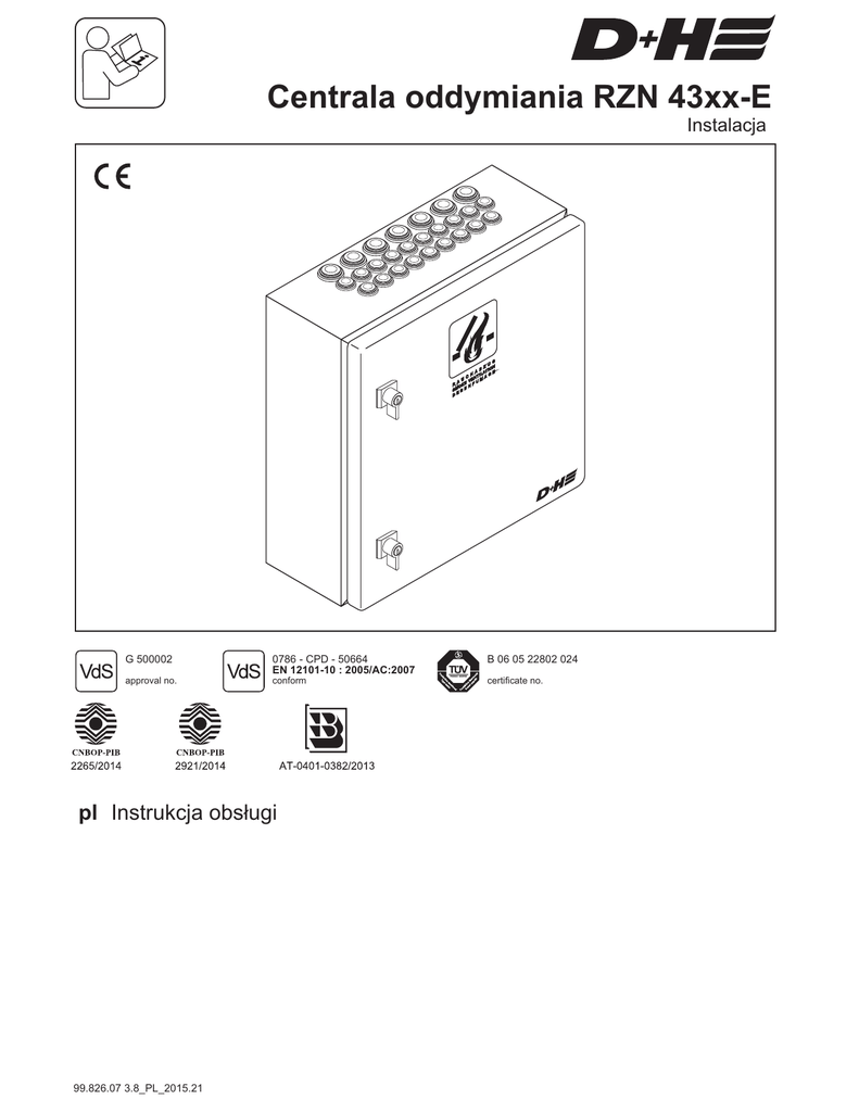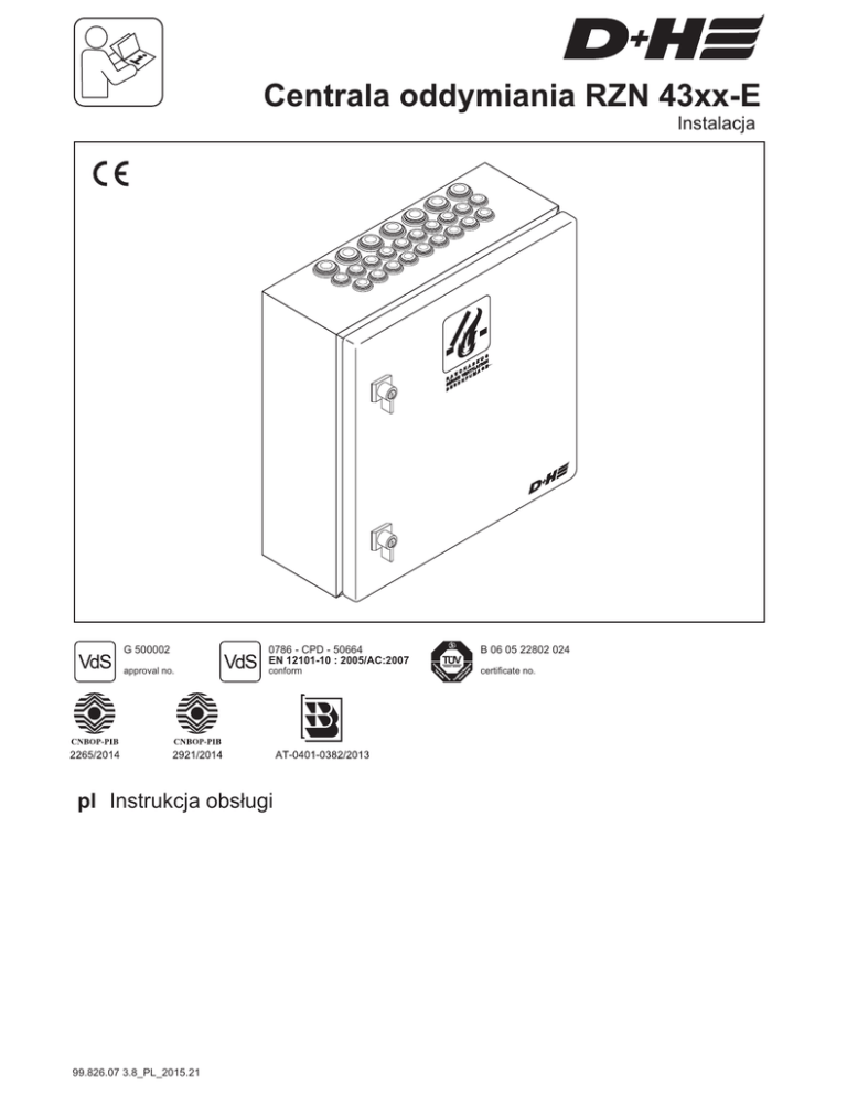 Centrala oddymiania RZN 43xx-E Instalacja G 500002 approval no. 0786 - CPD - 50664 EN 12101-10 : 2005/AC:2007 conform pl Instrukcja obsługi 99.826.07 3.8_PL_2015.21 B 06 05 22802 024 certificate no. Spis treści Wprowadzenie / Schemat montażowy ...........................................................................................................................................................................2 Przeznaczenie / Wskazówki bezpieczeństwa ...............................................................................................................................................................3 Otwarcie oddymiania .....................................................................................................................................................................................................3 Ważne przepisy / Naprawy i czyszczenie ......................................................................................................................................................................3 Oświadczenie o zgodności CE / Utylizacja ....................................................................................................................................................................3 Dane techniczne ............................................................................................................................................................................................................4 Zasilanie awaryjne 24 VDC ...........................................................................................................................................................................................4 Piktogramy .....................................................................................................................................................................................................................4 Opcjonalne rozszerzenie funkcji ....................................................................................................................................................................................4 Budowa standardowych paneli centrali .........................................................................................................................................................................5 Płyta główna GP 509 / Podstawowe panele ..................................................................................................................................................................6 Panel zasilacza VE 520 / VE 530 ..................................................................................................................................................................................7 Panel liniowy LE 513 ......... ............................................................................................................................................................................................7 Panel grupowy GE 628 (-L) V2 .......................................................................................................................................................................................8 Panel pogodowy WE 516 ................................................................................................................................................................................................9 Opis zacisków / Złącza PIN .............................................................................................................................................................................................9 Okablowanie systemów D+H ..........................................................................................................................................................................................10 Plan okablowania ............................................................................................................................................................................................................10 Podłączenie zasilania sieciowego 230 V .........................................................................................................................................................................10 Schemat połączeń ............................................................................................................................................................................................................11 Podłączenie równoległe przycisków oddymiania RT do panelu LE ..................................................................................................................................11 Podłączenie czujek pożarowych do panelu LE ................................................................................................................................................................12 Podłączenie panelu grupowego GE 628 V2 ....................................................................................................................................................................12 Podłączenie panelu pogodowego WE 516 ......................................................................................................................................................................13 Rozwiązywanie problemów ..............................................................................................................................................................................................14 Przeglądy / Konserwacja ..................................................................................................................................................................................................15 Wprowadzenie D+H serwis i partnerzy handlowi Bezpieczeństwo budynku zależy nie tylko od produktu ale wynika również z kompetencji. Wszyscy partnerzy D+H oferujący usługi serwisowe i sprzedaż urządzeń są regular