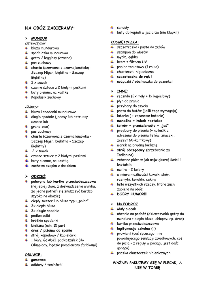 NA OBÓZ ZABIERAMY: MUNDUR Dziewczynki: bluza mundurowa spódniczka mundurowa getry / legginsy (czarne) pas zuchowy chusta (czerwona z czarną lamówką Szczep Niger, błękitna - Szczep Błękitny) 2 x suwak czarne sztuce z 2 białymi paskami buty ciemne, na kostkę Kapelusik zuchowy Chłopcy: bluza i spodenki mundurowe długie spodnie (jeansy lub sztruksy czarne lub granatowe) pas zuchowy chusta (czerwona z czarną lamówką Szczep Niger, błękitna - Szczep Błękitny) 2 x suwak czarne sztuce z 2 białymi paskami buty ciemne, na kostkę zuchowa czapka z daszkiem ODZIEŻ peleryna lub kurtka przeciwdeszczowa (najlepiej dwie, z doświadczenia wynika, że jedna potrafi się zniszczyć bardzo szybko na obozie) ciepły sweter lub bluza typu „polar” 3x ciepła bluza 3x długie spodnie podkoszulki krótkie spodenki bielizna (min. 10 par) dres / piżama do spania strój kąpielowy / kąpielówki 1 biały, GŁADKI podkoszulek (do Olimpiady, będzie pomalowany farbkami) OBUWIE: gumowce adidasy / tenisówki sandały buty do kąpieli w jeziorze (nie klapki!) KOSMETYCZKA: szczoteczka i pasta do zębów szampon do włosów mydło, gąbka krem z filtrem UV papier toaletowy (1 rolka) chusteczki higieniczne szczoteczka do rąk ! nożyczki / obcinaczka do paznokci INNE: ręczniki (2x mały + 1x kąpielowy) płyn do prania przybory do szycia pasta do butów (jeśli tego wymagają) latarka ( + zapasowe baterie) menażka + kubek +sztućce śpiwór + prześcieradło + „jaś” przybory do pisania (+ notesik z adresami do pisania listów, znaczki, zeszyt 60-kartkowy) worek na brudną bieliznę strój obrzędowy (przebranie za Indianina) zebrane pióra w jak największej ilości i kształcie mulina - 2 kolory w miarę możliwości kawałki skór, rzemyki, koraliki, cekiny lista wszystkich rzeczy, które zuch zabiera na obóz DOBRY HUMOR!!! Na PODRÓŻ Mały plecak ubranie na podróż (dziewczynki: getry do munduru + ciepła bluza, chłopcy: np. dres) kurtka przeciwdeszczowa legitymacja szkolna (!!) prowiant (coś sycącego i nie powodującego sensacji żołądkowych, coś do picia - z reguły w pociągu jest dość gorąco) paczka chusteczek higienicznych WAŻNE: PAKUJEMY SIĘ W PLECAK, A NIE W TORBĘ