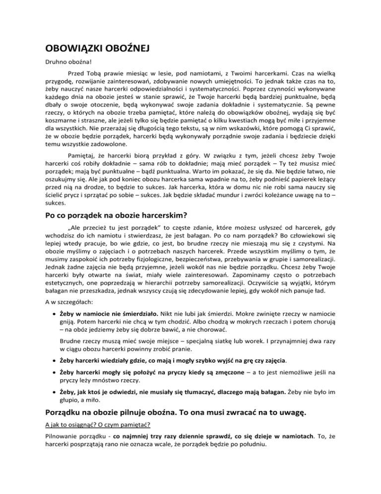 OBOWIĄZKI OBOŹNEJ Druhno oboźna! Przed Tobą prawie miesiąc w lesie, pod namiotami, z Twoimi harcerkami. Czas na wielką przygodę, rozwijanie zainteresowań, zdobywanie nowych umiejętności. To jednak także czas na to, żeby nauczyć nasze harcerki odpowiedzialności i systematyczności. Poprzez czynności wykonywane każdego dnia na obozie jesteś w stanie sprawić, że Twoje harcerki będą bardziej punktualne, będą dbały o swoje otoczenie, będą wykonywać swoje zadania dokładnie i systematycznie. Są pewne rzeczy, o których na obozie trzeba pamiętać, które należą do obowiązków oboźnej, wydają się być koszmarne i straszne, ale jeżeli tylko się będzie pamiętać o kilku kwestiach mogą być miłe i przyjemne dla wszystkich. Nie przerażaj się długością tego tekstu, są w nim wskazówki, które pomogą Ci sprawić, że w obozie będzie porządek, harcerki będą wykonywały porządnie swoje zadania i będziecie dzięki temu wszystkie zadowolone. Pamiętaj, że harcerki biorą przykład z góry. W związku z tym, jeżeli chcesz żeby Twoje harcerki coś robiły dokładnie – sama rób to dokładnie; mają mieć porządek – Ty też musisz mieć porządek; mają być punktualne – bądź punktualna. Warto im pokazać, że się da. Nie będzie łatwo, nie oszukujmy się. Ale jak pod koniec obozu harcerka sama wpadnie na to, żeby podnieść papierek leżący przed nią na drodze, to będzie to sukces. Jak harcerka, która w domu nic nie robi sama nauczy się ścielić prycz i sprzątać po sobie – sukces. Jak będzie składać mundur i zwróci koleżance uwagę na to – sukces. Po co porządek na obozie harcerskim? „Ale przecież tu jest porządek” to częste zdanie, które możesz usłyszeć od harcerek, gdy wchodzisz do ich namiotu i stwierdzasz, że jest bałagan. Po co nam porządek? Bo człowiekowi się lepiej wtedy pracuje, bo wie gdzie, co jest, bo brudne rzeczy nie mieszają mu się z czystymi. Na obozie myślimy o zajęciach i o potrzebach naszych harcerek. Przede wszystkim myślimy o tym, że musimy zaspokoić ich potrzeby fizjologiczne, bezpieczeństwa, przebywania w grupie i samorealizacji. Jednak żadne zajęcia nie będą przyjemne, jeżeli wokół nas nie będzie porządku. Chcesz żeby Twoje harcerki były otwarte na świat, miały wiele zainteresowań. Zapominamy często o potrzebach estetycznych, one poprzedzają w hierarchii potrzeby samorealizacji. Oczywiście są wyjątki, którym bałagan nie przeszkadza, jednak wszyscy czują się zdecydowanie lepiej, gdy wokół nich panuje ład. A w szczegółach: Żeby w namiocie nie śmierdziało. Nikt nie lubi jak śmierdzi. Mokre zwinięte rzeczy w namiocie gniją. Potem harcerki nie chcą w tym chodzić. Albo chodzą w mokrych rzeczach i potem chorują – na obóz jedziemy żeby się dobrze bawić, a nie chorować. Brudne rzeczy muszą mieć swoje miejsce – specjalną siatkę lub worek. I przynajmniej dwa razy w ciągu obozu harcerki powinny zrobić pranie. Żeby harcerki wiedziały gdzie, co mają i mogły szybko wyjść na grę czy zajęcia. Żeby harcerki mogły się położyć na pryczy kiedy są zmęczone – a to jest niemożliwe jeśli na pryczy leży mnóstwo rzeczy. Żeby, jak ktoś je odwiedzi, nie musiały się tłumaczyć, dlaczego mają bałagan. Żeby nie było im głupio, a miło. Porządku na obozie pilnuje oboźna. To ona musi zwracać na to uwagę. A jak to osiągnąć? O czym pamiętać? Pilnowanie porządku ‐ co najmniej trzy razy dziennie sprawdź, co się dzieje w namiotach. To, że harcerki posprzątają rano nie oznacza wcale, że porządek będzie po południu. Na początku obozu poświęć czas każdemu zastępowi, pokaż, jak się robi porządek w namiocie. Zrób to zanim zaczniecie przyznawać punktację za sprzątanie. Nikt nie lubi przegrywać, jeśli nie zna zasad gry. Niech każda rzecz ma swoje miejsc – to bardzo ułatwi sprzątanie. Miski, buty, plecaki i inne rzeczy. Dla każdej oddzielne miejsce. Często dziewczyny nie rozumieją, dlaczego pewne rzeczy nie leżą razem. Postaraj się im to w obrazowy sposób opisać. Np. jedzenie i ubrania – jak coś się wyleje bądź wysypie to ubrania będą brudne. Sprawdzaj porządek niespodziewanie (np. w trakcie ciszy poobiedniej), ale także nie zaczynaj zajęć, jeżeli w namiotach i podobozie nie ma porządku. Niech każdego dnia w zastępie będzie harcerka, która jest odpowiedzialna za pilnowanie porządku. Trzeba pamiętać, że pewne rzeczy nie mogą leżeć razem: o jedzenie, ubrania, środki czystości/kosmetyki, buty, brudne ubrania ‐ każda z tych rzeczy musi mieć swoje miejsce; pamiętaj o tym, gdy dziewczyny będą planować swoje namioty. o mundur – złożony albo na wieszaku; na mundury w namiocie musi być oddzielne miejsce; nie zawsze harcerki wiedzą jak trzeba mundur składać – należy im to pokazać; mundury, które leżą zwinięte lub w częściach zabieraj, a następnie porozmawiaj z harcerką na ten temat. o brudne ubrania – to zmora; pilnuj żeby harcerki nie upychały rzeczy brudnych w czystych. To potem śmierdzi! Prycz Na pryczy znajduje się materac, a na nim prześcieradło (koniecznie!), śpiwór, piżama, koc (koniecznie!), poduszka. Nie trzymamy na pryczy baterii, latarek, jedzenia i innych rzeczy. Zmorą od zawsze jest ściółka. Niestety wymaga to codziennego trzepania prześcieradła i pilnowania, by nie kłaść się w butach na pryczy. Sprzęt pionierski Pionierka to ciężki moment na obozie. Jeśli chcesz żeby Twoje harcerki były bezpieczne to musisz pilnować czy sprzątają i odkładają sprzęt na miejsce. Rozdaj sprzęt między zastępy i każdego dnia rano, popołudniu i wieczorem niech Ci go pokazują. Potem okazuje się, że sprzęt został gdzieś i one nie wiedzą gdzie. Że nagle jakaś harcerka weszła w piłę i zrobiła sobie krzywdę. Sprzęt musi mieć swoje miejsce – skrzynia w świetlicy w trakcie pionierki rozwiąże problem. Wyz