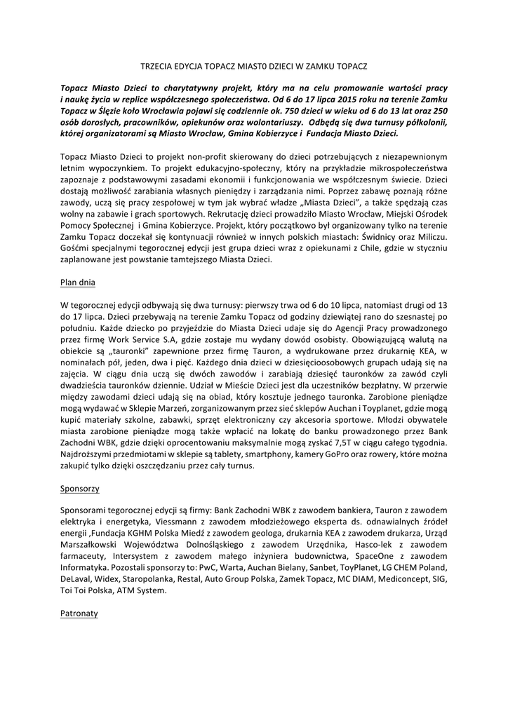 TRZECIA(EDYCJA(TOPACZ(MIAST0(DZIECI(W(ZAMKU(TOPACZ( Topacz' Miasto' Dzieci' to' charytatywny' projekt,' który' ma' na' celu' promowanie' wartości' pracy'' i'naukę'życia'w'replice'współczesnego'społeczeństwa.'Od'6'do'17'lipca'2015'roku'na'terenie'Zamku' Topacz'w'Ślęzie'koło'Wrocławia'pojawi'się'codziennie'ok.'750'dzieci'w'wieku'od'6'do'13'lat'oraz'250' osób'dorosłych,'pracowników,'opiekunów'oraz'wolontariuszy.''Odbędą'się'dwa'turnusy'półkolonii,' której'organizatorami'są'Miasto'Wrocław,'Gmina'Kobierzyce'i''Fundacja'Miasto'Dzieci.' ( Topacz( Miasto( Dzieci( to( projekt( nonAprofit( skierowany( do( dzieci( potrzebujących( z( niezapewnionym( letnim( wypoczynkiem.( To( projekt( edukacyjnoAspołeczny,( który( na( przykładzie( mikrospołeczeństwa( zapoznaje( z( podstawowymi( zasadami( ekonomii( i( funkcjonowania( we( współczesnym( świecie.( Dzieci( dostają(możliwość(zarabiania(własnych(pieniędzy(i(zarządzania(nimi.(Poprzez(zabawę(poznają(różne( zawody,(uczą(się(pracy(zespołowej(w(tym(jak(wybrać(władze(„Miasta(Dzieci”,(a(także(spędzają(czas( wolny(na(zabawie(i(grach(sportowych.(Rekrutację(dzieci(prowadziło(Miasto(Wrocław,(Miejski(Ośrodek( Pomocy(Społecznej((i(Gmina(Kobierzyce.(Projekt,(który(początkowo(był(organizowany(tylko(na(terenie( Zamku( Topacz( doczekał( się( kontynuacji( również( w( innych( polskich( miastach:( Świdnicy( oraz( Miliczu.( Gośćmi(specjalnymi(tegorocznej(edycji(jest(grupa(dzieci(wraz(z(opiekunami(z(Chile,(gdzie(w(styczniu( zaplanowane(jest(powstanie(tamtejszego(Miasta(Dzieci.(( ( Plan(dnia( ( W(tegorocznej(edycji(odbywają(się(dwa(turnusy:(pierwszy(trwa(od(6(do(10(lipca,(natomiast(drugi(od(13( do(17(lipca.(Dzieci(przebywają(na(terenie(Zamku(Topacz(od(godziny(dziewiątej(rano(do(szesnastej(po( południu.( Każde( dziecko( po( przyjeździe( do( Miasta( Dzieci( udaje( się( do( Agencji( Pracy( prowadzonego( przez( firmę( Work( Service( S.A,( gdzie( zostaje( mu( wydany( dowód( osobisty.( Obowiązującą( walutą( na( obiekcie( są( „tauronki”( zapewnione( przez( firmę( Tauron,( a( wydrukowane( przez( drukarnię( KEA,( w( nominałach(pół,(jeden,(dwa(i(pięć.(Każdego(dnia(dzieci(w(dziesięcioosobowych(grupach(udają(się(na( zajęcia.( W( ciągu( dnia( uczą( się( dwóch( zawodów( i( zarabiają( dziesięć( tauronków( za( zawód( czyli( dwadzieścia(tauronków(dziennie.(Udział(w(Mieście(Dzieci(jest(dla(uczestników(bezpłatny.(W(przerwie( między( zawodami( dzieci( udają( się( na( obiad,( który( kosztuje( jednego( tauronka.( Zarobione( pieniądze( mogą(wydawać(w(Sklepie(Marzeń,(zorganizowanym(przez(sieć(sklepów(Auchan(i(Toyplanet,(gdzie(mogą( kupić( materiały( szkolne,( zabawki,( sprzęt( elektroniczny( czy( akcesoria( sportowe.( Młodzi( obywatele( miasta( zarobione( pieniądze( mogą( także( wpłacić( na( lokatę( do( banku( prowadzonego( przez( Bank( Zachodni(WBK,(gdzie(dzięki(oprocentowaniu(maksymalnie(mogą(zyskać(7,5T(w(ciągu(całego(tygodnia.( Najdroższymi(przedmiotami(w(sklepie(są(tablety,(smartphony,(kamery(GoPro(oraz(rowery,(które(można( zakupić(tylko(dzięki(oszczędzaniu(przez(cały(turnus.( ( Sponsorzy(( Sponsorami(tegorocznej(edycji(są(firmy:(Bank(Zachodni(WBK(z(zawodem(bankiera,(Tauron(z(zawodem( elektryka( i( energetyka,( Viessmann( z( zawodem( młodzieżowego( eksperta( ds.( odnawialnych( źródeł( energii(,Fundacja(KGHM(Polska(Miedź(z(zawodem(geologa,(drukarnia(KEA(z(zawodem(drukarza,(Urząd( Marszałkowski( Województwa( Dolnośląskiego( z( zawodem( Urzędnika,( HascoAlek( z( zawodem( farmaceuty,( Intersystem( z( zawodem( małego( inżyniera( budownictwa,( SpaceOne( z( zawodem( Informatyka.(Pozostali(sponsorzy(to:(PwC,(Warta,(Auchan(Bielany,(Sanbet,(ToyPlanet,(LG(CHEM(Poland,( DeLaval,(Widex,(Staropolanka,(Restal,(Auto(Group(Polska,(Zamek(Topacz,(MC(DIAM,(Mediconcept,(SIG,( Toi(Toi(Polska,(ATM(System.( ( Patronaty( ( Cały(projekt(objęty(jest(patronatem(Marszałka(Województwa(Dolnośląskiego(Cezarego(Przybylskiego.( Patronat(medialny(sprawują(Gazeta(Wyborcza,(Radio(Wrocław,(TVP(Wrocław(,(Telewizja(Polsat(oraz( Superstacja.( ( ( ( Partnerzy( ( Partnerami(tegorocznej(edycji(Miasta(Dzieci(są:(Komenda(Miejska(Policji(we(Wrocławiu,(Straż(Miejska( we(Wrocławiu,(Komenda(Miejska(Państwowej(Straży(Pożarnej(we(Wrocławiu,(Wodne(Ochotnicze( Pogotowie(Ratunkowe,(Pogotowie(Ratunkowe(we(Wrocławiu,(Wrocławskie(Centrum(Rozwoju( Społecznego,(Miejskie(Centrum(Wolontariatu,(Gminne(Centrum(Kultury(i(Sportu(w(Kobierzycach,( Opera(Wrocławska,(Powiatowy(Zespół(Szkół(w(Krzyżowicach,(Towarzystwo(Automobilowe(Topacz,( LIMA(MakeAup(Studio,(Wojewódzki(Ośrodek(Ruchu(Drogowego,(Ciszewska(Pilates(Studio,(Loopy’s( World,(Fundacja(Ewy(Naworol,(Wyższa(Szkoła(Oficerska(Wojsk(Lądowych(im.(gen.(Tadeusza( Kościuszki,(Mondelez.( ( (