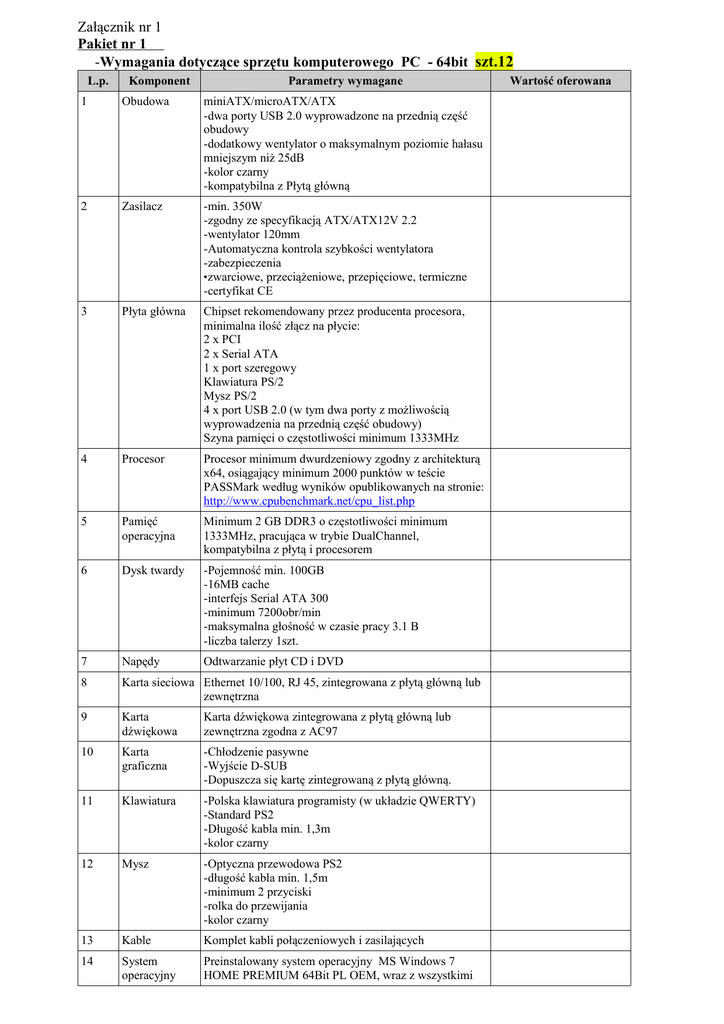 Załącznik nr 1 Pakiet nr 1 -Wymagania dotyczące sprzętu komputerowego PC - 64bit szt.12 L.p. Komponent Parametry wymagane 1 Obudowa miniATX/microATX/ATX -dwa porty USB 2.0 wyprowadzone na przednią część obudowy -dodatkowy wentylator o maksymalnym poziomie hałasu mniejszym niż 25dB -kolor czarny -kompatybilna z Płytą główną 2 Zasilacz -min. 350W -zgodny ze specyfikacją ATX/ATX12V 2.2 -wentylator 120mm -Automatyczna kontrola szybkości wentylatora -zabezpieczenia •zwarciowe, przeciążeniowe, przepięciowe, termiczne -certyfikat CE 3 Płyta główna Chipset rekomendowany przez producenta procesora, minimalna ilość złącz na płycie: 2 x PCI 2 x Serial ATA 1 x port szeregowy Klawiatura PS/2 Mysz PS/2 4 x port USB 2.0 (w tym dwa porty z możliwością wyprowadzenia na przednią część obudowy) Szyna pamięci o częstotliwości minimum 1333MHz 4 Procesor Procesor minimum dwurdzeniowy zgodny z architekturą x64, osiągający minimum 2000 punktów w teście PASSMark według wyników opublikowanych na stronie: http://www.cpubenchmark.net/cpu_list.php 5 Pamięć operacyjna Minimum 2 GB DDR3 o częstotliwości minimum 1333MHz, pracująca w trybie DualChannel, kompatybilna z płytą i procesorem 6 Dysk twardy -Pojemność min. 100GB -16MB cache -interfejs Serial ATA 300 -minimum 7200obr/min -maksymalna głośność w czasie pracy 3.1 B -liczba talerzy 1szt. 7 Napędy Odtwarzanie płyt CD i DVD 8 Karta sieciowa Ethernet 10/100, RJ 45, zintegrowana z płytą główną lub zewnętrzna 9 Karta dźwiękowa Karta dźwiękowa zintegrowana z płytą główną lub zewnętrzna zgodna z AC97 10 Karta graficzna -Chłodzenie pasywne -Wyjście D-SUB -Dopuszcza się kartę zintegrowaną z płytą główną. 11 Klawiatura -Polska klawiatura programisty (w układzie QWERTY) -Standard PS2 -Długość kabla min. 1,3m -kolor czarny 12 Mysz -Optyczna przewodowa PS2 -długość kabla min. 1,5m -minimum 2 przyciski -rolka do przewijania -kolor czarny 13 Kable Komplet kabli połączeniowych i zasilających 14 System operacyjny Preinstalowany system operacyjny MS Windows 7 HOME PREMIUM 64Bit PL OEM, wraz z wszystkimi Wartość oferowana niezbędnymi do poprawnej pracy sterownikami, płytą instalacyjną, etykietą certyfikatu autentyczności 15 Gwarancja -3 lata -Warunki gwarancji muszą zezwalać użytkownikowi na dokonywanie zmian w konfiguracji komputera i dołączanie dodatkowych urządzeń -naprawa gwarancyjna w siedzibie Zamawiającego, czas reakcji serwisu 24godz. 16 Certyfikaty -Deklaracja zgodności CE. -Oferowane komputery powinny posiadać certyfikat potwierdzający poprawną współpracę z oferowanym systemem operacyjnym (dopuszczalne oświadczenie oferenta) -Certyfikat ISO 9001 dla producenta komputerów Pakiet nr 2 Wymagania dotyczące sprzętu komputerowego PC - 32bit szt.5 L.p. Komponent Parametry wymagane 1 Obudowa miniATX/microATX/ATX -dwa porty USB 2.0 wyprowadzone na przednią część obudowy -dodatkowy wentylator o maksymalnym poziomie hałasu mniejszym niż 25dB -kolor czarny -kompatybilna z Płytą główną 2 Zasilacz -min. 350W -zgodny ze specyfikacją ATX/ATX12V 2.2 -wentylator 120mm -Automatyczna kontrola szybkości wentylatora -zabezpieczenia •zwarciowe, przeciążeniowe, przepięciowe, termiczne -certyfikat CE 3 Płyta główna Chipset rekomendowany przez producenta procesora, minimalna ilość złącz na płycie: 2 x PCI 2 x Serial ATA 1 x port szeregowy 1 x port równoległy Klawiatura PS/2 Mysz PS/2 4 x port USB 2.0 (w tym dwa porty z możliwością wyprowadzenia na przednią część obudowy) Szyna pamięci o częstotliwości minimum 1333MHz 4 Procesor Procesor minimum dwurdzeniowy zgodny z architekturą x86, osiągający minimum 2000 punktów w teście PASSMark według wyników opublikowanych na stronie: http://www.cpubenchmark.net/cpu_list.php 5 Pamięć operacyjna Minimum 2 GB DDR3 o częstotliwości minimum 1333MHz, pracująca w trybie DualChannel, kompatybilna z płytą i procesorem 6 Dysk twardy -Pojemność min. 100GB -16MB cache -interfejs Serial ATA 300 -minimum 7200obr/min -maksymalna głośność w czasie pracy 3.1 B -liczba talerzy 1szt. 7 Napędy Odtwarzanie płyt CD i DVD 8 Karta sieciowa Ethernet 10/100, RJ 45, zintegrowana z płytą główną lub zewnętrzna 9 Karta dźwiękowa Karta dźwiękowa zintegrowana z płytą główną lub zewnętrzna zgodna z AC97 Wartość oferowana 10 Karta graficzna -Chłodzenie pasywne -Wyjście D-SUB -Dopuszcza się kartę zintegrowaną z płytą główną. 11 Klawiatura -Polska klawiatura programisty (w układzie QWERTY) -Standard PS2 -Długość kabla min. 1,3m -kolor czarny 12 Mysz -Optyczna przewodowa PS2 -długość kabla min. 1,5m -minimum 2 przyciski -rolka do przewijania -kolor czarny 13 Kable Komplet kabli połączeniowych i zasilających 14 System operacyjny Preinstalowany system operacyjny MS Windows XP Professional SP3 PL lub MS Windows 7 Professional 32bit PL OEM, wraz z wszystkimi niezbędnymi do poprawnej pracy sterownikami, płytą instalacyjną, etykietą certyfikatu autentyczności 15 Gwarancja -3 lata -Warunki gwarancji muszą zezwalać użytkownikowi na dokonywanie zmian w konfiguracji komputera i dołączanie dodatkowych urządzeń -naprawa gwarancyjna w siedzibie Zamawiającego, czas reakcji serwisu 24godz. 16 Certyfikaty -Deklaracja zgodności CE. -Oferowane komputery powinny posiadać certyfikat potwierdzający poprawną współpracę z oferowanym systemem operacyjnym (dopuszczalne oświadczenie oferenta) -Certyfikat ISO 9001 dla producenta komputerów Pakiet nr 3 Wymagania dotyczące monitorów LCD Lp Komponent szt.20 Parametry wymagane 1 Typ ekranu TFT/TN 2 Przekątna ekranu Minimum 19 cali 3 Rozdzielczość nominalna -minimum 1440 pikseli szerokości -minimum 900 pikseli wysokości 4 Jasność min. 300 cd/m² 5 Kontrast min. 500:1 6 Złącza D-SUB 7 Głośniki TAK 8 Kable -kabel zasilający -kabel audio -kabel sygnałowy D-SUB 9 Kąt widzenia w poziomie min. 160 stopni 10 Kąt widzenia w pi