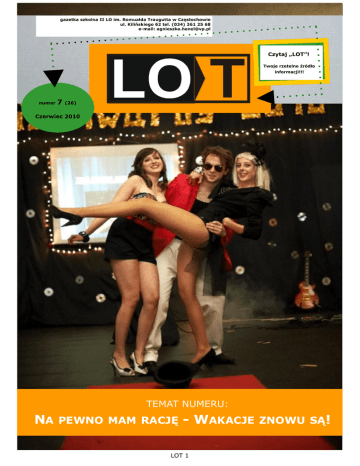 gazetka szkolna II LO im. Romualda Traugutta w Częstochowie ul. Kilińskiego 62 tel. (034) 361 25 68 e-mail: [email protected] numer 7 (26) LO T Czytaj „LOT”! Twoje rzetelne źródło informacji!!! Czerwiec 2010 TEMAT NUMERU: NA PEWNO MAM RACJĘ - WAKACJE ZNOWU SĄ! LOT 1 redaktor naczelna Dominika Majchrzak Wstępniak, czyli czas się pożegnać Jak mówią słowa piosenki: „stopnie na cenzurze, tata czeka z pasem (...) już koniec nauki błąka mi się myśl ta” – i trauguciakom myśl ta ostatnimi czasy błąka się po głowach, póki co zajętych jeszcze nauką. Nareszcie! – to okrzyk, który nie schodzi z ich ust. Nareszcie nadszedł bowiem czerwiec, nareszcie czas pożegnać się na błogie dwa miesiące z obowiązkami szkolnymi – hurra! W zgiełku licznych popraw, wystawiania ocen i wypełnianiu słynnej „obiegówki”, redakcja LOT-u znalazła czas na przygotowanie ostatniego już w tym roku szkolnym, pożegnalnego numeru. LOT tym razem utrzymamy w tonach podsumowująco - oceniających. Wyliczymy sukcesy trauguciaków z roku szkolnego 2009-2010, wspomnimy wydarzenia takie jak wymiany międzynarodowe, dzień otwarty, Romualdy 2010 czy w końcu matury. Pierwszoklasiści ocenią swój dotychczasowy pobyt w „Traugucie”, tegoroczni maturzyści powiedzą jak będą wspominać życie szkolne. W kilku zdaniach rok szkolny oceni także pan dyrektor Krzysztof Ponchała. Ponadto w numerze wywiad z odnoszącą sukcesy naukowe Kornelią Gładysz oraz panią prof. Barbarą Turel – bibliotekarką, organizatorką konkursu Erudyta Roku. Mnie nie pozostaje nic innego jak tylko życzyć Wam, drodzy czytelnicy, miłej lektury i jeszcze milszych wakacji! TRAUGUCIAKOWA AGENCJA PRASOWA Szachowe sukcesy Zapraszamy… Rozstrzygnięcie VIII turnieju Indywidualnych Mistrzostw Częstochowy Szkół Podstawowych, Gimnazjalnych, Ponadgimnazjalnych oraz Akademickich Mistrzostw Częstochowy w Szachach miało miejsce 08.05.2010 roku . Zdecydowaną mistrzynią wśród pań okazała się uczennica II LO – Karolina Dąbek z klasy 2d. III miejsce przypadło również jednej z naszych koleżanek- Kornelii Gładysz z klasy 2c. Serdecznie gratulujemy. 24.04.2010 w naszym liceum miał miejsce dzień otwarty dla gimnazjalistów. W godzinach od 9 do 12 odwiedziło nas ok. trzystu uczniów. Prez e nto w aliś m y nas z e umiejętności oraz osiągnięcia, chcąc pokazać Z ekologią za pan brat szyła w kierunku Hiszpanii, gdzie spędziła kilka niezapomnianych dni. Prócz integrowania się z zagranicznymi rówieśnikami grupa zwiedziła takie miejsca, jak Saragossa czy Madryt. W stolicy głównym punktem wycieczki było Museo del Prado, gdzie zobaczyliśmy arcydzieła sztuki artystów światowej klasy, takich jak: Bosch, Velazquez, El Greco, Goya, Tycjan, van der Weyden, Memling, Boticelli. W sobotę 17 kwietnia 2010 roku grupa uczniów i nauczycieli Traugutta całkowicie identyfikowała się z żalem wywołanym koniecznością opuszczenia magicznego miasta-Barcelony. Spotkanie zorganizowane przez Hiszpanów w szkole I.E.S. Sierra de Virgen w Illuece miało na celu zaprezentowanie przez trzech partnerów projektu efektów półrocznej pracy nad wspólnie wybraną pozycją literacką, czyli „Małym Księciem” Antoine’a de S a i n t - E x u p é r e g o . 27 kwietnia w naszej szkole świętow aliś m y o b c ho d y D nia Z ie m i. Wstępem była prelekcja wygłoszona przez profesora Jarosława Skrzypczyka „Gady ery mezozoicznej”. Następnie klasy sadziły wokół boiska i szkoły drzewka sosny zwyczajnej, które z trudem udało nam się pozyskać. Na koniec rozegrała się prawdziwa rywalizacja dotycząca przygotowanych przez klasy kompozycji kwiatowych. Zwycięzcą okazała się klasa 2c. Emmerich się z jak najlepszej strony. Miejmy nadzieję, że nasi młodzi koledzy i koleżanki dokonają słusznego wyboru i ze już we wrześniu będą jednymi z nas. Barcelono ż e g n a j ! 11 kwietnia 2010 roku grupa trauguciaków wyru- LOT 2 Już kolejny rok z rzędu grupa naszych uczniów wyruszyła na wymianę uczniowską do Niemiec. Kilkoro trauguciaków miało okazję zgłębiania tajników kultury naszych sąsiadów. Uczęszczali do szkoły razem ze swoimi partnerami, słuchając lekcji wykładanych w języku niemieckim. Z niecierpliwością czekamy na przybycie do naszego LO Austauschpartnerów! Beata Poraj, Kamila Bejm „Nie staraj się zostać człowiekiem sukcesu, lecz człowiekiem wartościowym” - Albert Einstein Sukcesy uczniów w roku szkolnym 2009/2010: „AD REM”- II miejsce, zespół: Kornel Eberhardt, Sebastian Chrząstek, Kamil Pabiś XXXVI Olimpiada Geograficzna- laureat: Paweł Złotkowski V Edycja Ogólnopolskiego konkursu „Moją młodość buduję potęgą do- bra”- laureat: Maciej Orman Ogólnopolska Olimpiada z fizyki „O Diamentowy Indeks AGH”laureat I stopnia: Dominik Suszalski Miejskie Igrzyska Młodzieży Szkolnej w szachach szkół ponad gimnazjalnych- I miejsce, zespół: Kornelia Gładysz, Karolina Dąbek, Karina Sobczak; III miejsce, zespół: Marek Kapral, Michał Sobczyk, Mateusz Szymczak, Karol Wałachowski XVIII Turniej cyklu „Grand Prix” Indywidualne Mistrzostwa Częstochowy – wicemistrzyni: Karolina Dąbek; druga wicemistrzyni Kornelia Gładysz V Powiatowy Konkurs Literacki im. Ludmiły Marjańskiej- I miejsce Sara Mishchil Klimaty Częstochowy (kategoria: fotografia klimatyczna)- I miejsce, Patrycja Zubrzycka Miejskie zawody LA: 100m- I miejsce: Magdalena Kostrubiec 400m- II miejsce: Gabriela Gmyz, II miejsce: Paulina Rokosa 800m- II miejsce: Katarzyna Górka Sztafeta 4x100m - I miejsce: Sylwia Parkitna, Gabriela Gmyz, Anna Głąb, Magdalena Kostrubiec 400m- II miejsce: Michał Kozieł Skok w dal- I miejsce: Francois Xavier Guidon Finał Licealiady Młodzieży Szkolnej województwa Śląskiego-800m- II miejsce: Gabriela Gmyz Finał Wojewódzki O.T.W.P.- Młodzież Zapobiega Pożarom- III miejsce: Teodor Gajos Marzena Koralik LOT-ny sukces! Mam ni