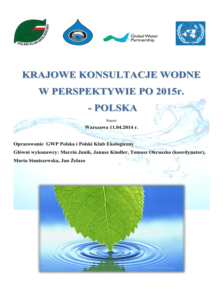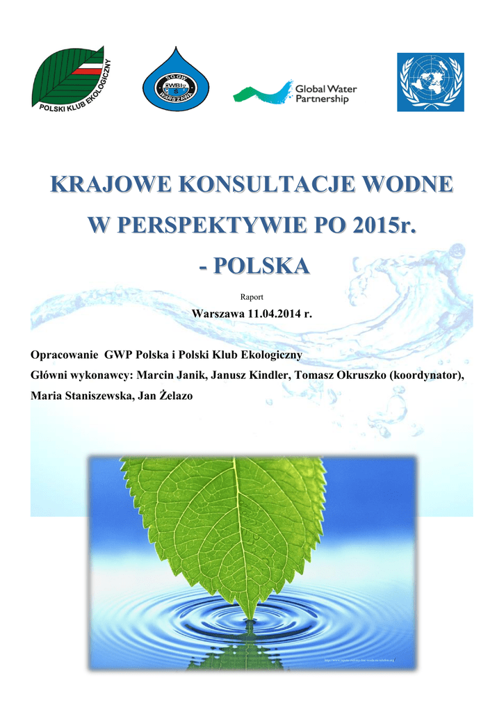 KRAJOWE KONSULTACJE WODNE W PERSPEKTYWIE PO 2015r. - POLSKA Raport Warszawa 11.04.2014 r. Opracowanie GWP Polska i Polski Klub Ekologiczny Główni wykonawcy: Marcin Janik, Janusz Kindler, Tomasz Okruszko (koordynator), Maria Staniszewska, Jan Żelazo http://www.tapeta-zielony-lisc-woda.na-telefon.org/ SPIS TREŚCI Wstęp......................................................................................................................................... .........................................................3 Rozdział 1. Komentarze do Celu Zrównoważonego Rozwoju z uwzględnieniem szczegółowych celów dla zasobów wodnych...........................................................................................................................................................................4 1.1. Zasoby wodne .............................................................................................................................................................................4 1.2. Zarządzanie ................................................................................................................................................................................5 1.3. Woda pitna, kanalizacja i oczyszczanie ścieków i higiena –WASH …...……..….…………………………………………7 1.4. Ścieki, zanieczyszczenia, jakość wody ......................................................................................................................................9 1.5. Klęski żywiołowej katastrofy związane z wodą ……………..………….……………………………………………….......12 Rozdział 2. Kluczowe konsekwencje oraz środki wdrażania określone dla osiągnięcia Celu Zrównoważonego Rozwoju i celów szczegółowych w okresie 2015 – 2030 …………………………………………………...…………………..14 Rozdział 3. Podsumowanie ………………………………............................................................................................................. 16 2 Wstęp We wrześniu 2000 roku na szczycie ONZ światowi liderzy 189 państw przyjęli Deklarację Millenium, zawierającą 8 Milenijnych Celów Rozwoju - Millenium Development Goals – MDGs. Siódmy Cel Milenijny dotyczy zachowania stanu równowagi ekologicznej. Cel ten określa konieczność wdrożenia polityki zrównoważonego rozwoju, prowadzącej do zapewnienia na świecie trwałości środowiska naturalnego. Kolejnym założeniem tego Celu jest zmniejszenie o połowę do 2015 roku liczby ludzi nie mających dostępu do wody zdatnej do picia i do urządzeń sanitarnych, jak również doprowadzenie do 2020 roku, do znacznej poprawy warunków życia co najmniej 100 milionów ludzi mieszkających w slumsach. Milenijne cele nie zostały w pełni osiągnięte, jednak one wyraźnie uruchomiły proces walki z ubóstwem. Podczas konferencji w Rio de Janeiro w czerwcu 2012r. oceniono stopień realizacji celów, jak również zainicjowano dążenie do nowych Celów Zrównoważonego Rozwoju (Sustainable Development Goals- SDGs), będących kontynuacją Milenijnych Celów Rozwoju. W listopadzie 2012r. agencja ONZ uznała za niezbędne opracowanie nowej, bardziej obszernej procedury dążenia do zrównoważonego rozwoju po roku 2015, mającej na celu realizację potrzeb ponad stu nacji, określonych podczas krajowych konsultacji. Nowa koncepcja, ma być oparta na określonych priorytetach ustalonych podczas jedenastu tematycznych konsultacji międzynarodowych, zajmujących się problematyką: edukacji, trwałości ekosystemów, konfliktów, energii, wyżywienia, zarządzania, zatrudnienia, zdrowia, nierówności społecznej, wzrostu populacji oraz wody na świecie. Polskie konsultacje prowadzone pod patronatem ONZ przez GWP Polska oraz Polski Klub Ekologiczny, oparły się na dokumencie stworzonym przez UN Water -"A Post-2015 Global Goal for Water: Synthesis of Key Findings and Recommendations from UN-Water". Celem konsultacji było skonfrontowanie polskich realiów zrównoważonego rozwojuoraz ocena możliwości ich dalszej realizacji po 2015 roku. Konsultacje przeprowadzono pod kątem wzajemnie powiązanych,pięciu zagadnień: 1. Zasoby wodne; 2. Zarządzanie zasobami wodnymi; 3. Woda pitna, kanalizacja, oczyszczanie ścieków i higiena – WASH; 4.. Ścieki, zanieczyszczenia i jakość wody; 5. Klęski żywiołowe i katastrofy związane z wodą. W wyniku konsultacji ustalono, że całościowe (holistyczne) podejście do obiegu wody w środowisku oraz wdrożenie konieczności jej ochrony jest podstawą rozwiązania wielu problemów, związanych z wyżywieniem, zdrowiem, energią, edukacją, jak również nierównościami społecznymi, oraz wszelkiego rodzaju dyskryminacją. 3 walką z Rozdział 1: Komentarze do Celu Zrównoważonego Rozwoju z uwzględnieniem szczegółowych celów dla zasobów wodnych 1.1.1. Zasoby wodne Celem jest poprawa stanu wód oraz zrównoważone wykorzystanie zasobów wodnych we wszystkich krajach. Decyzje i działania powinny uwzględniać potrzeby człowieka, jak również wymogi ochrony środowiska. Pobór wody winien być prowadzony w zrównoważony sposób, umożliwiający odtworzenie zasobów. Dla zapewnienia różnorodnych usług związanych z poborem wody, należy zawsze dążyć do zachowania i ewentualnej restytucji ekosystemów. Konieczne jest zwiększenie efektywności wykorzystania dostępnych zasobów wody. Polska jest krajem, którego „granice hydrograficzne” mieszczą się niemal całkowicie w dorzeczach dwóch dużych europejskich rzek: Odry i Wisły. Własne całkowite zasoby wód powierzchniowych wynoszą w skali roku około 53,9 km3 (średnie z okresu 1946-2011). Ponadto kraj dysponuje zasobami pochodzącymi spoza jego granic w wielkości 7,72 km3, a około 2,80 km3 wody odpływa do krajów sąsiednich. Zasoby te są niewielkie w porównaniu z innymi krajami europejskimi i w przeliczen