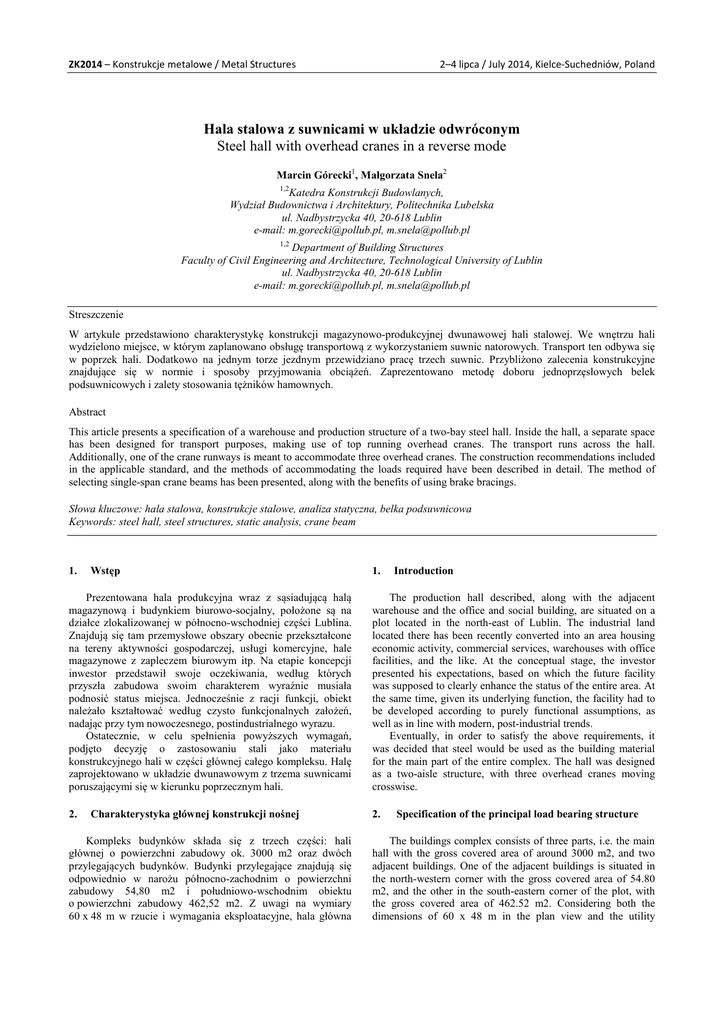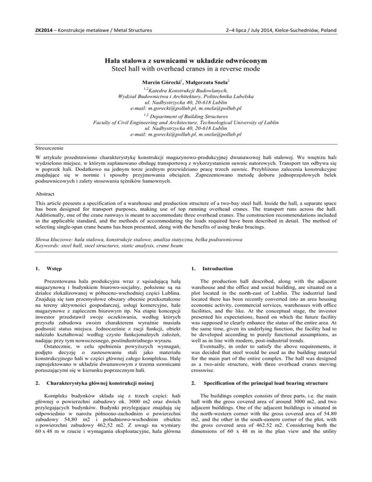 ZK2014 – Konstrukcje metalowe / Metal Structures 2–4 lipca / July 2014, Kielce-Suchedniów, Poland Hala stalowa z suwnicami w układzie odwróconym Steel hall with overhead cranes in a reverse mode Marcin Górecki1, Małgorzata Snela2 1,2 Katedra Konstrukcji Budowlanych, Wydział Budownictwa i Architektury, Politechnika Lubelska ul. Nadbystrzycka 40, 20-618 Lublin e-mail: [email protected], [email protected] 1,2 Department of Building Structures Faculty of Civil Engineering and Architecture, Technological University of Lublin ul. Nadbystrzycka 40, 20-618 Lublin e-mail: [email protected], [email protected] Streszczenie W artykule przedstawiono charakterystykę konstrukcji magazynowo-produkcyjnej dwunawowej hali stalowej. We wnętrzu hali wydzielono miejsce, w którym zaplanowano obsługę transportową z wykorzystaniem suwnic natorowych. Transport ten odbywa się w poprzek hali. Dodatkowo na jednym torze jezdnym przewidziano pracę trzech suwnic. Przybliżono zalecenia konstrukcyjne znajdujące się w normie i sposoby przyjmowania obciążeń. Zaprezentowano metodę doboru jednoprzęsłowych belek podsuwnicowych i zalety stosowania tężników hamownych. Abstract This article presents a specification of a warehouse and production structure of a two-bay steel hall. Inside the hall, a separate space has been designed for transport purposes, making use of top running overhead cranes. The transport runs across the hall. Additionally, one of the crane runways is meant to accommodate three overhead cranes. The construction recommendations included in the applicable standard, and the methods of accommodating the loads required have been described in detail. The method of selecting single-span crane beams has been presented, along with the benefits of using brake bracings. Słowa kluczowe: hala stalowa, konstrukcje stalowe, analiza statyczna, belka podsuwnicowa Keywords: steel hall, steel structures, static analysis, crane beam 1. Wstęp 1. Introduction Prezentowana hala produkcyjna wraz z sąsiadującą halą magazynową i budynkiem biurowo-socjalny, położone są na działce zlokalizowanej w północno-wschodniej części Lublina. Znajdują się tam przemysłowe obszary obecnie przekształcone na tereny aktywności gospodarczej, usługi komercyjne, hale magazynowe z zapleczem biurowym itp. Na etapie koncepcji inwestor przedstawił swoje oczekiwania, według których przyszła zabudowa swoim charakterem wyraźnie musiała podnosić status miejsca. Jednocześnie z racji funkcji, obiekt należało kształtować według czysto funkcjonalnych założeń, nadając przy tym nowoczesnego, postindustrialnego wyrazu. Ostatecznie, w celu spełnienia powyższych wymagań, podjęto decyzję o zastosowaniu stali jako materiału konstrukcyjnego hali w części głównej całego kompleksu. Halę zaprojektowano w układzie dwunawowym z trzema suwnicami poruszającymi się w kierunku poprzecznym hali. The production hall described, along with the adjacent warehouse and the office and social building, are situated on a plot located in the north-east of Lublin. The industrial land located there has been recently converted into an area housing economic activity, commercial services, warehouses with office facilities, and the like. At the conceptual stage, the investor presented his expectations, based on which the future facility was supposed to clearly enhance the status of the entire area. At the same time, given its underlying function, the facility had to be developed according to purely functional assumptions, as well as in line with modern, post-industrial trends. Eventually, in order to satisfy the above requirements, it was decided that steel would be used as the building material for the main part of the entire complex. The hall was designed as a two-aisle structure, with three overhead cranes moving crosswise. 2. 2. Charakterystyka głównej konstrukcji nośnej Kompleks budynków składa się z trzech części: hali głównej o powierzchni zabudowy ok. 3000 m2 oraz dwóch przylegających budynków. Budynki przylegające znajdują się odpowiednio w narożu północno-zachodnim o powierzchni zabudowy 54,80 m2 i południowo-wschodnim obiektu o powierzchni zabudowy 462,52 m2. Z uwagi na wymiary 60 x 48 m w rzucie i wymagania eksploatacyjne, hala główna Specification of the principal load bearing structure The buildings complex consists of three parts, i.e. the main hall with the gross covered area of around 3000 m2, and two adjacent buildings. One of the adjacent buildings is situated in the north-western corner with the gross covered area of 54.80 m2, and the other in the south-eastern corner of the plot, with the gross covered area of 462.52 m2. Considering both the dimensions of 60 x 48 m in the plan view and the utility ZK2014 – Konstrukcje metalowe / Metal Structures została podzielona na trzy części: dwie nawy główne oraz nawę poprzeczną (rys. 1). Wymagany proces technologiczny wymusił konieczność podzielenia hali na dwie nawy o szerokości 24,0 m każda. Dzięki takiemu układowi uzyskano dwa rzędy słupów skrajnych i jeden rząd słupów środkowych wzdłuż hali głównej w rozstawie 6,0 m. Słupy wykonano z szerokostopowych dwuteowników walcowanych typu HEA sztywno zamocowanych w fundamentach. Na słupach stalowych, poprzez sztywne węzły, oparto konstrukcję dachu w formie stalowych dźwigarów kratownicowych. Pasy dźwigarów wykonano z dwuteowników typu HEA, natomiast słupki i krzyżulce stanowiły profile zamknięte o przekroju kwadratowym. Dźwigary kratowe wykonano w odcinkach o długości 8,86 i 14,86 m, łączone na budowie doczołowo na śruby o wysokiej wytrzymałości. Pokrycie dachu zaprojektowano z płyt warstwowych z rdzeniem z wełny mineralnej. Dostęp światła dziennego do wnętrza hali zapewniono poprzez okna znajdujące się w ścianach zewnętrznych, ale doświetlenie hali stanowią również poliwęglanowe płyty, wykonane w technologii wyciskania arku