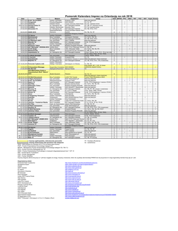 Pomorski Kalendarz Imprez na Orientację na rok 2Ńń6 Data 09.01.2016 23.01.2016 29.01.2016 19/20.02.2016 20.02.2016 27.02.2016 Nazwa III InO "Do Źródełka" Śniegołazik Chaszcze Zimowa Pełnia`ń6 II CieMnO Zimowisko`16 Miejsce okolice Trójmiasta Wiczlino/Rogulewo żdańsk Osowa ok. Starogardu Gd. żdańsk, Samborowo ok. Starogardu Gd. Nied wiednik/Złota Karczma 05.03.2016 GOSK 2016 11-12.03.2016 19.03.2016 19.03.2016 19-20.03.2016 26.03.2016 28.03.2016 02.04.2016 09.04.2016 09.04.2016 15.04.2016 16.04.2016 XV Spiros Bielowszczak Wiosenne`16 XLII Manewry SKPT Meander`16 Fajne InO Wiosenny Tułacz InO "Włóczykij" WIOSNA 2Ńń6 XI InO Szago Wiosenne InO Indywidualne`16 okolice Trójmiasta Bory Tucholskie ok. Starogardu Gd. woj. pomorskie rzeki Kociewia okolice Trójmiasta woj. pomorskie okolice Rumi Bory Tucholskie żdańsk ok. Starogardu Gd. 15-17.04.2016 23.04.2016 23.04.2016 03.05.2016 51 ERnO Harpagan V Cool-InO Kaszubiaczek Majówka`ń6 woj. pomorskie okolice Trójmiasta okolice Trójmiasta ok. Starogardu Gd. okolice Trójmiasta i Małego Trójmiasta 07-15.05.2016 Pomorski Tydzie z InO 14.05.2016 XI Kaszubska Włóczęga 21.05.2016 We Wsi InO XXV Mistrzostwa Polski w Indywidualnych MnO "Matnia" 26-29.05.2016 2016 28-29.05.2016 28-29.05.2016 04.06.2016 04-05.06.2016 11.06.2016 18.06.2016 25.06.2016 25/26.06.2016 02.07.2016 27-28.08.2016 03.09.2016 03.09.2016 03.09.2016 04.09.2016 10.09.2016 16-18.09.2016 24.09.2016 24-25.09.2016 01.10.2016 01-02.10.2016 01/02.10.2016 XVI MnO Borowiacki X Rajd z Kompasem III InO "Do Źródełka" Bajoro`16 Nad Wdą Wakacyjny Tułacz Stolemik Moczary`16 Pazur Gryfa Wiosło`ń6 Harce IV Rogaining "Krzaczor" Sukkubik Fan InO Boruta Jaszczur - Terytorium Wydry Fair Play XI Rajd z Kompasem Szuwary`16 IV MnO Warownia Jesienny Tułacz 14-16.10.2016 15.10.2016 15/16.10.2016 22.10.2016 23.10.2016 05-06.11.2016 11.11.2016 52 ERnO Harpagan Topielec`16 Topielec-Interior InO "Włóczykij" JESIE MnO Bąbel V XI InO "Szago" Jesienne`16 18-19.11.2016 19.11.2016 03-04.12.2016 10.12.2016 10.12.2016 16-17.12.2016 16/17.12.2016 XVI Spiros Pagórki XLI Darżlub III InO Śnieżynka Mikołajkowy Kompas XXII "Harce Prezesa" Malo`16 2Ńń6 Organizator Krzaczor Team AKK GDAKK Uwagi OInO MPWP PPG kilka tras pieszych 2 TZ, TU, TP 2 √ Tomasz Jankowski, Marek Pacek TZ, TU, impreza nocna 2 √ KKT Starogard żdański TZ, TM, TP (impreza nocna) 2 Morenka Team TZ, TU, impreza nocna 2 √ KKT Starogard żdański TZ, TM, TP-D, TP-F 2 PKInO/Jarosław Kabuła, Piotr ywicki TZ, TM, TD, TP 2 √ √ Pomorski Okręgowy Związek Biathlonu kilka tras pieszych 1 Gimnazjum Warlubie TZ, TU/TJ, TM, TD 2 KKT Starogard żdański TZ, TM, TP-D, TP-F 2 SKPT żdańsk kilka tras pieszych 2 KKT Starogard żdański TZ-W, TP-W (kajakowa) 2 Agnieszka Ko ciowska TZ 2 √ Bractwo Przygody Almanak kilka tras pieszych 2 SKKT PTTK "Włóczykij" Rumia TJ, TM, TD 2 √ UKS „Włóczykij” Osiek TZ, TU/TJ, TM, TD, TR 2 Szczep ZHP przy SP nr 49 żdańsk TJ, TM, TD 2 √ KKT Starogard żdański TZ-Ind, TM-Ind, TP-D, TP-F, TR (2 kat indyw +2 TP 10, TP25, TP50, TP100, TR50, TR100, TR200, TM150 PKO Harpagan 1 Krzysztof Kula TZ, TO 2 √ AKK GDAKK/A. Witowska, D. Juszczuk kilka tras pieszych i trasa rowerowa 2 KKT Starogard żdański TZ, TM, TP-D, TP-F, TR (+rowerowa) 2 Gimnazjum nr 4 Rumia Ocypel (Bory Tucholskie) AKK GDAKK Dębogórze/Kazimierz Mariusz Westa Beskid ywiecki Plessino TJ, TM, TD trasy piesze: MT, T, BT, W (trasa weteranów stopień trudny) TZ TZ, TU, TJ kilka tras pieszych i trasa rowerowa, Puchar Polski Młodzie y w MnO Bory Tucholskie LUKS "Pol" Czersk kilka tras pieszych woj. pomorskie KInO "Zkompasem.pl" Marszewo/Łę yce Krzaczor Team kilka tras pieszych rzeki Kociewia KKT Starogard żdański TZ-W, TP-W (kajakowa + nocna w TZ-W) Bory Tucholskie Bractwo Czarnej Wody TZ, TU/TJ, TM, TD, TR woj. pomorskie Bractwo Przygody Almanak kilka tras pieszych okolice Trójmiasta AKK GDAKK/T. Radzikowski kilka tras pieszych ok. Starogardu Gd. KKT Starogard żdański TZ, TM, TP, TR (nocna + rowerowa) woj. pomorskie S.T.O.P.A. Słupsk TP15, TP50, TR50, TR140 rzeki Kociewia KKT Starogard żdański TZ-W, TP-W (kajakowa + nocna w TZ-W) Bory Tucholskie UKS Bytonia TZ, TU/TJ, TM, TD, TR okolice Trójmiasta Karol Wroński kilka tras pieszych Sobieszewo AKK GDAKK/Mariusz Firszt kilka tras pieszych okolice Trójmiasta Artur Fankidejski TZ Bory Tucholskie LUKS "Pol" Czersk/Filip Fierek TZ, TU/TJ, TM, TD Bory Tucholskie KKT Starogard żdański TP 13, TP 25, TP 50, TR 50 Sopot, dol. wiemirowska Jakub i Piotr Kaczyńscy TZ, TM, TD, TP woj. pomorskie KInO "Zkompasem.pl" kilka tras pieszych ok. Starogardu Gd. KKT Starogard żdański TZ, TM, TP-D, TP-F, TR (+rowerowa) Bory Tucholskie Krzysztof Nowak TZ, TU/TJ, TM, TD, TR, T(T)T woj. pomorskie Bractwo Przygody Almanak kilka tras pieszych TP 10, TP25, TP50, TP100, TR50, TR100, TR200, TM150 woj. pomorskie PKO Harpagan rzeki Kociewia KKT Starogard żdański TZ-W, TP-W (kajakowa) ok. Starogardu Gd. KKT Starogard żdański TZ, TM, TP (nocna) okolice Rumi SKKT PTTK "Włóczykij" Rumia TJ, TM, TD żołębiewo KTP "Bąbelki/T. Jaworowski TZ, TU, TP, TSz Bory Tucholskie UKS „Włóczykij” Osiek TZ, TU/TJ, TM, TD, TR ok. Starogardu Gd. KKT Starogard żdański TZ, TM, TP-D, TP-F, TR (+rowerowa) Pomorski Okręgowy Związek Biathlonu okolice Trójmiasta kilka tras pieszych okolice Trójmiasta Paweł Ćwidak TZ, TM, TD, TP woj. pomorskie SKPT żdańsk kilka tras pieszych Matemblewo AKK GDAKK/Anna Dettlaff TZ, TU, TP Gdynia KInO "Zkompasem.pl" kilka tras pieszych okolice Trójmiasta PKO Harpagan kilka tras pieszych ok. Starogardu Gd. KKT Starogard żdański TZ, TM, TP (nocna) 2 DINO √ PBT AKK Kajak Rower √ √ √ √ √ √ √ √ √ √ √ √ √ √ √ √ √ √ √ 3 2 √ √ √ √ √ √ √ √ √ √ √ 5 4 2 2 2 2 2 2 2 2 2 2 2 2 2 2 2 2 2 2 2 2 1 2 2 2 2 2 2 1 2 2 2 2 2 2 √ √ √ √ √ √ √ √ http://www.facebook.com/Kociewskiklubturystyczny https: