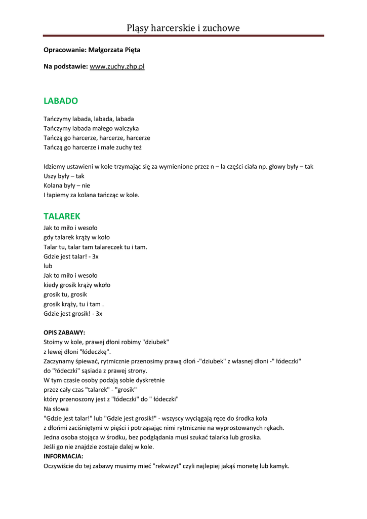 Pląsy harcerskie i zuchowe Opracowanie: Małgorzata Pięta Na podstawie: www.zuchy.zhp.pl LABADO Tańczymy labada, labada, labada Tańczymy labada małego walczyka Tańczą go harcerze, harcerze, harcerze Tańczą go harcerze i małe zuchy też Idziemy ustawieni w kole trzymając się za wymienione przez n – la części ciała np. głowy były – tak Uszy były – tak Kolana były – nie I łapiemy za kolana tańcząc w kole. TALAREK Jak to miło i wesoło gdy talarek krąży w koło Talar tu, talar tam talareczek tu i tam. Gdzie jest talar! - 3x lub Jak to miło i wesoło kiedy grosik krąży wkoło grosik tu, grosik grosik krąży, tu i tam . Gdzie jest grosik! - 3x OPIS ZABAWY: Stoimy w kole, prawej dłoni robimy "dziubek" z lewej dłoni "łódeczkę". Zaczynamy śpiewać, rytmicznie przenosimy prawą dłoń -"dziubek" z własnej dłoni -" łódeczki" do "łódeczki" sąsiada z prawej strony. W tym czasie osoby podają sobie dyskretnie przez cały czas "talarek" - "grosik" który przenoszony jest z "łódeczki" do " łódeczki" Na słowa "Gdzie jest talar!" lub "Gdzie jest grosik!" - wszyscy wyciągają ręce do środka koła z dłońmi zaciśniętymi w pięści i potrząsając nimi rytmicznie na wyprostowanych rękach. Jedna osoba stojąca w środku, bez podglądania musi szukać talarka lub grosika. Jeśli go nie znajdzie zostaje dalej w kole. INFORMACJA: Oczywiście do tej zabawy musimy mieć "rekwizyt" czyli najlepiej jakąś monetę lub kamyk. Pląsy harcerskie i zuchowe Osoba stojąca w środku przez cały czas trwania zabawy szuka grosika MUZYKANCI KONSZABELANCI Jestem muzykantem, konszabelantem. A my - muzykanci, konszabelanci. Ja umiem grać i my umiemy grać: Na flecie, na flecie! Firlalalajka, firlalalajka, firlalalajka, firlalalajka, bęc! Jestem muzykantem... ...Na bębnie, na bębnie: Bumtarara, bumtarara... Firlalalajka..., bęc! Jestem muzykantem... ...Na trąbce, na trąbce! Trutututu, trutututu... Firlalalajka... Bumtarara..., bęc! Jestem muzykantem... ...Na skrzypcach, na skrzypcach! Cimcirimci, cimcirimci... Firlalajka... Bumtarara... Trutututu..., bęc! OPIS: Wszyscy stoją na okręgu. Prowadzący śpiewa pierwszy wers piosenki, a pozostali odpowiadają mu drugim itd. Podczas śpiewania refrenu wszyscy naśladują się grę na danym instrumencie. W kolejnych refrenach dodaje się wszystkie instrumenty z poprzednich refrenów. Ojciec Wirgiliusz Ojciec Wirgiliusz Uczył dzieci swoje A miał ich wszystkich Prawdziwe roje Pląsy harcerskie i zuchowe Takie malutkie (pokazujemy ręką nisko) I takie wielkie (pokazujemy ręką wysoko) Takie grubiutkie (pokazujemy rękami szeroko) I takie cienkie (pokazujemy rękami wąsko) Tralali i tralala śpiewasz ty śpiewam ja Gdy melodia z wiatrem gna Tralali i tralala Ojciec Wirgiliusz Kochał swoje dziatki Kupił im wszystkim Bluzeczki w kwiatki (pokazujemy ręką bluzeczkę rysując na niej kwiatki) Spodenki w kratkę (pokazujemy ręką spodenki rysując na nich kratki) W paseczki czapki (pokazujemy ręką czapkę z daszkiem) Koszulki w kulki (pokazujemy ręką bluzeczkę rysując na niej kulki) I klapki w ciapki (pokazujemy ręką buty i malując na nich ciapki) Tralali i tralala śpiewasz ty śpiewam ja Gdy melodia z wiatrem gna Tralali i tralala To jest piosenka Na niepogodę Na chmurny piątek Deszczową środę Dla wszystkich dzieci Od Wirgiliusza Bo ten Wirgiliusz To złota dusza Tralali i tralala śpiewasz ty śpiewam ja Gdy melodia z wiatrem gna Tralali i tralala ABRAHAM 1. Stary Abraham miał siedmiu synów, Siedmiu synów miał stary Abraham. A oni siedli, i nic nie jedli i zaśpiewali sobie tak: -Lewa ręka. 2. Stary Abraham miał siedmiu synów, Siedmiu synów miał stary Abraham. A oni siedli, i nic nie jedli i zaśpiewali sobie tak: - Lewa ręka, prawa ręka, lewa noga, prawa noga, Pląsy harcerskie i zuchowe a tego jeszcze głowa. (do każdej zwrotki, jest ich 5, dodajemy jedną „kończynę”) STONOGA Idzie, idzie stonoga, stonoga, stonoga Idzie, idzie stonoga, stonoga bęc Pierwsza noga itp. OPIS ZABAWY: Ustawiamy się jak do „pociągu” i idziemy po woli, na „bęc” stonoga się zatrzymuje i pierwsza osoba podnosi prawą nogę do góry mówiąc „ pierwsza noga”, później druga osoba i tak do końca, a później lewa noga i ostatnia osoba idzie na początek. Wersja: STONOGA TEKST: Idzie sobie stonoga, stonoga, stonoga idzie sobie stonoga, stonoga, stonoga bęc głowa, pierwsza noga, druga noga...... ogon! OPIS ZABAWY: Ustawiamy się w kole jak do "pociągu" i idziemy powoli rzędem śpiewając, na słowo "bęc" zatrzymujemy stonogę pierwsza osoba krzyczy "głowa", druga osoba podnosi prawą nogę krzyczy "pierwsza noga" i tak dalej trzecia, czwarta...., ostatnia osoba krzyczy "ogon!" biegnie na początek i prowadzi dalej stonogę. INFORMACJA: Alternatywa: możemy liczyć prawe nogi, później lewe nogi, a następnie zaczynać zabawę od początku. PODAJMY SOBIE RĘCE I. Chociaż świat dokoła, dziwny jest i wielki, a my tacy mali, mali jak kropelki. Ref: Podajmy sobie ręce, w zabawie i w piosence, w ogródku przed domem, na łące znajomej. Podajmy sobie ręce, przez burzę i przez tęczę, pod gwiazdą daleką, nad rzeczką i rzeką. II. Kiedy nagle z bajki zniknie dobra wróżka, Pląsy harcerskie i zuchowe kiedy szary smutek wpadnie do fartuszka. Ref: Podajmy sobie ręce, III. Choć nas czasem dzielą nieprzebyte góry, nieskończone drogi, zachmurzone chmury. Ref: Podajmy sobie ręce, MUNDUR CHUSTA PAS ZUCHOWY Mundur, chusta, pas zuchowy, (Mundur- pokazujemy mundur, Chusta- pokazujemy chustę, pas zuchowy- pokazujemy pas,) Beret zdobi głowę, pokazujemy beret, A na piersi pięknie błyszczy Znaczek kolorowy. (pokazujemy znaczek zucha,) Ref: to zuchy, to zuchy, Co tu dalej kryć, To zuchy, to zuchy, Dobrze zuchem być. (maszerujemy w miejscu.) Biały orzeł to odwaga, Słońce radość głosi, Zuch jak sama nazwa mówi, W ZHP być musi. KADRYL Zapraszamy do kadryla, te melodię każdy 