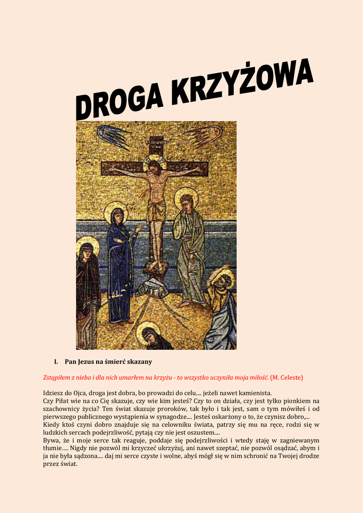 I. Pan Jezus na śmierć skazany Zstąpiłem z nieba i dla nich umarłem na krzyżu - to wszystko uczyniła moja miłość. (M. Celeste) Idziesz do Ojca, droga jest dobra, bo prowadzi do celu.... jeżeli nawet kamienista. Czy Piłat wie na co Cię skazuje, czy wie kim jesteś? Czy to on działa, czy jest tylko pionkiem na szachownicy życia? Ten świat skazuje proroków, tak było i tak jest, sam o tym mówiłeś i od pierwszego publicznego wystąpienia w synagodze.... Jesteś oskarżony o to, że czynisz dobro,... Kiedy ktoś czyni dobro znajduje się na celowniku świata, patrzy się mu na ręce, rodzi się w ludzkich sercach podejrzliwość, pytają czy nie jest oszustem.... Bywa, że i moje serce tak reaguje, poddaje się podejrzliwości i wtedy staję w zagniewanym tłumie…. Nigdy nie pozwól mi krzyczeć ukrzyżuj, ani nawet szeptać, nie pozwól osądzać, abym i ja nie była sądzona.... daj mi serce czyste i wolne, abyś mógł się w nim schronić na Twojej drodze przez świat. II. Pan Jezus bierze krzyż na swoje ramiona Rozważaj z uwagą skarb, który odkrywam ci w krzyżu; w nim zawiera się wieczna chwała! (M. Celeste) Zwalają na Ciebie belkę krzyża, ale potem sam go bierzesz.... obejmujesz ramionami, z miłością, musiałeś objąć go z miłością, bo jesteś nią cały i wszystko co czynisz jest miłością. Jak to zrobiłeś, Panie, ja nie potrafię, tak często brzydzę się krzyżem, on mnie odrzuca. Czy taka jest droga do Królestwa, kamienista, z krzyżem na ramionach, czy to jest droga do Nieba? Tak pytam, ale wiem, znam odpowiedź na te moje pytania... Jest nią fiat, jest nią zawierzenie, zaufaj, a zobaczysz więcej niż to, zobaczysz aniołów zstępujących i wstępujących do nieba. Gdy tam, w Ogrójcu, pod drzewem oliwnym modliłeś się klęcząc, czy może kiedyś pod drzewem figowym, jak Nikodem, pozwoliłeś sercu otworzyć się na drogę krzyża, Twoje serce wyruszyło w tę drogę, chociaż jeszcze nie czułeś do końca ciężaru.... już wtedy wziąłeś krzyż na swoje ramiona. Początek drogi jest nieznany nikomu, tylko Ojcu, i wtedy dokonuje się najważniejsze. Pozwól mi otworzyć uszy i serce na Twoje zwiastowania, abym potem miała siły brać na ramiona krzyż. III. Pan Jezus po raz pierwszy upada pod krzyżem Słuchaj Mnie zawsze z Katedry Krzyża, który umieściłem w twoim sercu, abym żył w tobie ukrzyżowany w życiu tego pielgrzymującego świata. (M. Celeste) Droga prowadząca do celu jest kamienista, nogi poranione i krzyż - ciężki, potykasz się i padasz.... Tłum obserwuje Twój trud, cierpienie.... Milczysz, powiedziałeś tak wiele słów, nie zrozumieli, ale teraz może niektórzy zrozumieją milczenie... Inni powiedzą - a jednak upadł, a nie mówiłem, sam sobie jest winien. Czy i ja nie staję z nimi w szeregu i nie powtarzam czasami, a nie mówiłam.... to cierpienie jest nieprawdziwe, bo sam jest sobie winien.... A czy cierpienie może być nieprawdziwe jeżeli jest cierpieniem, czyż nie lepiej przed nim zamilknąć? IV. Pan Jezus spotyka Matkę swoją Uciekam się do Ciebie, Matko Miłości, aby przez Twoje wstawiennictwo był odciśnięty w mnie dobrze żywy Obraz Jezusa, aby niebieski Ojciec wpatrywał się we mnie z tak bezgraniczną miłością, jak patrzy na swojego umiłowanego i boskiego Syna (M. Celeste) Maryja na drodze krzyża była jasnym punktem, promieniem światła, jej oczy wpatrzone w Ciebie z miłością są pocieszeniem. Jest w nich pokój i zawierzenie, Ona jest mocna, ufa Ojcu. A jednak jest w nich tyle bólu.... chciałbyś ukryć przed nią Twoje cierpienie, zaoszczędzić jej tego widoku. I martwisz się o nią, bo potem, po Twojej śmierci zostanie uznana za matkę przestępcy... Ojciec pragnie, abyś ofiarował ją Janowi za Matkę, …Jan zaopiekuje się Maryją, a Ona będzie mu Matką, będzie Matką wszystkich uczniów, Matką Twojego Kościoła, Mater Ecclesiae. Może widzisz przez chwilę, jak zstępuje na nią Duch Święty, jak jej miłość jednoczy tych, którzy w Ciebie nie zwątpili, jak przygarnia Magdalenę i wszystkie Magdaleny świata. Jeżeli tylko zechcą, otoczy je swoim płaszczem, jak niebiańską kopułą; może widzisz ją na okrągłych sklepieniach Bazylik jako Królową nieba i ziemi.... I dla niej idziesz dalej.... także i Tobie dodaje nowych sił. Prośmy Maryję, aby z nami była zawsze, aby wstawiała się za nami, była Wszechmocą Błagającą, teraz i godzinie naszej śmierci. V. Szymon Cyrenejczyk pomaga nieść krzyż Jezusowi Twoja dusza nie zasługuje na skarby mojego Królestwa krzyża. To owoc, który Ja ofiaruję tylko moim przyjaciołom. Rozważaj to dzień i noc, pragnąc widzieć siebie samą na krzyżu wraz ze Mną, ukrzyżowawszy w sobie miłość własną, pragnienie czci i przyjemności (M. Celeste). Szymon Cyrenejczyk został przymuszony, aby nieść Twój krzyż, został niejako przymuszony aby poznać Ciebie, zobaczyć Twoje oblicze, może dotknąć Twojej dłoni. Czasem przymuszeni jesteśmy, aby wypełnić Twoje plany wobec nas, nie rozumiejąc, do jak wielkich rzeczy nas zapraszasz, zapominając że Twoja przyjaźń warta jest więcej niż chwila trudu, niż podjęty wysiłek. Jak wielka jest Twoja pokora, Panie, że przyjmujesz pomoc daną pod przymusem, niechętnie. Ucz mnie być dla innych pomocną i dziękować za pomoc Cyrenejczyków spotkanych w moim życiu, za tych którzy uczą mnie pokornego przyjmowania daru i wdzięczności za niego. VI. Weronika ociera twarz Jezusowi W Duchu Świętym Ojciec darowuje nam … miłość, która podnosi nas do godności bycia obrazami Jego Syna (M. Celeste). Może nie spotkałbyś Weroniki, Szymona i wielu innych gdyby nie droga krzyżowa…. Na naszych krzyżowych drogach spotykamy ludzi, którzy pocieszają nas, jak płaczące niewiasty, którzy niosą z nami krzyż, jak Szymon, spotykamy również bezinteresowne gesty miłości, jak ten gest Weroniki. Kiedy wchodzimy na krzyżowe drogi