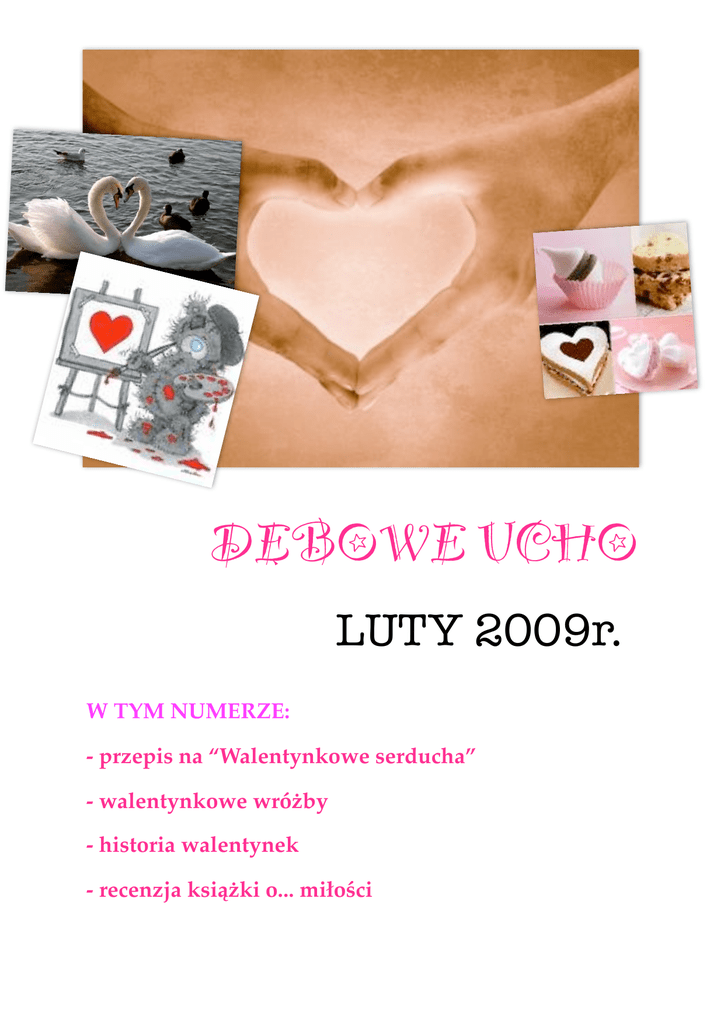 DĘBOWE UCHO LUTY 2009r. W TYM NUMERZE: - przepis na “Walentynkowe serducha” - walentynkowe wróżby - historia walentynek - recenzja książki o... miłości Walentynkowe Serducha Składniki: 150 ml wody 70g margaryny ok.80dag cukru pudru 1 szklanka mąki olejek cytrynowy kwasek cytrynowy (ok. 1 łyżeczka) barwnik spożywczy w płynie czerwony 1 łyżeczka kakao Przepis: Do rondelka wlać wodę, włożyć pokrojoną margarynę. Zagotować. Do gotującego się płynu wsypać powoli mąkę intensywnie mieszając i rozcierając, aby nie powstały grudki, tylko jedna wielka klucha. Wyłożyć na talerz, rozpłaszczyć, przestudzić. Wystudzoną masę zagniatać dodając cukier puder, olejek i kwasek cytrynowy (wg uznania). Gdyby masa była zbyt kleista - dodać więcej cukru, lub schłodzić w lodówce. Odkładamy trochę białej masy na oczy i odrobinę zagniatamy z kakao (źrenice). Ugniatając dodajemy czerwony barwnik. Reszta zależy od Waszej inwencji twórczej.Masę wkładamy do woreczka i odrywamy po kawałku, żeby nie obeschła. Drobne elementy (oczy) przyklejamy smarując pędzelkiem maczanym w wodzie i lekko dociskamy. Mokrą wykałaczką wyciskamy buźki. Serduszka konsystencją przypominają marcepan. Świetny prezent walentynkowy dla miłośników słodkości!!! AUSTRIACKIE CIASTECZKA Składniki -3 żółtka ugotowane na twardo -5 dag cukru pudru, -17,5 dag margaryny -25 dag mąki, -5 dag mielonych migdałów, -10 dag galaretki malinowej lub pysznego dżemu, -0,5 łyżeczki cynamonu, -szczypta soli, -cukier puder do posypania PRZEPIS Żółtka przetrzeć przez sitko lub przecisnąć przez wyciskacz do czosnku.Wymieszać na stolnicy z cukrem pudrem, mąką, cynamonem i solą. Dodać masło, posiekać i zagnieść ciasto. Zawinąć w folię i wstawić na godzinę do lodówki. Ciasto rozwałkowywać najlepiej po kawałku na oprószonej mąką stolnicy na grubość ok. 3 mm. Wycinać foremkami serduszka wielkości mniej więcej 5 cm. W połowie serduszek wyciąć w środku mniejsze serduszka lub po prostu otworki. Układać na natłuszczonej blasze i piec w temp.200°C ok. 10-12 minut. Serca z dziurką posypać cukrem pudrem. Pozostałe posmarować galaretką i przykryć posypanymi. Ciasteczka są bardzo kruche i czasami po prostu pękają. 3 WIERSZE O MIŁOŚCI Konstanty Ildefons Gałczyński “Prośba o wyspy szczęśliwe” A ty mnie na wyspy szczęśliwe zawieź, wiatrem łagodnym włosy jak kwiaty rozwiej, zacałuj,ty mnie ukołysz i uśpij, snem muzykalnym zasyp,otumań, we śnie na wyspach szczęśliwych nie przebudź ze snu. Pokaż mi wody ogromne i wody ciche, rozmowy gwiazd na gałęziach pozwól mi słyszeć zielonych, dużo motyli mi pokaż, serca motyli przybliż i przytul, myśli spokojne ponad wodami pochyl miłością. Adam Mickiewicz “Dwa słowa” Jonasz Kofta “Czułość Nie chcę cię dotknąć Boję się Boję się twego bólu Chcę ci zostawić twą samotność A swą obecność zmienić w czułość Jesteśmy inni Każde z nas Ma swoje tajemnice ciemne Kolczasty Dziki Suchy chwast Nadzieje nadaremne Spotkali się Któryś tam raz Śpiąca królewna ze ślepym królem Chcę dać ci to Co mogę dać Czule Czulej Najczulej Gdy sam na sam z tobą siedzę, Nie mam czasu o nic pytać: Patrzę w oczy, ustek śledzę, Chciałbym wszystkie myśli czytać Wprzód, nim w oczętach zaświecą; Chciałbym wszystkie słówka chwytać Wprzód, nim od ustek odlecą; -I nie potrzeba tłumaczyć, Co chcę słyszeć, co zobaczyć. Rzecz nietrudna i nienowa, Moja luba! te dwa słowa: K o c h a m c i e b i e, k o c h a m c i e b i e. Innego nie chcę widoku, Kiedy z tobą będę w niebie; Tylko niech te dwa wyrazy, Napisane w twoim oku, Odbite po tysiąc razy Widzę wszędzie wkoło siebie. I innej muzyki w niebie Nie chcę od wschodu jutrzenki Słyszeć do zachodu słońca; K o c h a m c i e b i e, k o c h a m c4 i e b i e. Dość mnie tej jednej piosenki Z wariacjami bez końca. Zapowiedzi filmowe na walentynki 1. JAGODOWA MIŁOŚĆ Tytuł oryginalny: My Blueberry Nights Gatunek: komedia romantyczna Reżyseria: Wong Kar-Wai Obsada: Jude Law, Natalie Portman, Chan Marshall, Rachel Weisz, David Strathairn, Norah Jones Opis: Opowiedziana przez Wong Kar Wai'a niezwykła historia miłosna wciąga widza jak niezapomniane przygody "Thelmy i Louise", serwując mu dawkę emocji porównywaną z "Bliżej" oraz niesamowitą atmosferę, którą pamiętamy ze "Spragnionych miłości". To niezwykłe połączenie zachwyciło już miłośników kina na całym świecie. 2. MY BLOODY vALENTINE Tytuł oryginalny: My Bloody Valentine 3D Gatunek: thriller, horror Reżyseria: Patrick Lussier Obsada: Jaime King, Jensen Ackles, Kerr Smith Opis: USA Tom powraca do swojego rodzinnego miasteczka. Jest to akurat dziesiąta rocznica masakry, która wydarzyła się w dzień Walentynek i pochłonęła życie 22 osób. Mężczyzna zamiast cieszyć się z powrotu w rodzinne strony, zostaje oskarżony o popełnienie serii tajemniczych morderstw, a jego dawny kumpel wydaje się być jednym, który wierzy w jego niewinność. 5 „Czego nie robi się dla miłości...” Książka pt.: „Zmierzch” autorstwa amerykańskiej pisarki Stephanie Meyer to pierwsza część serii tak samo zatytułowanej, posiadająca wiele milionów fanów na całym świecie. Jest to opowieść o losach siedemnastoletniej Belli, która zakochuje się w szkolnym koledze Edwardzie. Chłopak żywi do niej takie samo uczucie, lecz wkrótce okazuje się, że ich związkowi może przeszkodzić pewna mroczna tajemnica dotycząca życia Edwarda. Akcja książki rozpoczyna się w momencie, gdy sytuacja rodzinna zmusza Bellę Swan do przeprowadzki ze słonecznej Arizony do małego, deszczowego miasteczka Forks w stanie Waszyngton, gdzie mieszka jej ojciec. Niełatwo jest jej się odnaleźć w nowym otoczeniu –inna szkoła, obcy ludzie. Aż pewnego dnia w stołówce zauważa olśniewająco przystojnego, ale również bardzo niedostęp