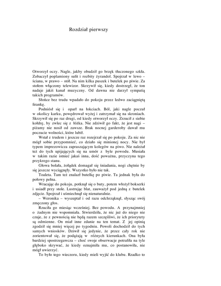 Rozdział pierwszy Otworzył oczy. Nagle, jakby obudził go brzęk tłuczonego szkła. Zobaczył poplamiony sufit i rozbity żyrandol. Spojrzał w lewo – ściana, w prawo – stół. Na nim kilka puszek i butelek po piwie. Za stołem włączony telewizor. Skrzywił się, kiedy dostrzegł, że ton nadaje jakiś kanał muzyczny. Od dawna nie darzył sympatią takich programów. Słońce bez trudu wpadało do pokoju przez ledwo zaciągniętą firankę. Podniósł się i oparł na łokciach. Ból, jaki nagle poczuł w okolicy karku, powędrował wyżej i zatrzymał się na skroniach. Skrzywił się po raz drugi, od kiedy otworzył oczy. Zrzucił z siebie kołdrę, by zwlec się z łóżka. Nie zdziwił go fakt, że jest nagi – piżamy nie nosił od zawsze. Brak nocnej garderoby dawał mu poczucie wolności, które lubił. Wstał z trudem i jeszcze raz rozejrzał się po pokoju. Za nic nie mógł sobie przypomnieć, co działo się minionej nocy. Nie był typem imprezowicza zapraszającym kolegów na piwo. Nie należał też do tych upijających się na umór z byle powodu. Musiała w takim razie istnieć jakaś inna, dość poważna, przyczyna tego przykrego stanu. Głowa bolała, żołądek domagał się śniadania, nogi chętnie by się jeszcze wyciągnęły. Wszystko było nie tak. Toaleta. Tam też znalazł butelkę po piwie. Ta jednak była do połowy pełna. Wracając do pokoju, potknął się o buty, potem włożył bokserki i usiadł przy stole. Lustrując blat, zauważył pod jedną z butelek zdjęcie. Spojrzał i uśmiechnął się nienaturalnie. – Weronika – wyszeptał i od razu odchrząknął, słysząc swój zmęczony głos. Rzuciła go miesiąc wcześniej. Bez powodu. A przynajmniej o żadnym nie wspomniała. Stwierdziła, że nic już do niego nie czuje, że z pewnością nie będą razem szczęśliwi, że ich priorytety są odmienne. On miał inne zdanie na ten temat. Z jej opinią zgodził się mniej więcej po tygodniu. Powoli dochodził do tych samych wniosków. Dziwił się jedynie, że przez cały rok nie zorientował się, że podążają w różnych kierunkach. Ona była bardziej spostrzegawcza – choć swoje obserwacje potrafiła na tyle głęboko skrywać, że kiedy oznajmiła mu, co postanowiła, nie mógł uwierzyć. To było tego wieczoru, kiedy mieli wyjść do klubu. Rzadko to robili, więc wydarzenie było szczególne. Powiedziała mu wszystko, zanim opuścili mieszkanie. Kiedy zamknęli drzwi, poszli w dwie różne strony. Jak w życiu. On tułał się później pustymi i ciemnymi ulicami. Do domu wrócił po północy i nie spał do rana. Nie wiedział, co ona robi, gdzie jest. Nie wróciła do niego, zniknęła. Jej telefon milczał jak zaklęty. Dopiero po trzech dniach jej przyjaciółka zdradziła, że Weronika jest na razie u niej i żeby się nie martwił. Kilka razy w tamtych dniach przypominał sobie sytuację z rodzinnego miasta. Para na motocyklu zatrzymuje się na jednej z głównych ulic. Kłócą się. Ona zdejmuje kask i kładzie go na siedzeniu za jego plecami. On zdenerwowany zapala motor i rusza z impetem przed siebie. Po kilkudziesięciu metrach zrzuca kask i z premedytacją, przyśpieszając, uderza prosto w mur okalający dziewiętnastowieczny kościół. Ginie na miejscu. Przez kilka miesięcy całe miasto mówiło o tym samobójstwie. Jedni współczuli, roniąc łzy, inni nie mogli zrozumieć jego decyzji. Telefon. Gdzie jest telefon? Słyszał go, ale nie potrafił sobie przypomnieć, gdzie go położył. Dźwięk dzwonka dochodził z łazienki, ale wydało mu się to niemożliwe, więc szukał aparatu w pokoju. Zaglądał pod rozrzuconą odzież, pod stół, za telewizor. Nie znalazł. Tym bardziej że telefon przestał dzwonić. Zaklął głośno, ale zaraz potem roześmiał się, myśląc o tym, że niczego z ostatniego wieczoru nie pamięta. Co tu się działo, skoro wszystko mu zdołało ulecieć z głowy i nawet telefonu nie może zlokalizować? Znowu dzwonek. Komuś zależało na połączeniu. Tym razem jednak zaufał swemu słuchowi i poszedł do łazienki. Dźwięk wydał się wyraźniejszy, choć nadal lekko przytłumiony. Podszedł do pralki. Pod stertą ubrań znalazł wreszcie swojego smartfona. Ciągle dzwonił. Spojrzał na wyświetlacz. Mama. – Konrad? – miała głos pełen niepewności. – Konrad? Jesteś tam? – No jestem, mamo – odpowiedział, choć nie był pewny, czy chce z nią teraz rozmawiać. – Konrad, co się z tobą dzieje? Od dwóch tygodni nie dajesz znaku życia, nie oddzwaniasz. – Maaaamo… – Przewrócił oczami, charakterystycznie przeciągając pierwszą sylabę. – Mam różne sprawy, nie mam głowy do telefonów. – Wystarczy tylko dać znać, że wszystko okej. – A dlaczego miałoby nie być okej? W słuchawce cisza. – Halo…? – pomyślał, że się rozłączyła. – Ty dobrze wiesz, dlaczego miałoby nie być okej. Wiedział, co miała na myśli. Ale wiedział też, że przejawiała tendencję do wyolbrzymiania i często była przewrażliwiona. – Co u niej? – Wiedział też, że o to zapyta. Zrobiła to nieśmiało, jakby obawiając się odpowiedzi. – Nie interesuje mnie to, mamo. – Nie jesteś ciekawy? – Nie. Znowu cisza. – Jak sobie radzisz? – zapytała po chwili. – Jestem dużym chłopcem. W tle usłyszał głos ojca. Coś podpowiadał. Nigdy z nim nie rozmawiał o życiu. Od tych spraw zawsze była matka. Wiedział jednak doskonale, co ojciec myśli i co chciałby mu powiedzieć. – Może wpadłbyś do nas na kilka dni? Odpocząłbyś… – To pewnie była ta podpowiedź ojca. – Nie jestem zmęczony – odparł, ale po chwili pomyślał, że zabrzmiało to nieuprzejmie. – Wpadnę kiedyś, nie martwcie się. Usiadł na kanapie i przetarł oczy. – U was wszystko w porządku? – zapytał z grzeczności. – Tak. Odłożył słuchawkę z wyrzutem sumienia, że długo z rodzicami się nie kontaktował. Tuż po rozstaniu z Weroniką dał się 