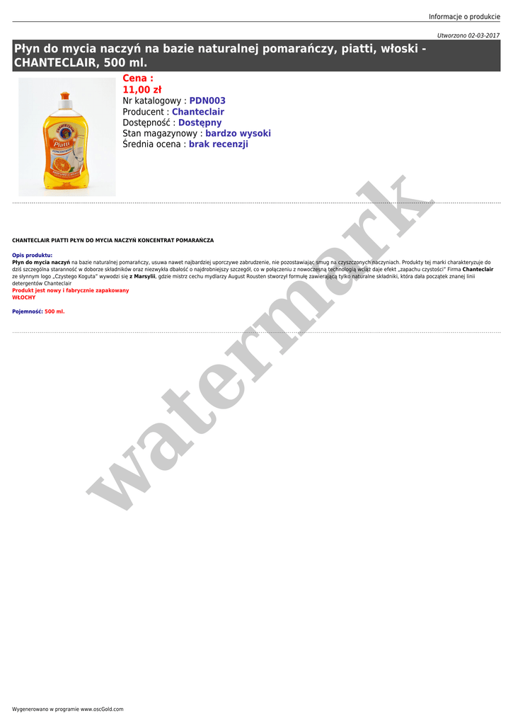 Informacje o produkcie Utworzono 02-03-2017 Płyn do mycia naczyń na bazie naturalnej pomarańczy, piatti, włoski CHANTECLAIR, 500 ml. Cena : 11,00 zł er m ar k Nr katalogowy : PDN003 Producent : Chanteclair Dostępność : Dostępny Stan magazynowy : bardzo wysoki Średnia ocena : brak recenzji CHANTECLAIR PIATTI PŁYN DO MYCIA NACZYŃ KONCENTRAT POMARAŃCZA Opis produktu: Płyn do mycia naczyń na bazie naturalnej pomarańczy, usuwa nawet najbardziej uporczywe zabrudzenie, nie pozostawiając smug na czyszczonych naczyniach. Produkty tej marki charakteryzuje do dziś szczególna staranność w doborze składników oraz niezwykła dbałość o najdrobniejszy szczegół, co w połączeniu z nowoczesną technologią wciąż daje efekt „zapachu czystości” Firma Chanteclair ze słynnym logo „Czystego Koguta” wywodzi się z Marsylii, gdzie mistrz cechu mydlarzy August Rousten stworzył formułę zawierającą tylko naturalne składniki, która dała początek znanej linii detergentów Chanteclair Produkt jest nowy i fabrycznie zapakowany WŁOCHY w at Pojemność: 500 ml. Wygenerowano w programie www.oscGold.com